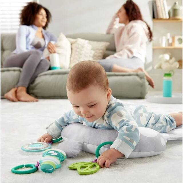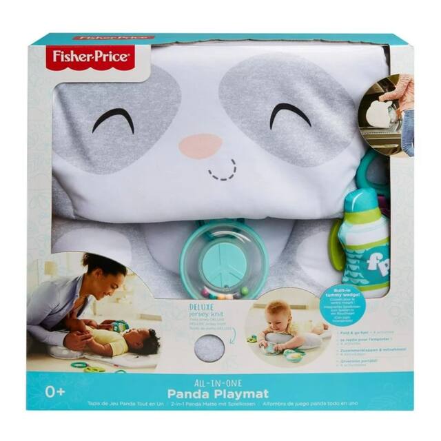 The Fisher-Price® All-in-One Panda Baby Tummy Time Mat provides an engaging spot for comfortable tummy-time play at home or while travelling. The plush, contoured mat has a built-in wedge to support your little one as they play during tummy time. It includes four exciting activities: a peace sign baby rattle, a leaf-shaped teething toy, a crinkly "water bottle" toy, and a jingle sound in the panda's tail. When you're headed out, the playmat folds up with a convenient handle. As your baby pushes up during tummy time, their neck and core muscles strengthen. The panda's soft fabrics, crinkle and rattle sounds, and chewy teether engage in the development of tactile and auditory senses.