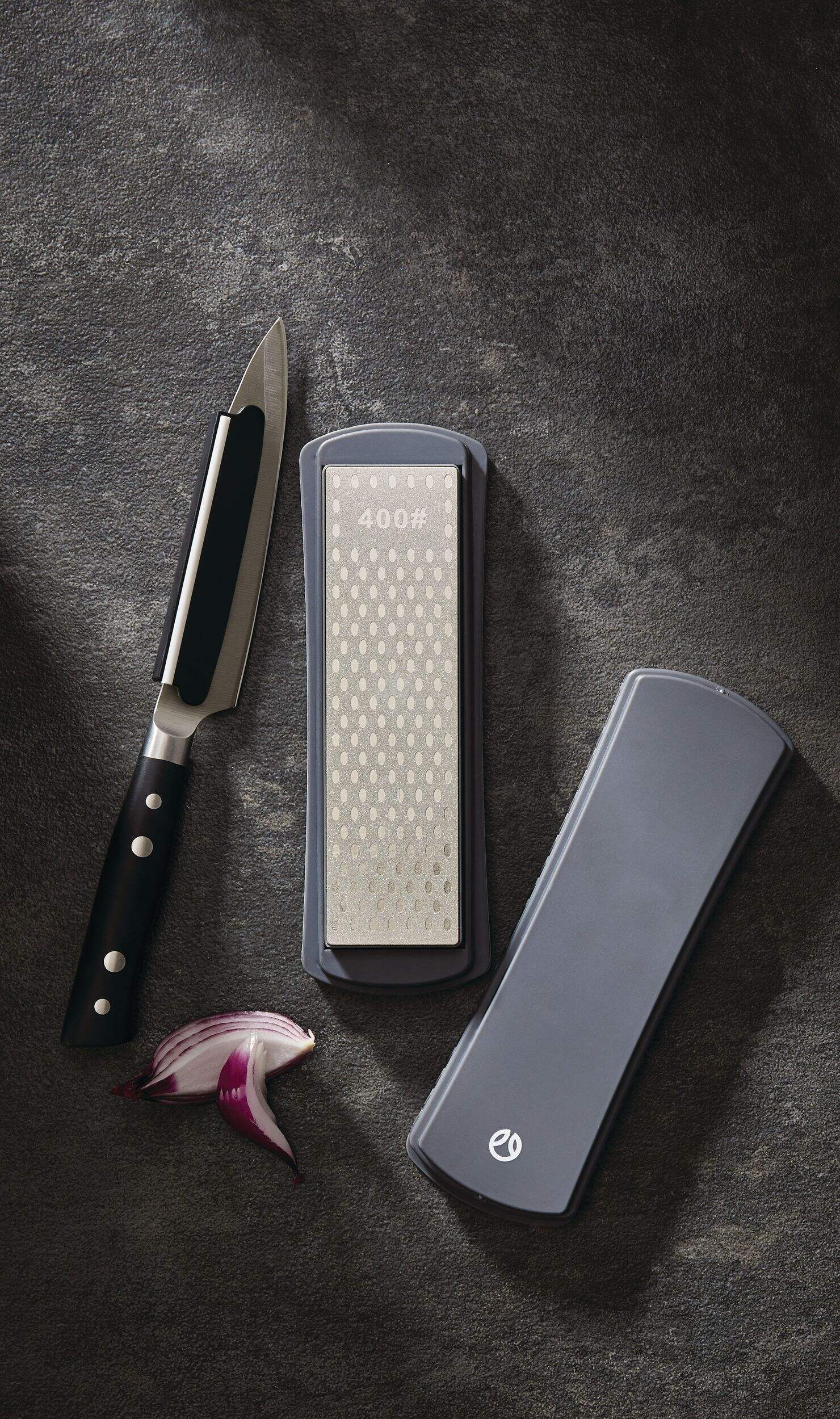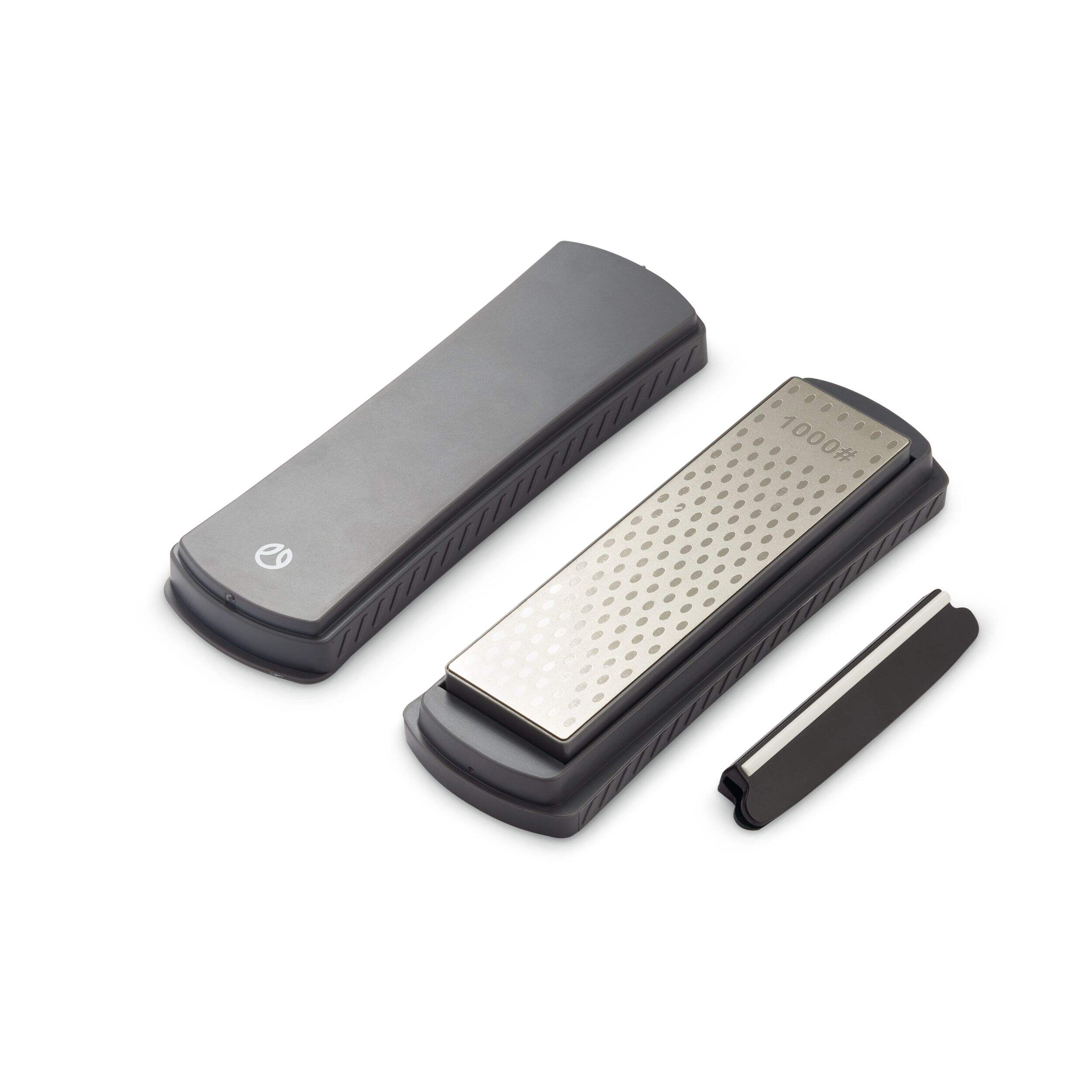 The PADERNO 2-Sided Sharp Stone is the perfect tool to maintain your kitchen knives. It features a dual-sided design to handle every sharpening need: the coarse side quickly reshapes dull blades, while the fine side polishes them to a razor-sharp edge. The diamond-infused surface ensures efficient material removal, creating a smooth, sharp edge. For added convenience and safety, the stone comes with a protective cover that doubles as a handle, allowing for greater control during use.
