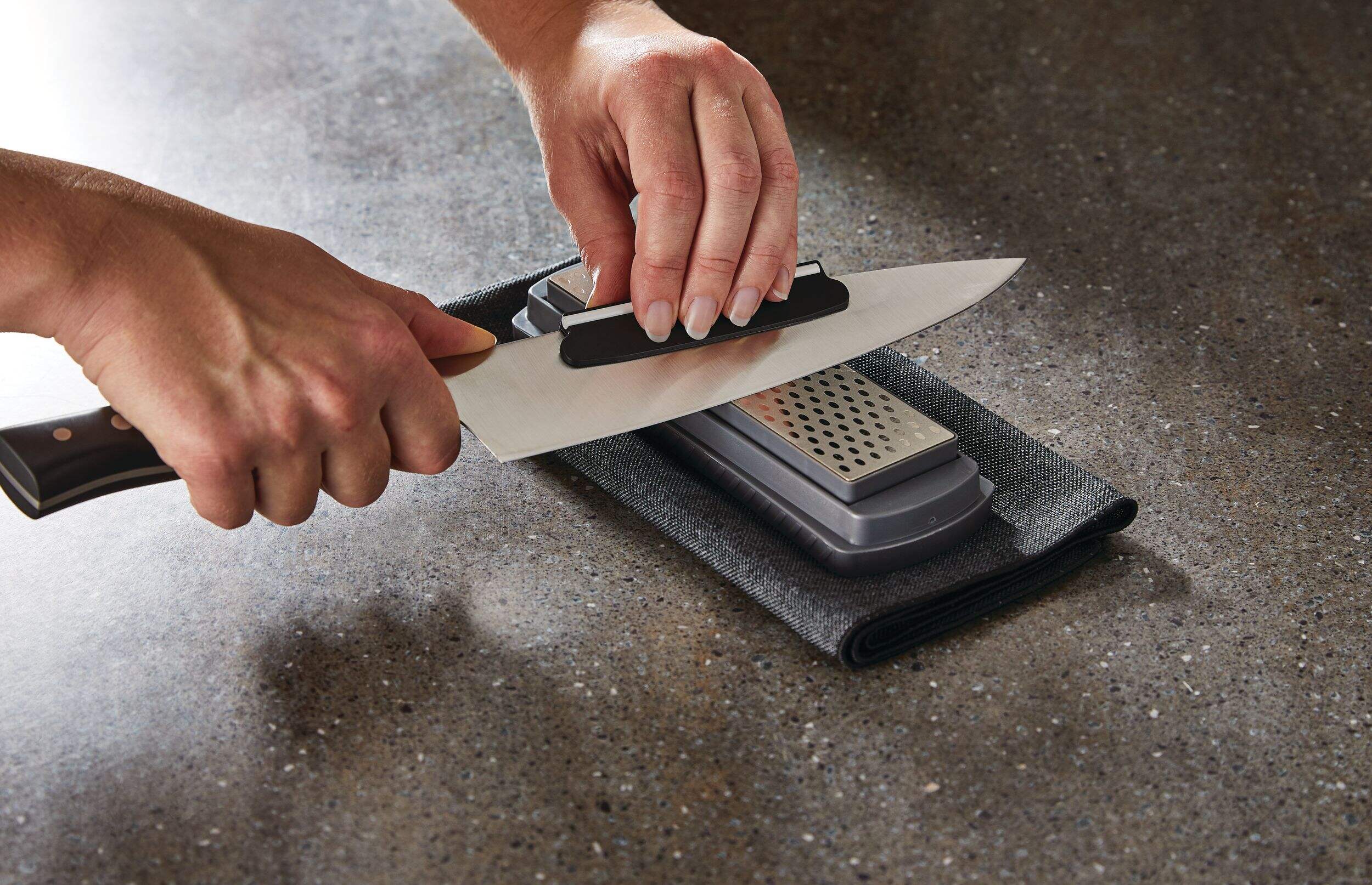 Angle guide helps to maintain a consistent edge during freehand sharpening