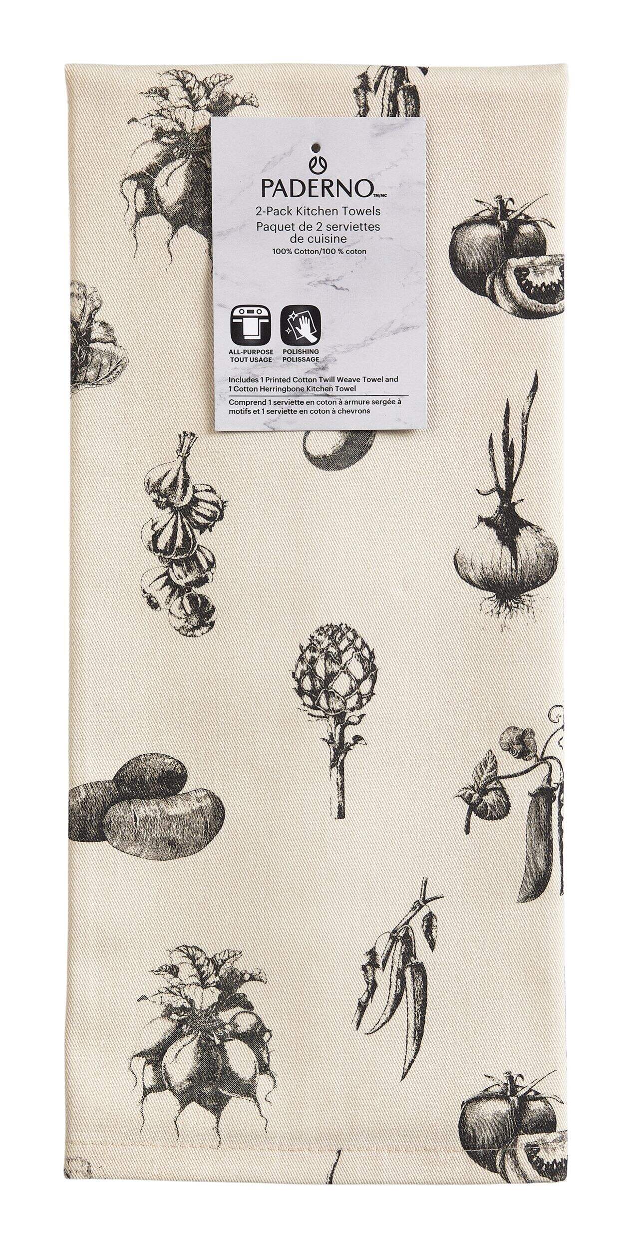The PADERNO All-Purpose Cotton Kitchen Towels, Grey, 2-pk, are here to tackle your messiest kitchen jobs. The exceptional absorption means they easily soak up the toughest spills, while the convenient hanging loop helps keep them organized and ready for the next spill. Machine washable for simple cleaning, they remain absorbent through washes and dryer cycles. The durable cotton towels measure 18 x 28 inches, providing plenty of space to wipe away spills and mess. The 2-pack includes one twill weave towel and one herringbone pattern towel, both in a practical grey colour.