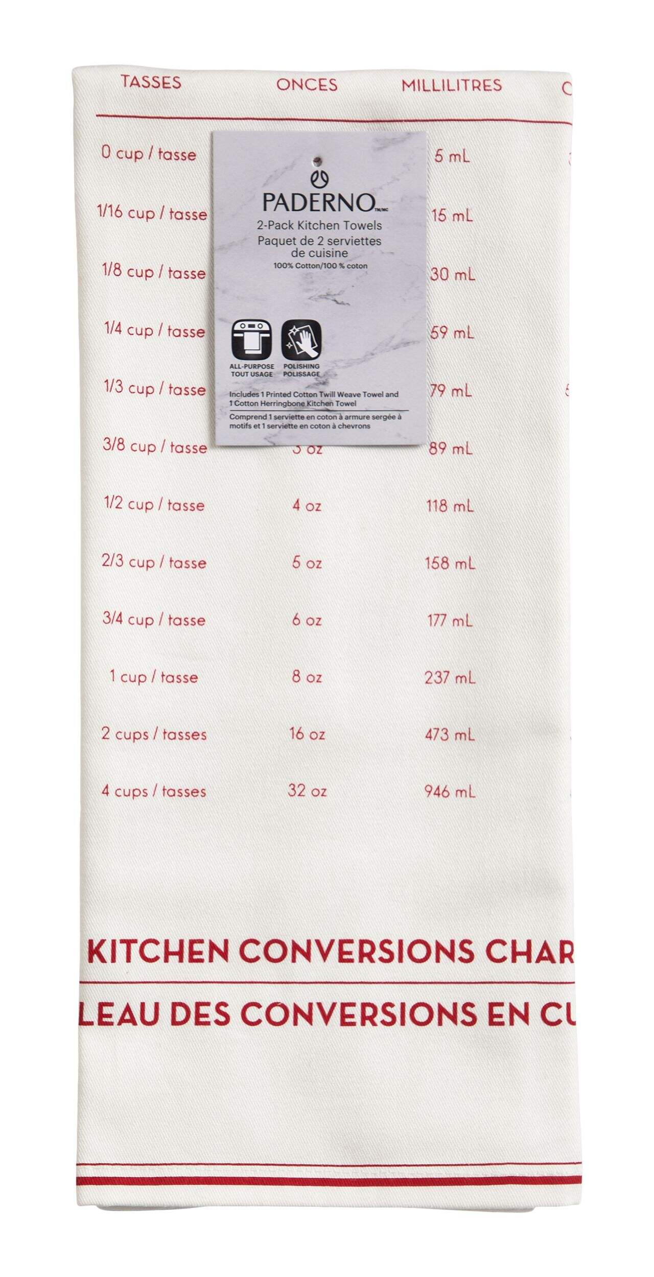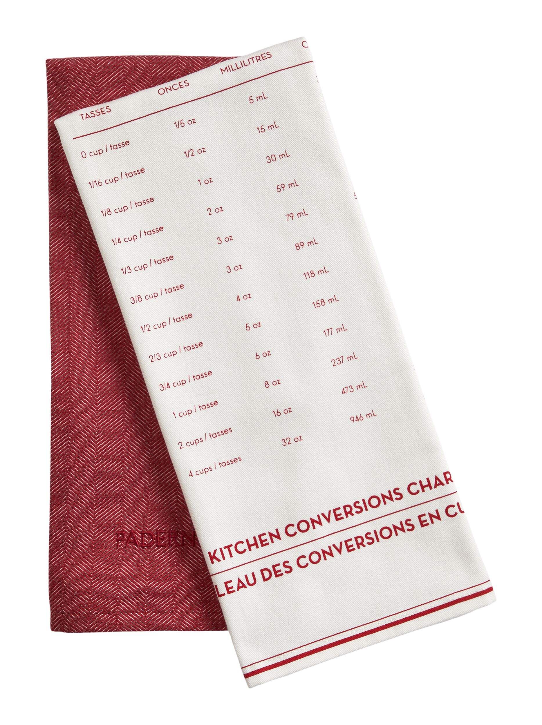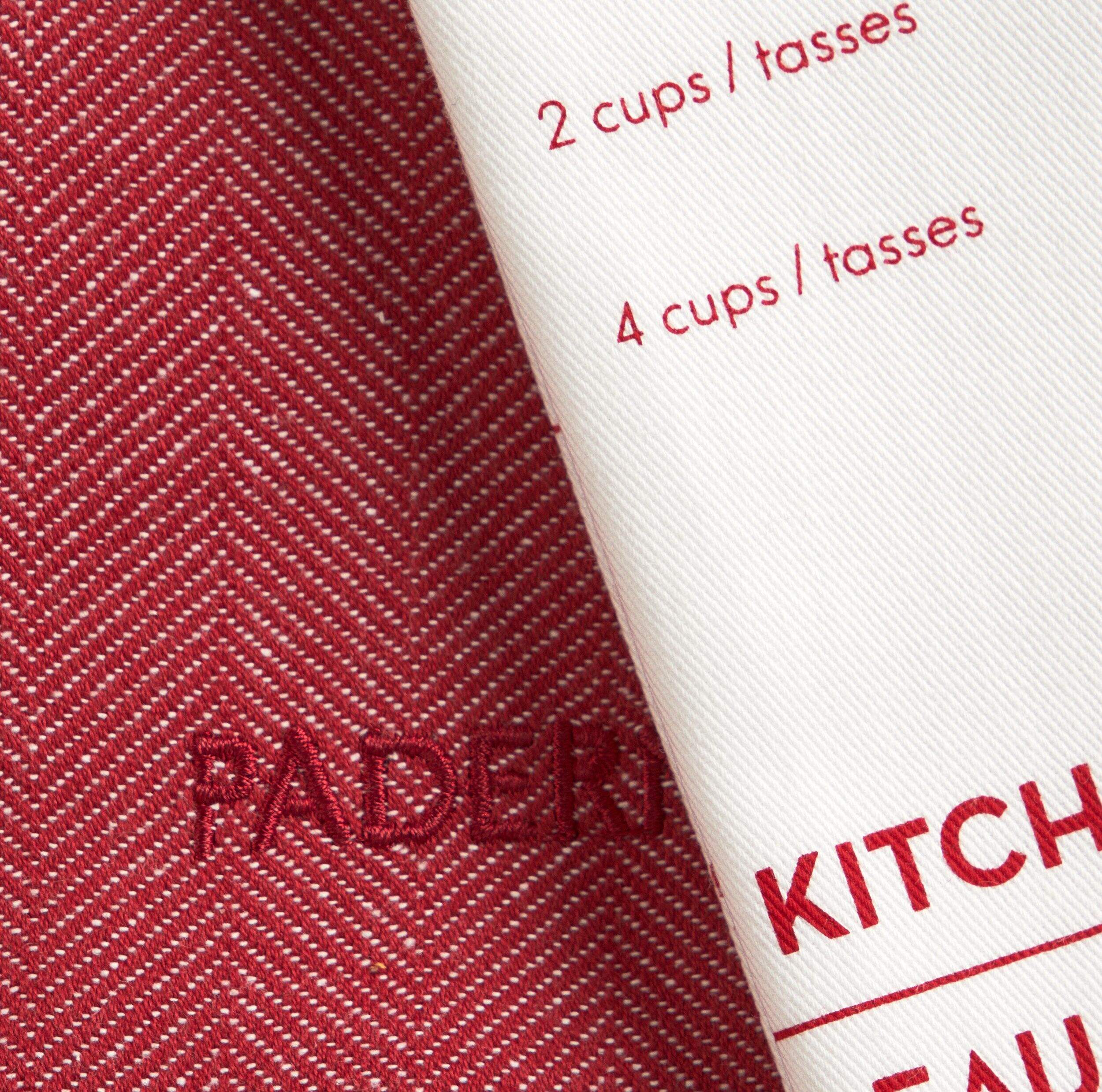 The PADERNO All-Purpose Cotton Kitchen Towels, Red, 2-pk, provide exceptional absorption for quick cleanup of spills and messes. This 2-pack includes one twill towel and a herringbone towel in classic red. Both 18 x 28-inch cotton towels feature convenient hanging loops for tidy storage. Simply toss them in the washing machine when dirty and tumble dry on low. With their supreme absorbency and easy care, these versatile PADERNO towels make an indispensable addition to any kitchen.