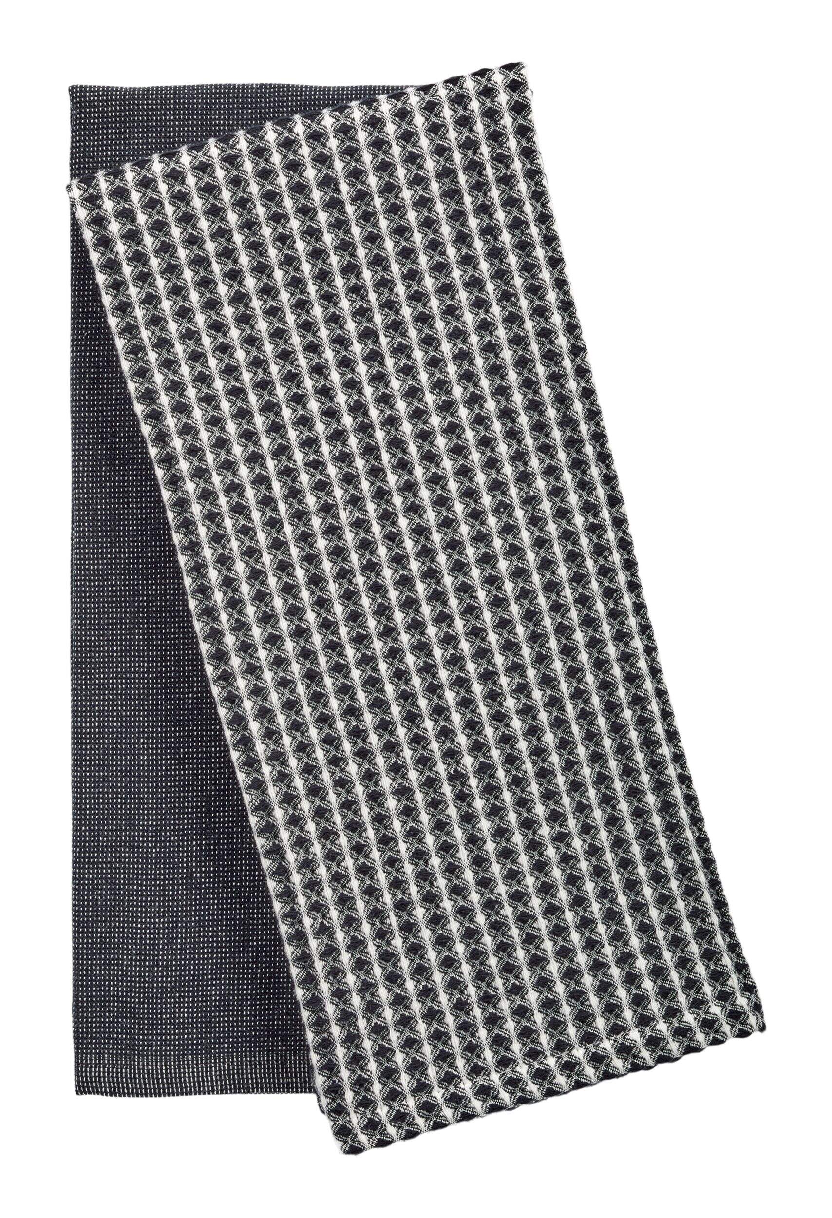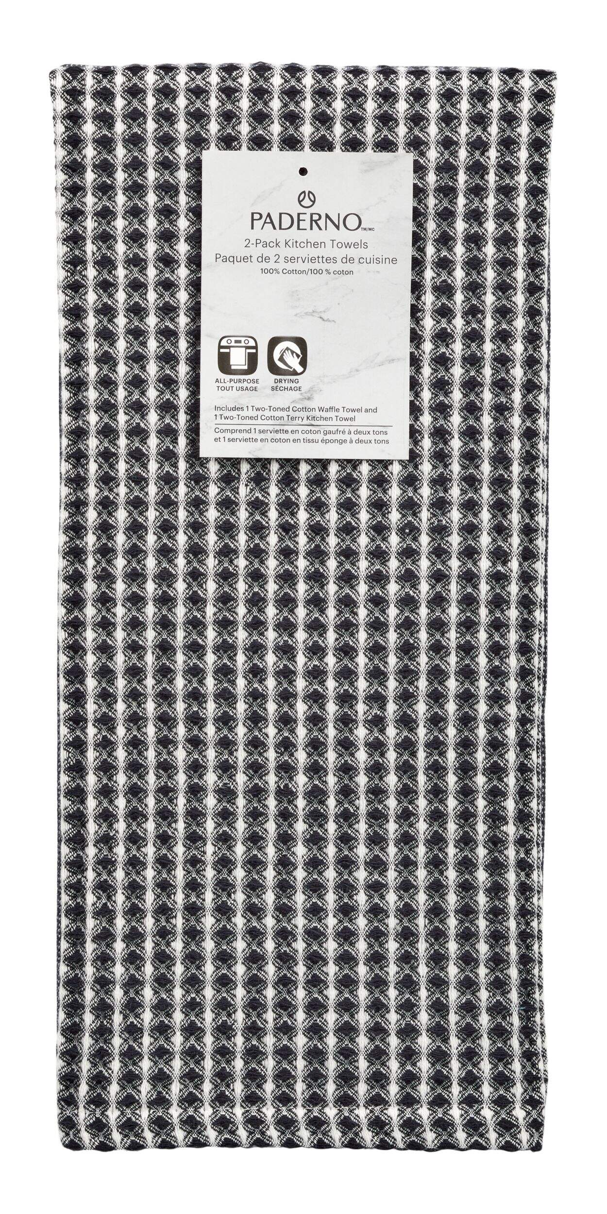 The PADERNO All-Purpose Two-Tone Cotton Kitchen Towels in black come in a convenient 2-pack, making it easy to manage spills and messes. This set includes one waffle weave towel and one terry cloth towel, both equipped with a handy hanging loop for organized storage. Made from cotton, these towels are machine washable for repeated use. Featuring a stylish two-tone black design, this towel set perfectly combines form and function to tackle all your kitchen tasks.