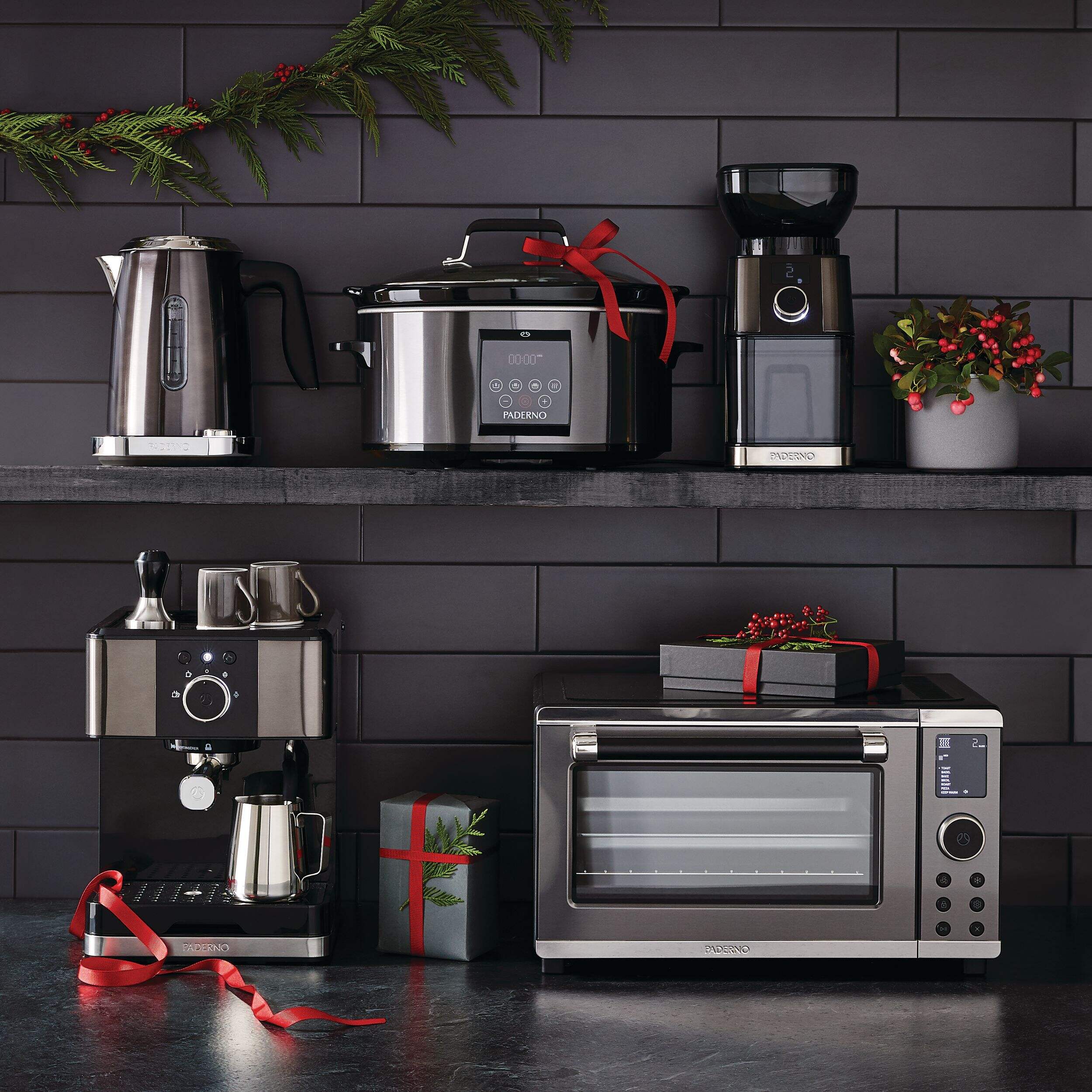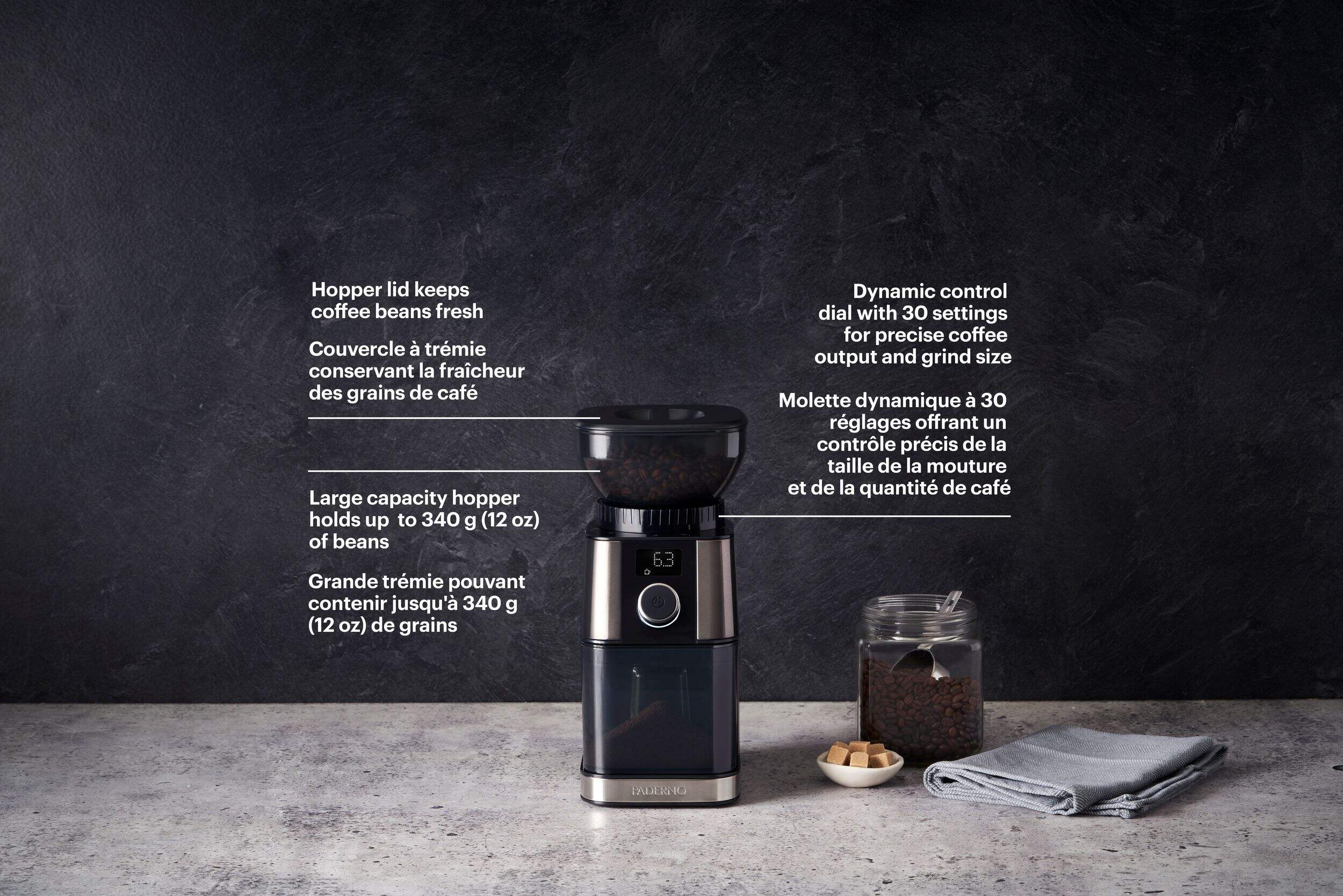 Nothing tastes better than freshly ground coffee, and with the PADERNO Stainless Steel Burr Grinder, you can enjoy it every morning. This burr grinder for coffee allows you to get the perfect grind every time, with 30 settings ranging from coarse to extra fine to accommodate a variety of uses. The coffee bean grinder features a secret-until-lit digital display combined with a dynamic control dial that lets you choose your grind setting with extreme precision. You can easily auto grind enough grounds to make 12 cups of coffee with micro-adjust grind time in increments of 0.1 seconds, so you get the most precise coffee output. The grinder comes with a cleaning tool for easy cleanup, cord space in the bottom of the machine for easy storage, and a sealable storage container that lets you save extra grounds for another day. This burr grinder has an extra large hopper that holds up to 12 oz (340g) of beans. Durable stainless steel conical burrs are capable of uniformly crushing beans, giving them a more consistent flavour throughout for an ideal brew every time. This machine was designed in Canada.