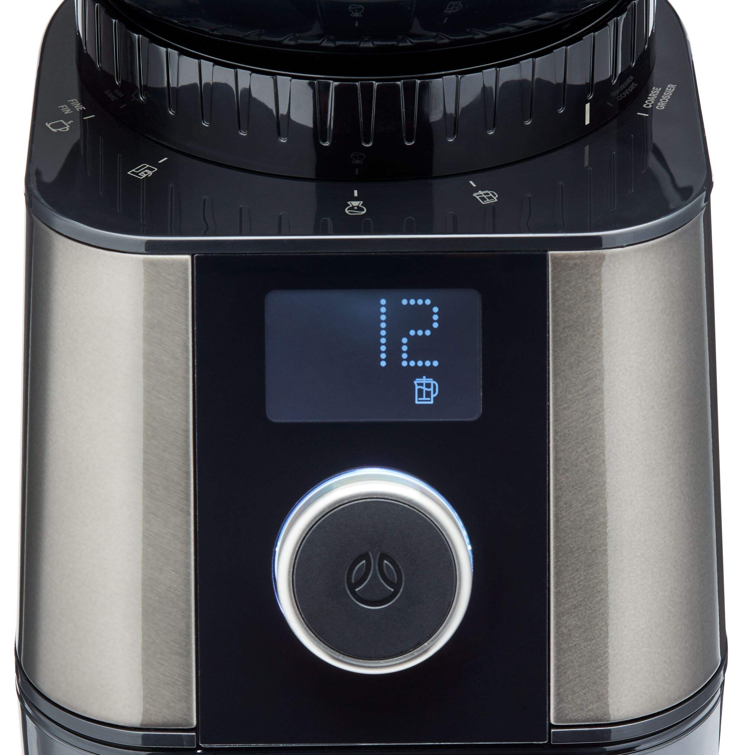 Features auto grinding for up to 12 cups of coffee grinds with micro adjust grind time in increments of 0.1 seconds for precise coffee output