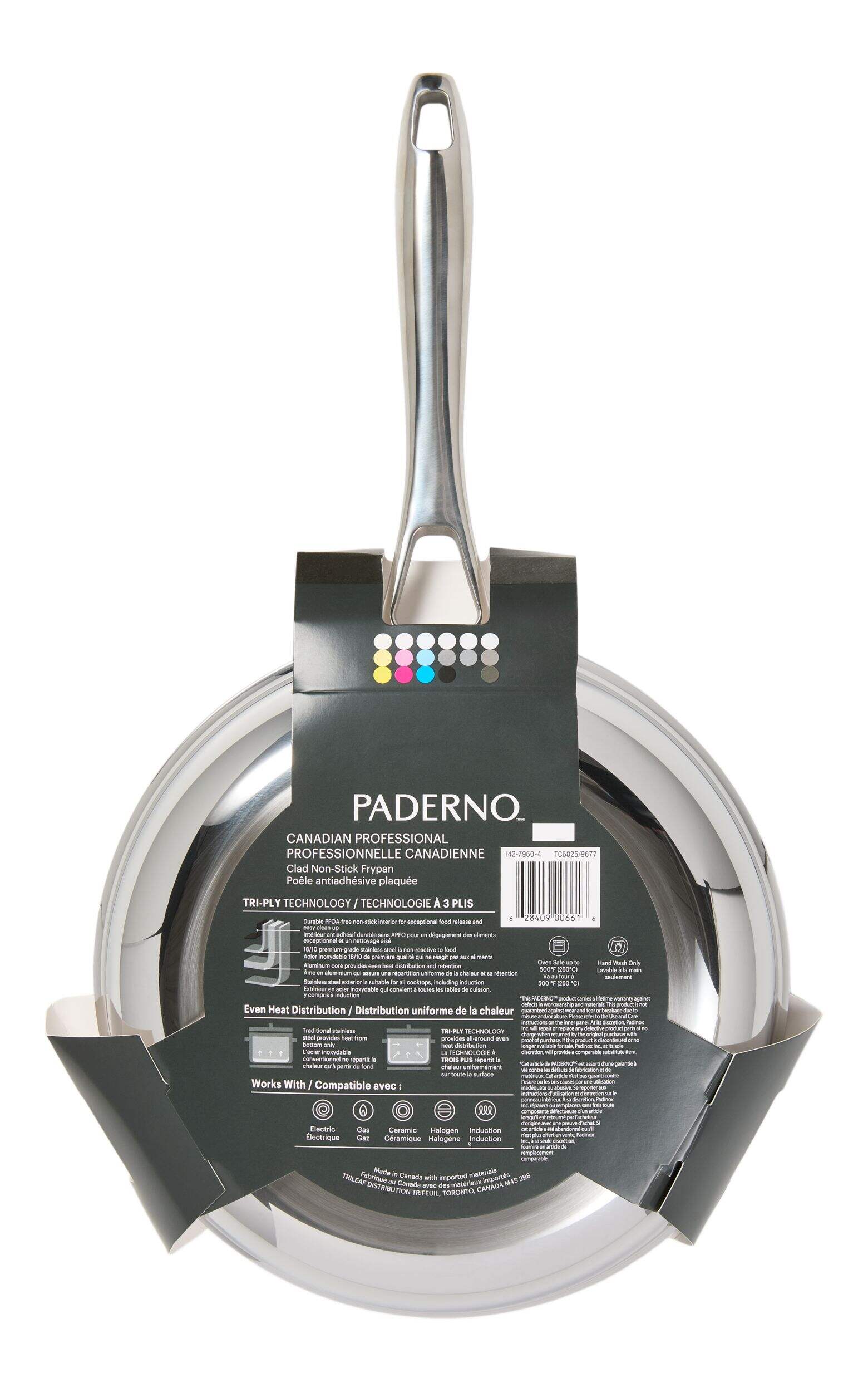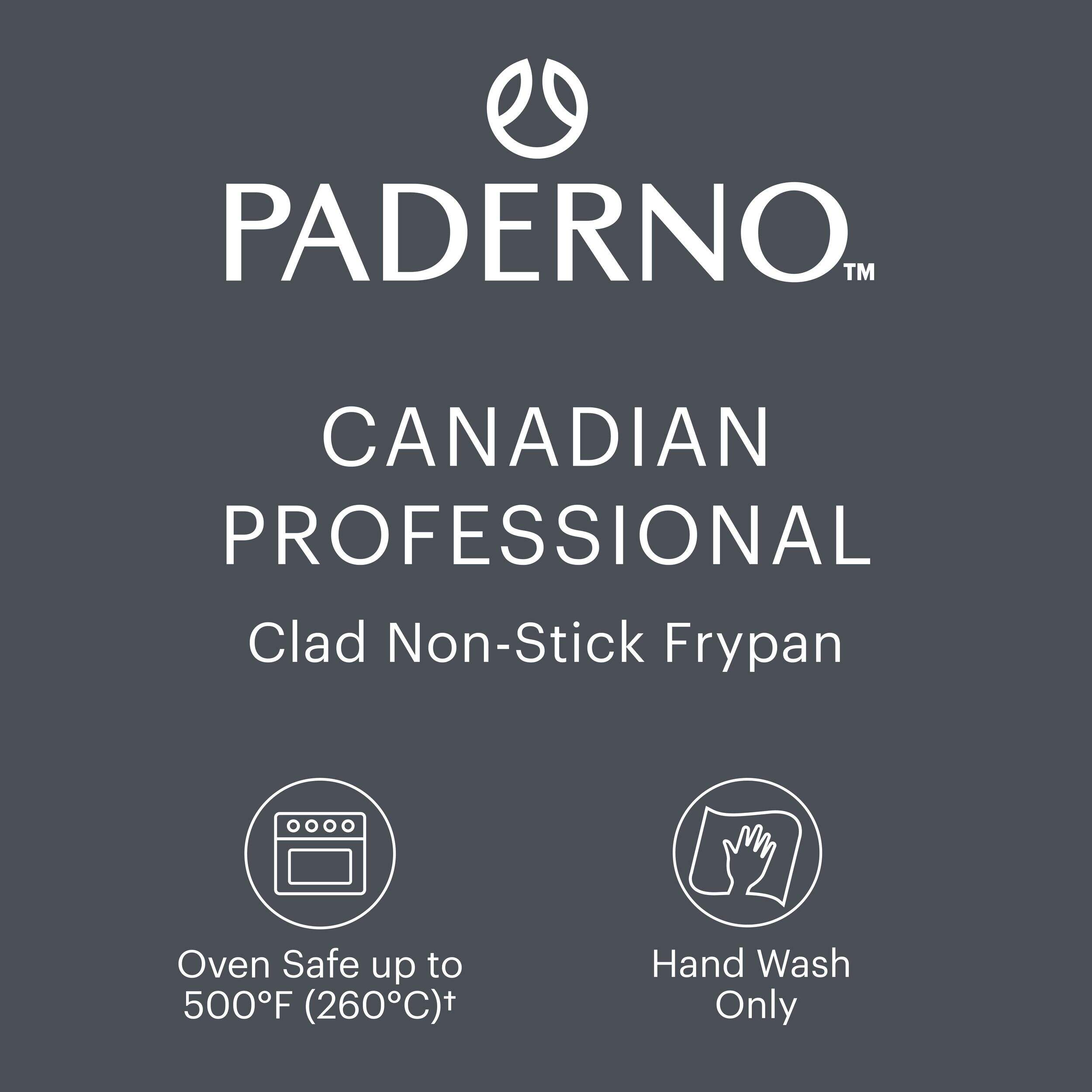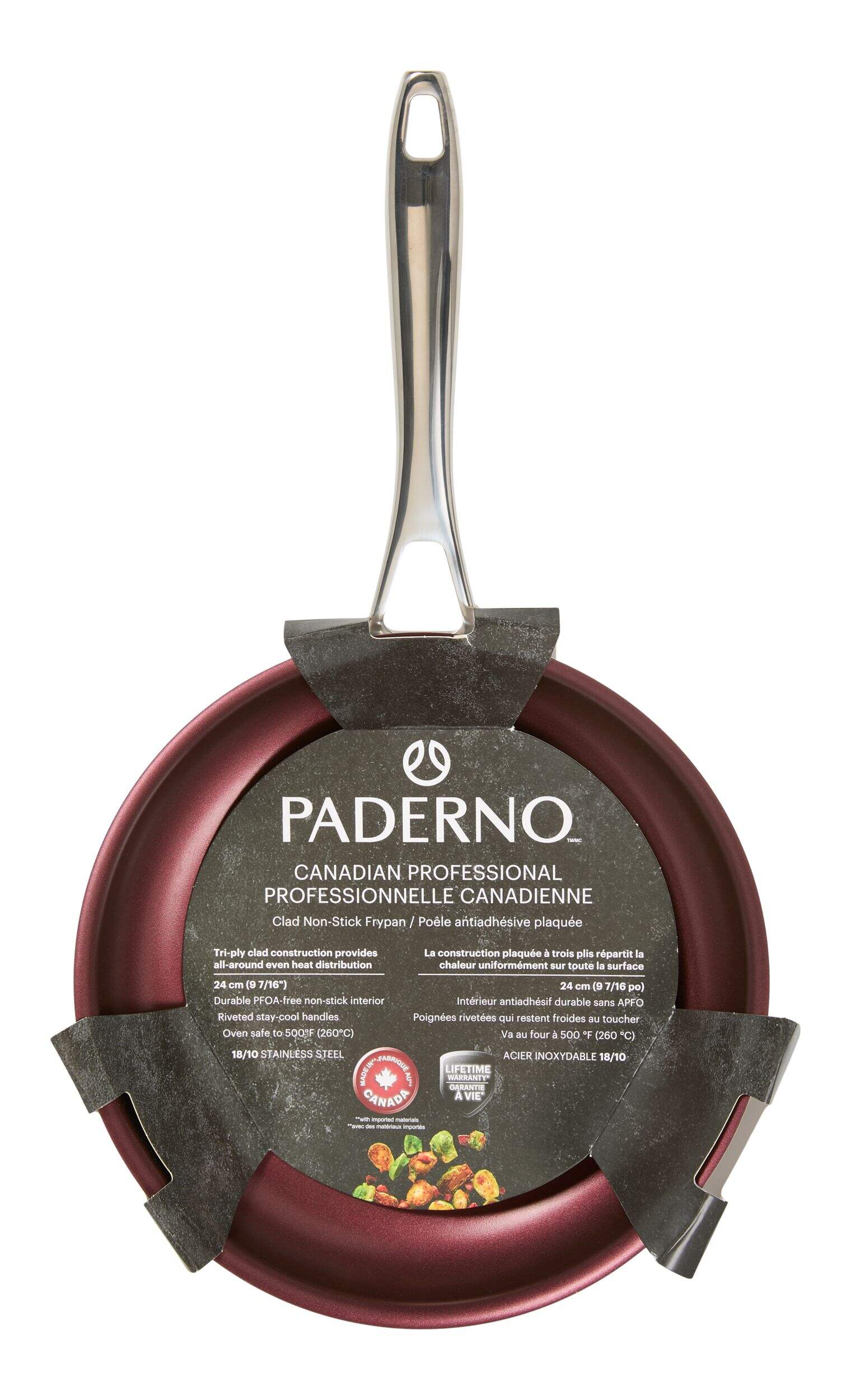 The PADERNO Clad Non-Stick Frying Pan features a bright burgundy exterior that will beautify any kitchen. Its stainless steel construction provides lasting durability for years of use. The non-stick interior allows you to cook in style, with foods effortlessly sliding off the surface during cooking and cleanup. Available in assorted sizes to suit your needs, this frying pan is ideal for sautéing, frying eggs, preparing crepes and more.