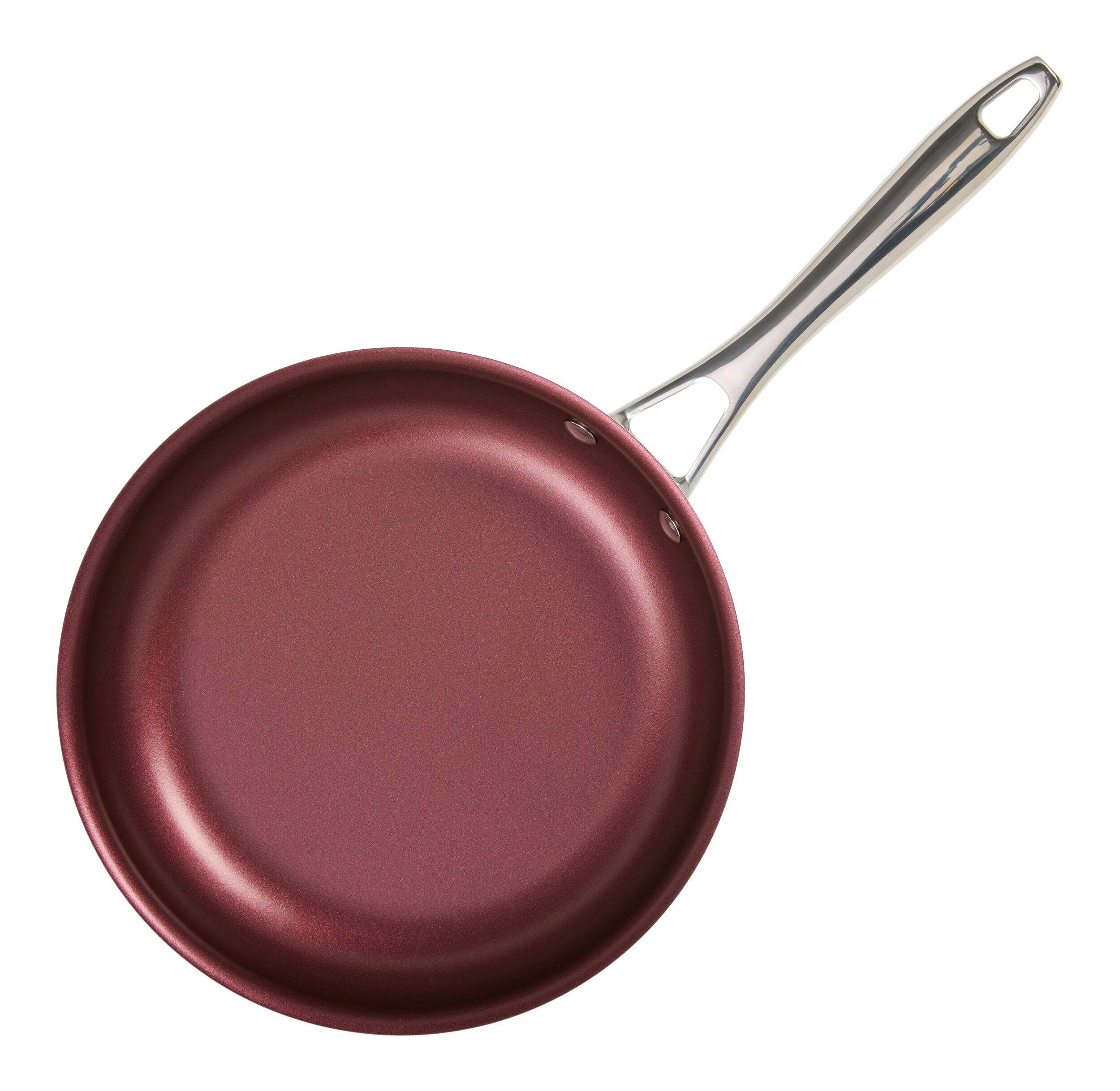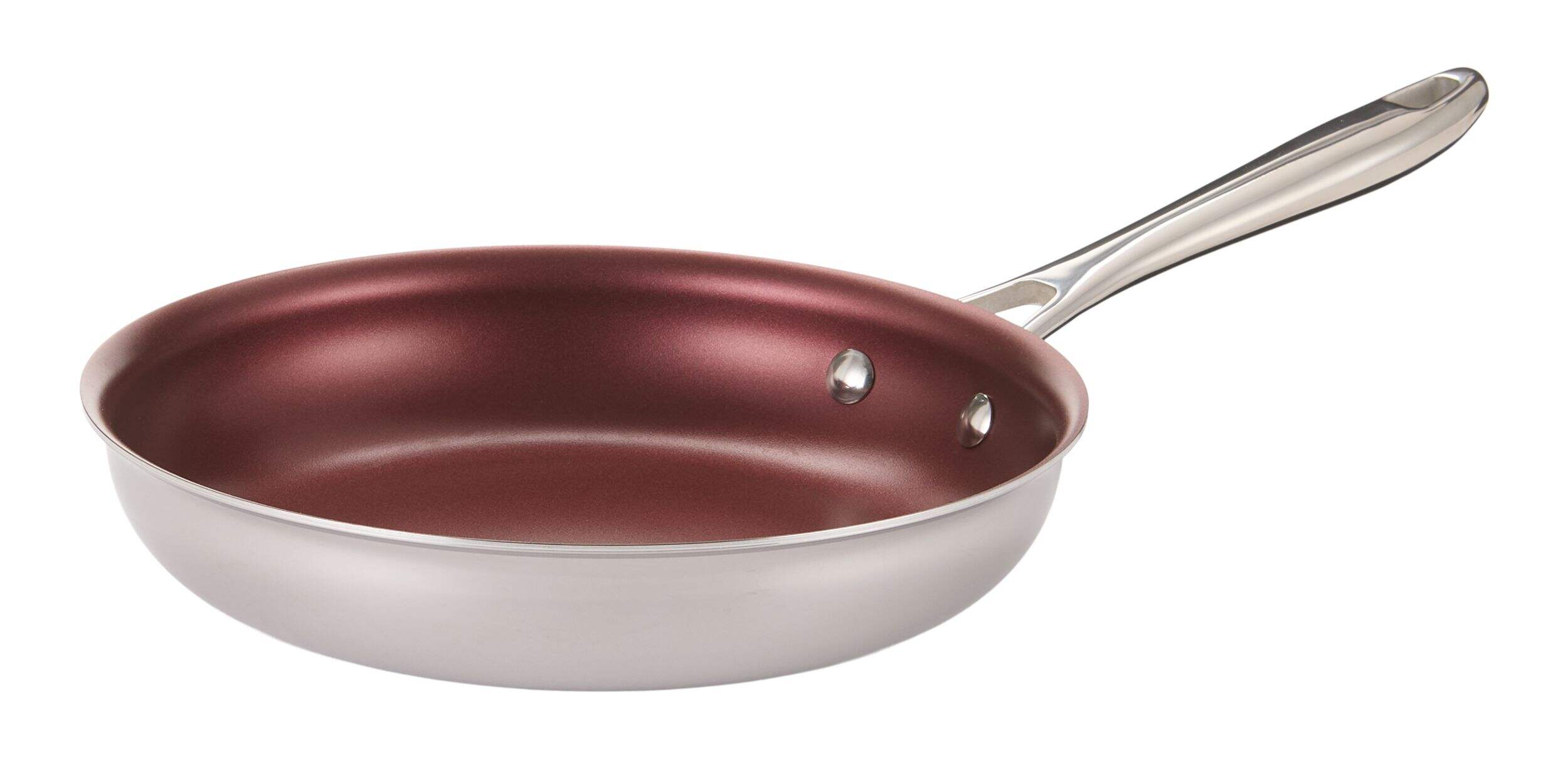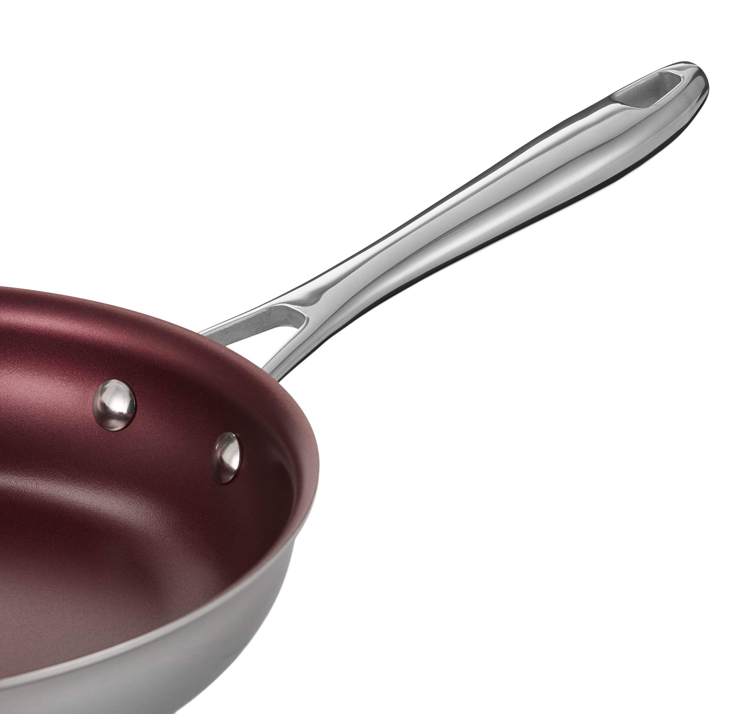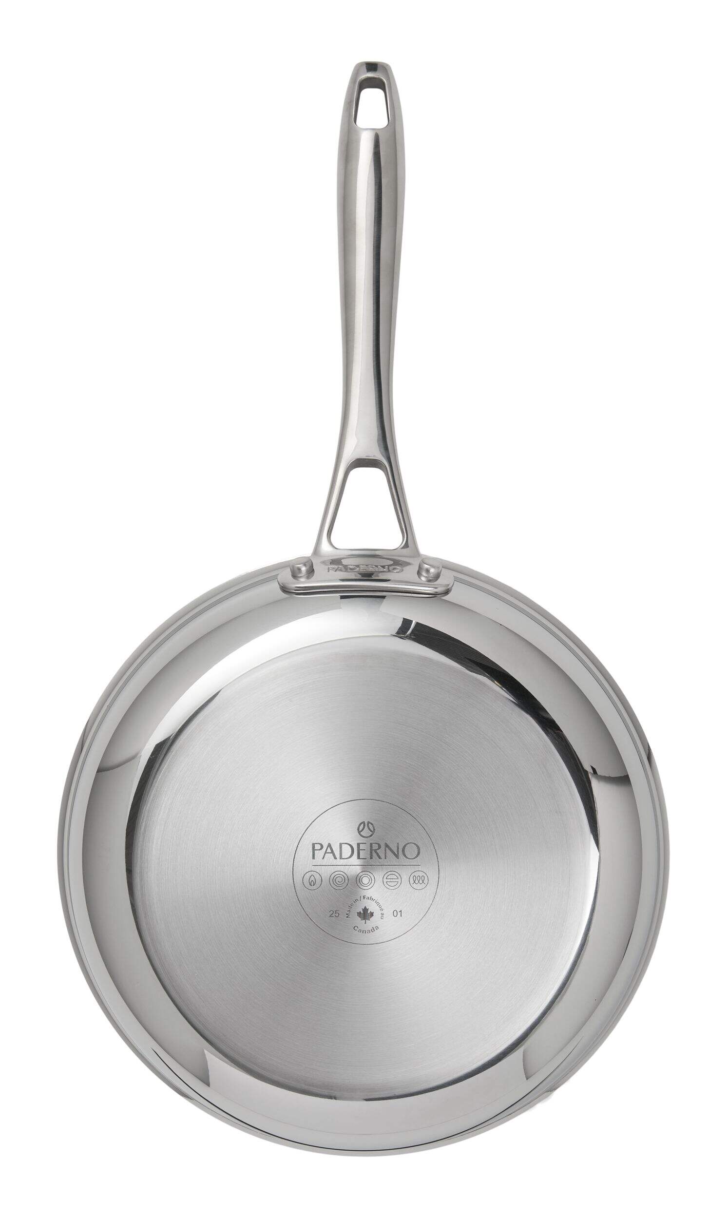 The PADERNO Clad Non-Stick Frying Pan features a bright burgundy exterior that will beautify any kitchen. Its stainless steel construction provides lasting durability for years of use. The non-stick interior allows you to cook in style, with foods effortlessly sliding off the surface during cooking and cleanup. Available in assorted sizes to suit your needs, this frying pan is ideal for sautéing, frying eggs, preparing crepes and more.