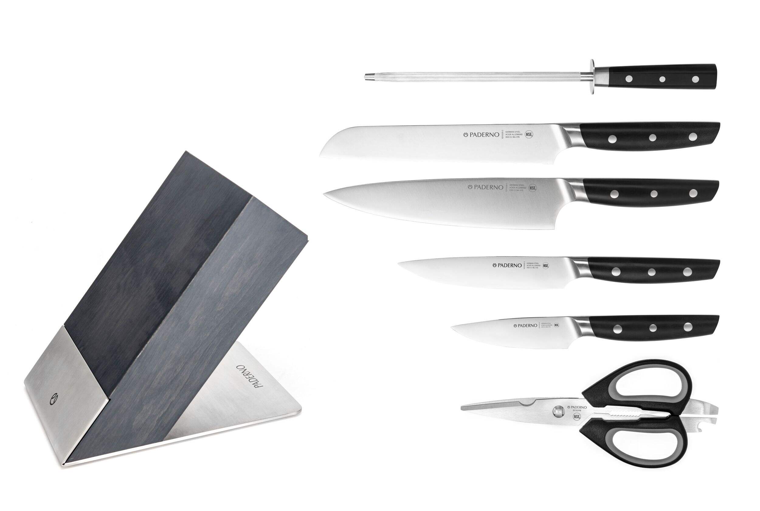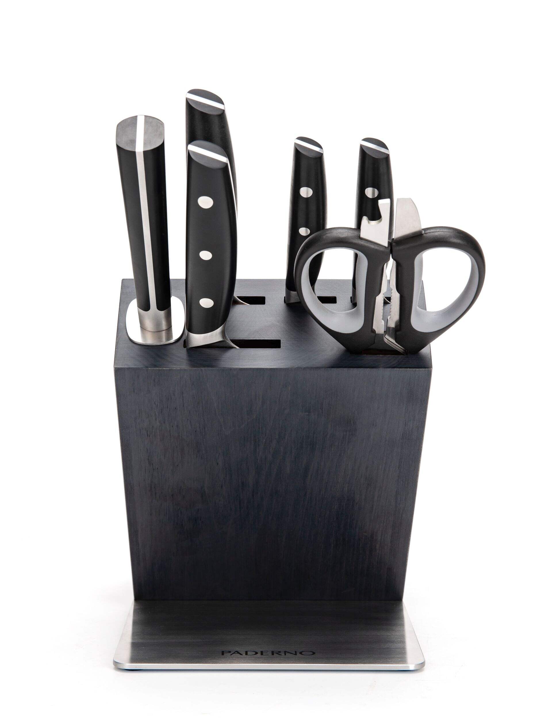 Elevate your culinary experience with the Paderno Fully Forged Stainless Steel Knife Block Set. This 7-piece knife set features precision-crafted blades and a classic knife design, ensuring both functionality and style in your kitchen. The set includes essential kitchen knives and kitchen shears, all housed in a beautiful maple wood knife block for convenient storage.