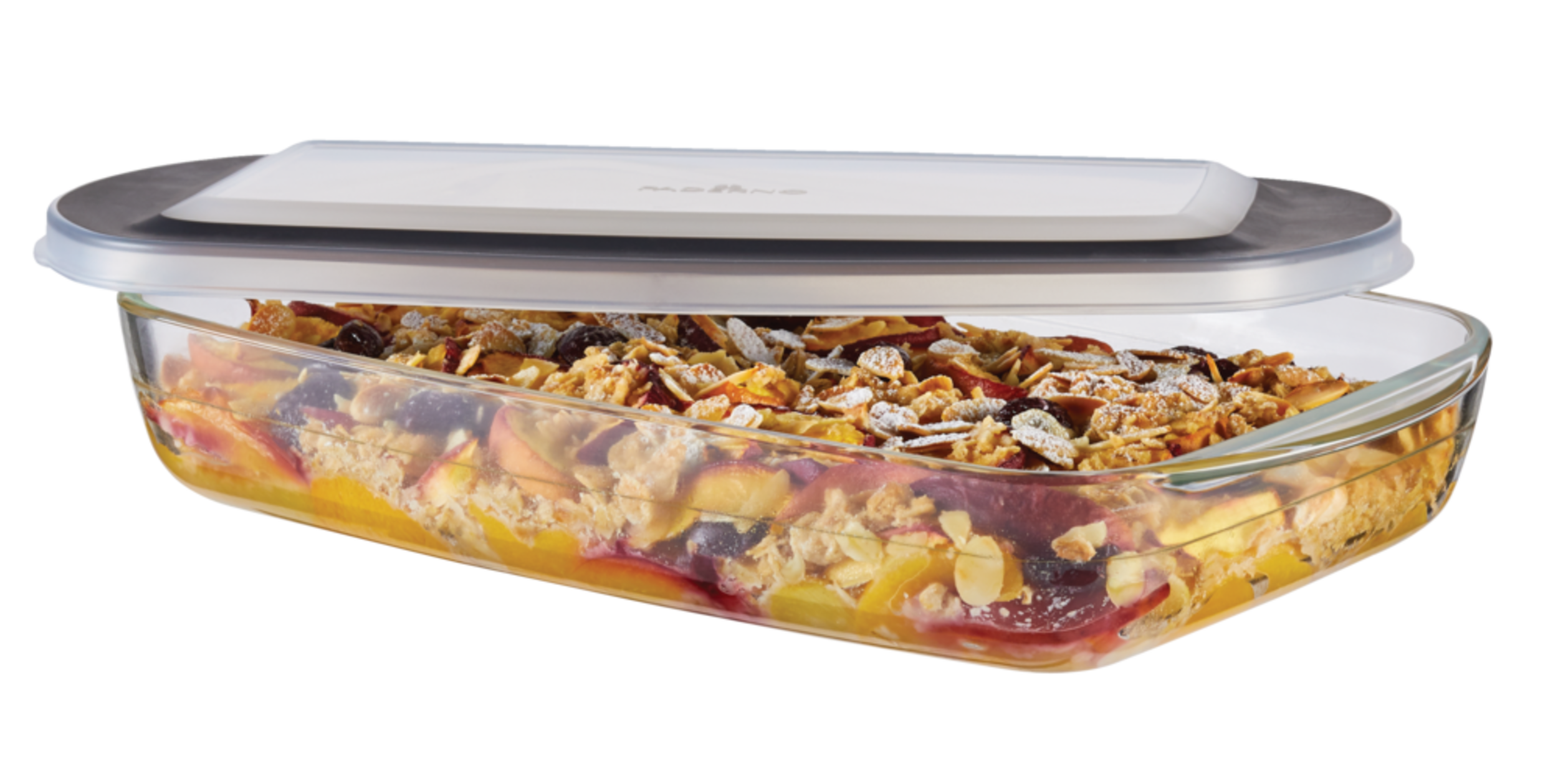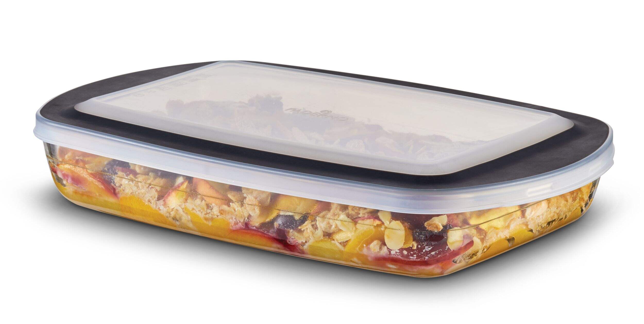 Glass dish is safe for use in the microwave, dishwasher, freezer and oven. Lid is safe for freezer, microwave, top-rack dishwasher