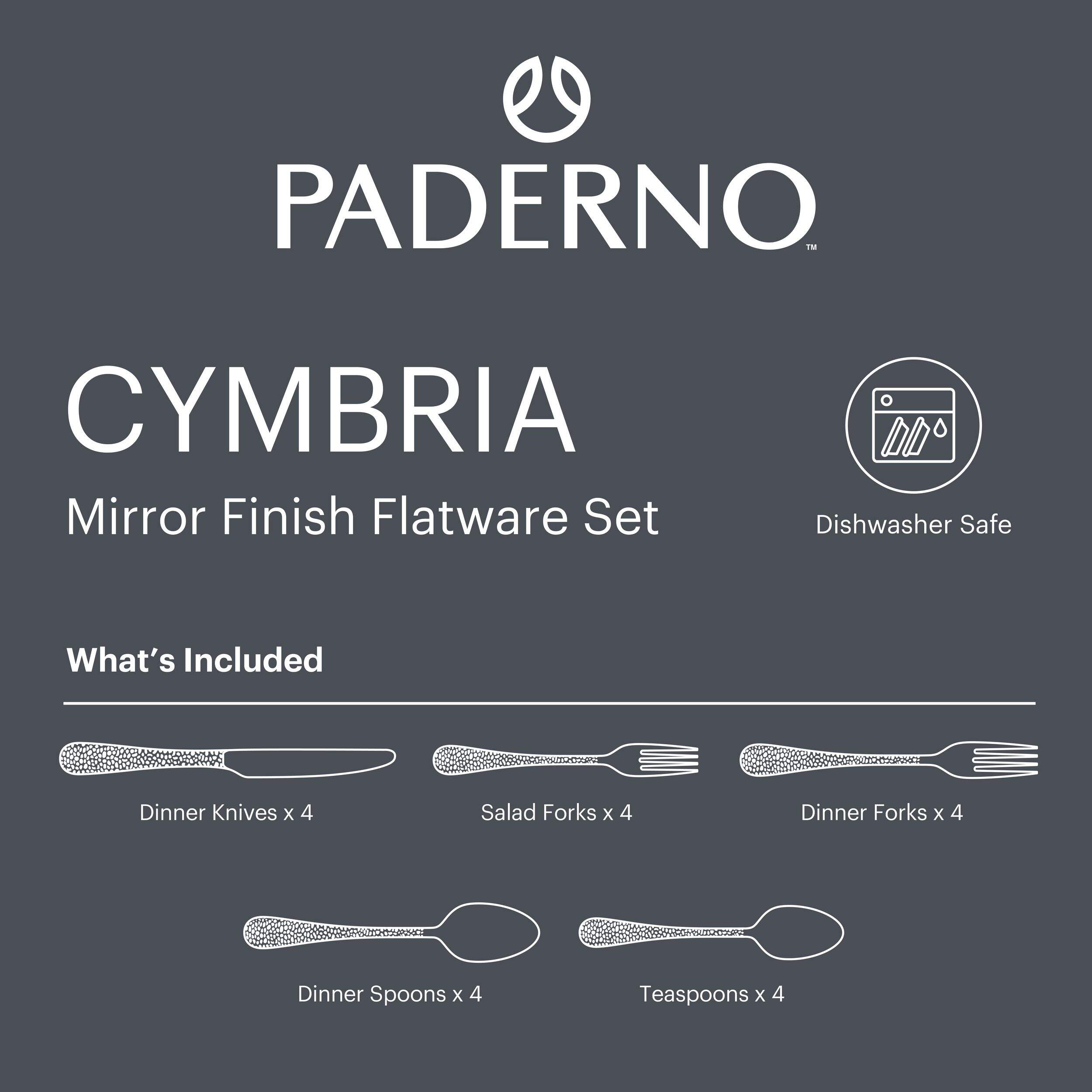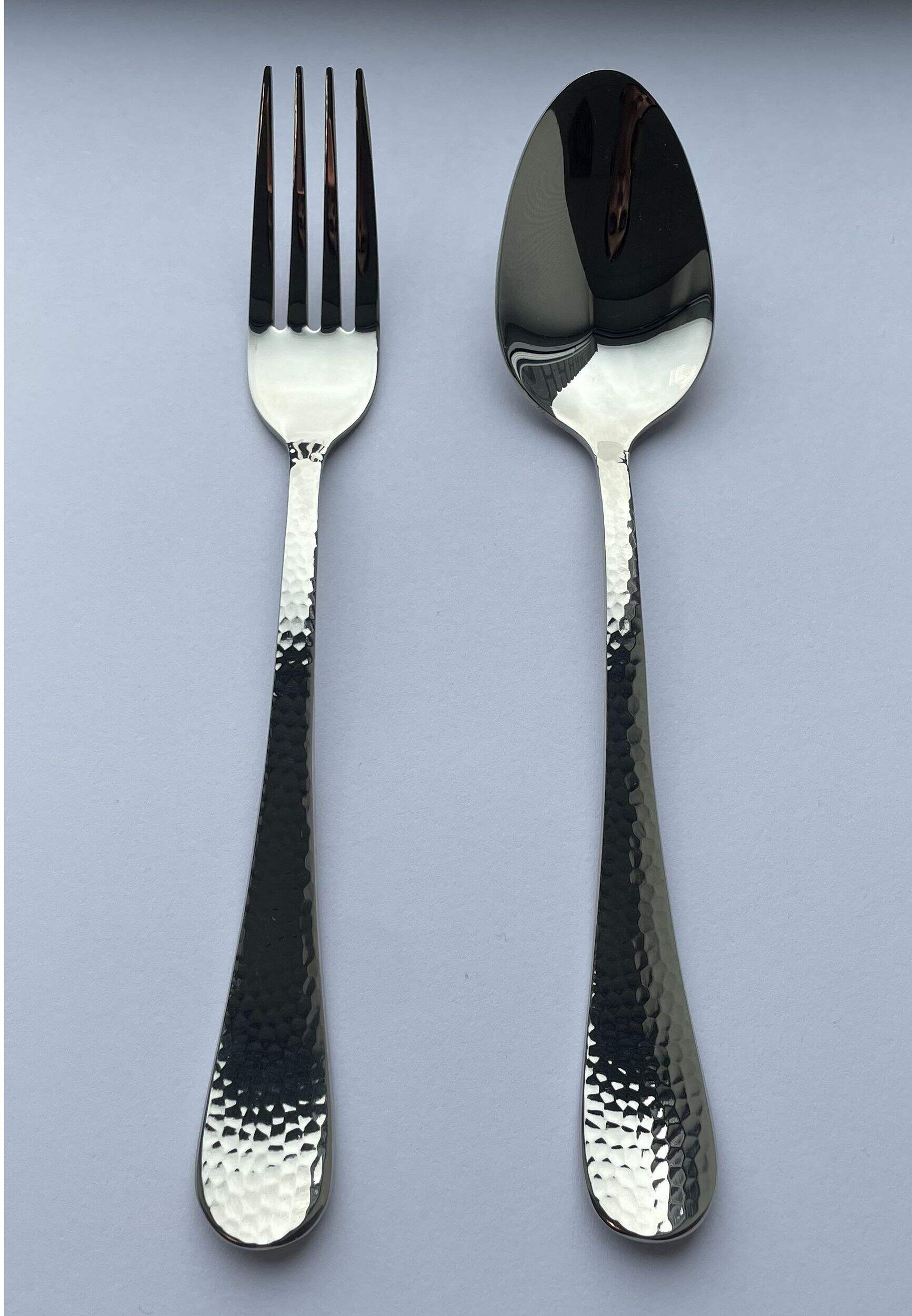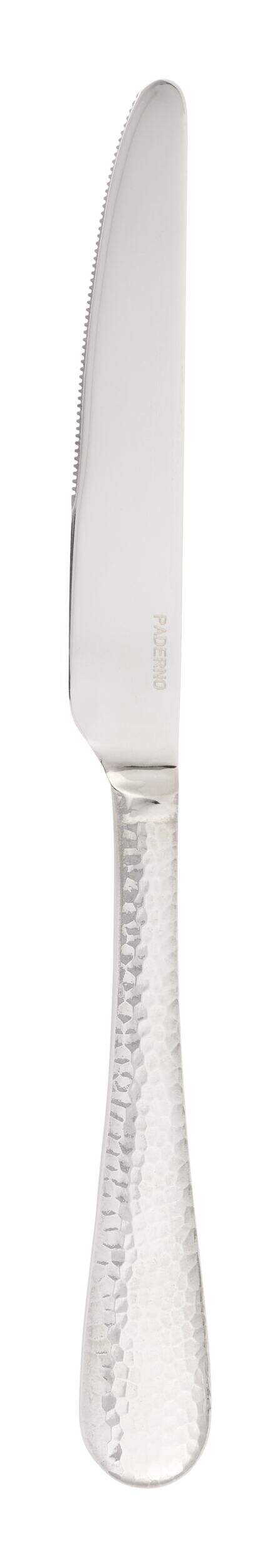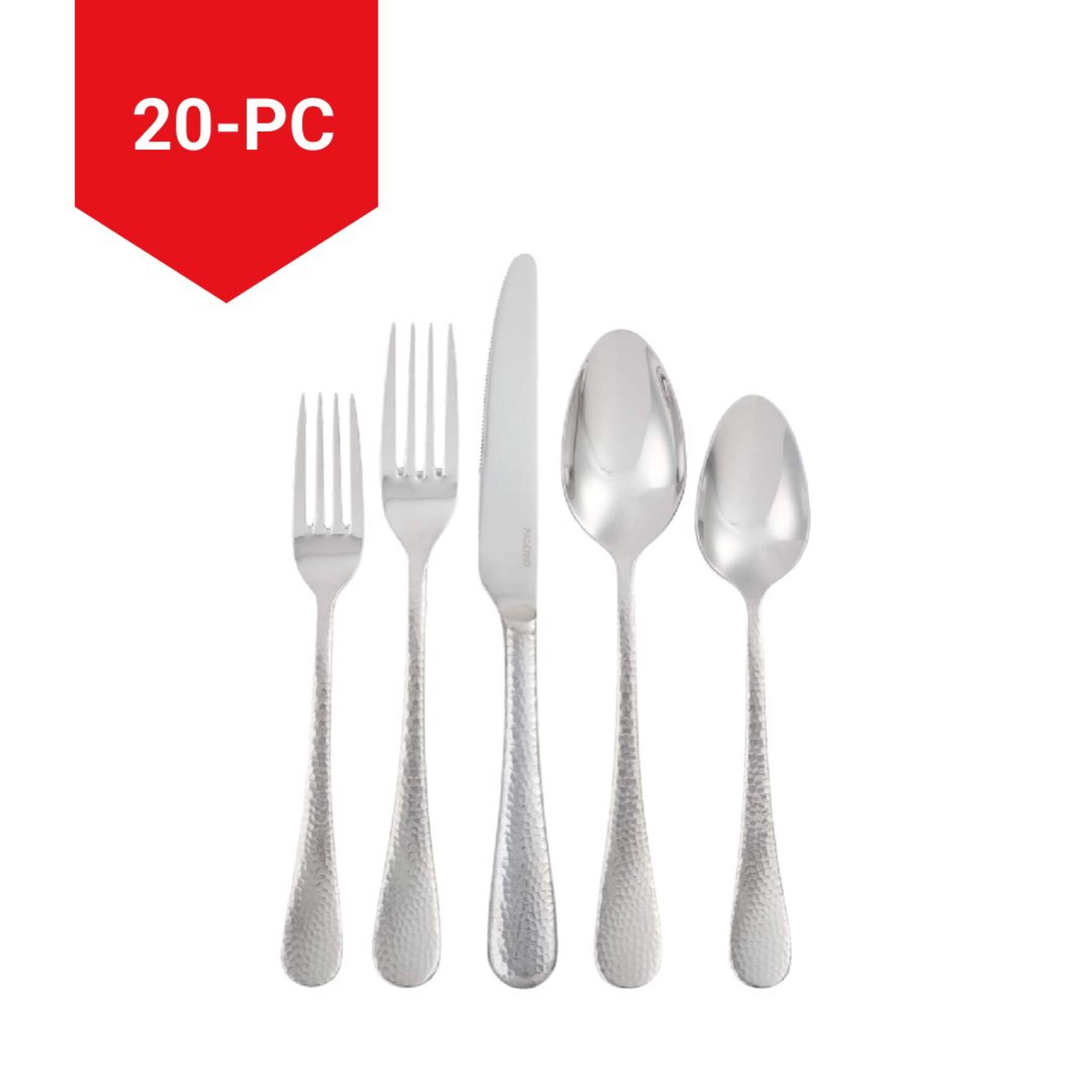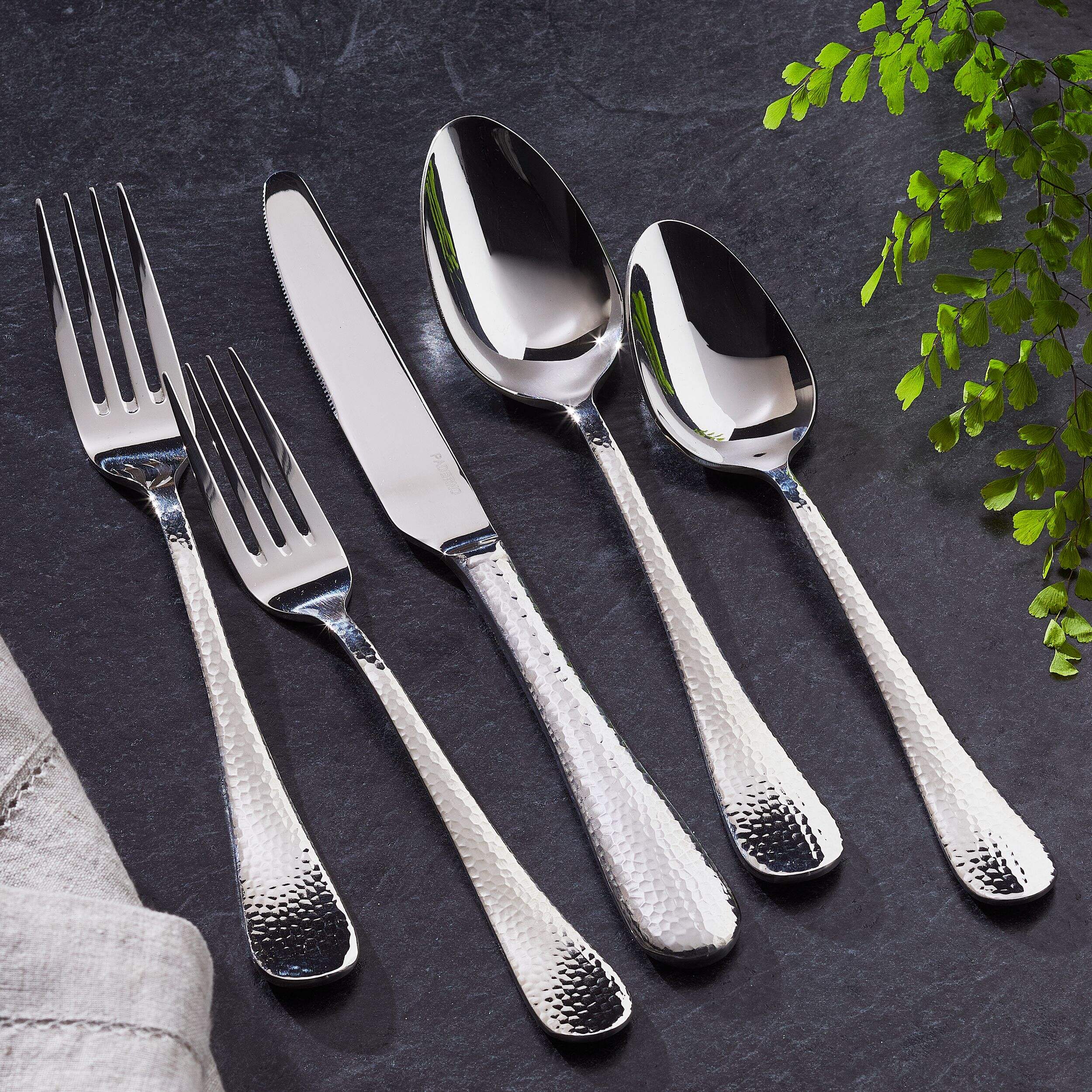 The PADERNO Hammered Flatware Set is a stylish and sophisticated addition to any dining table. This 20-piece set serves up to four people and includes dinner forks, dinner knives, dinner spoons, salad forks, and teaspoons. Crafted from high-quality steel, each piece features a beautiful hammered finish that adds a touch of elegance to your meals. The durable construction ensures long-lasting use, while the modern design complements any table setting. Perfect for both everyday use and special occasions, this flatware set combines functionality and style, making it a must-have for your kitchen.