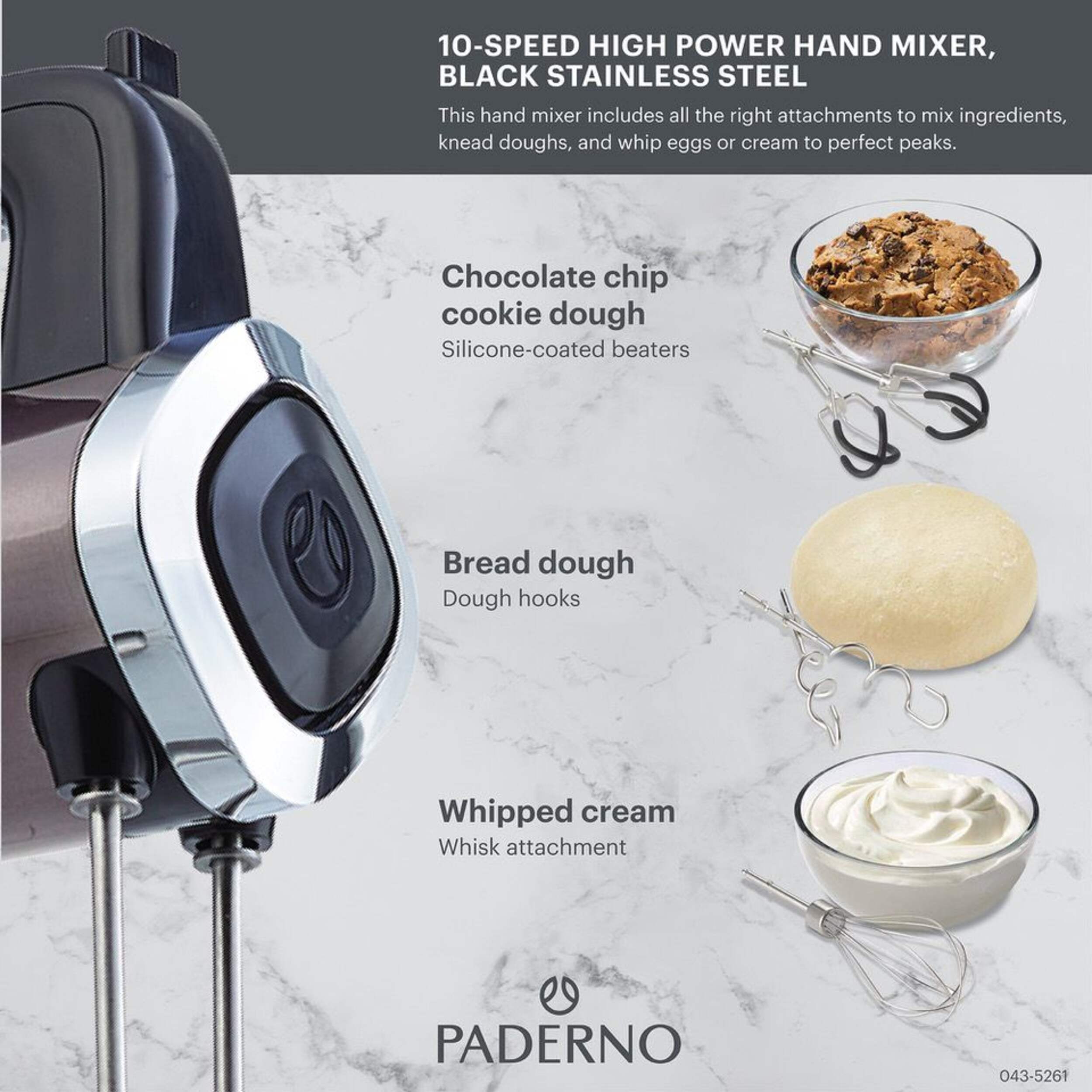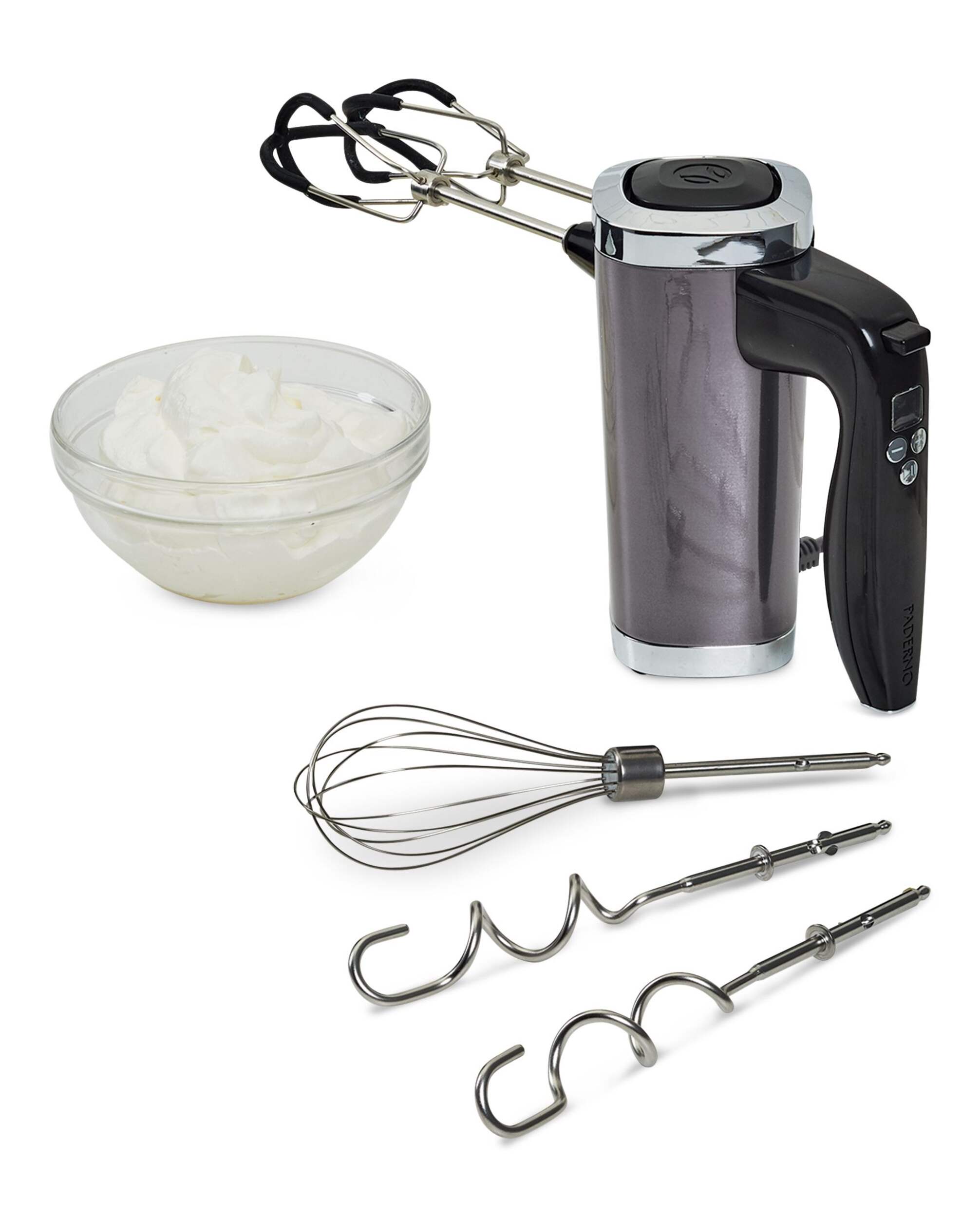 Bake, whip, or cream your favourite foods with this PADERNO 10-Speed High Power Hand Mixer. It has a powerful motor along with a range of attachments, so you can accomplish any cooking task with ease. Choose from 10 variable settings to get the consistency you need, whether you're whipping cream or making the perfect mashed potatoes.