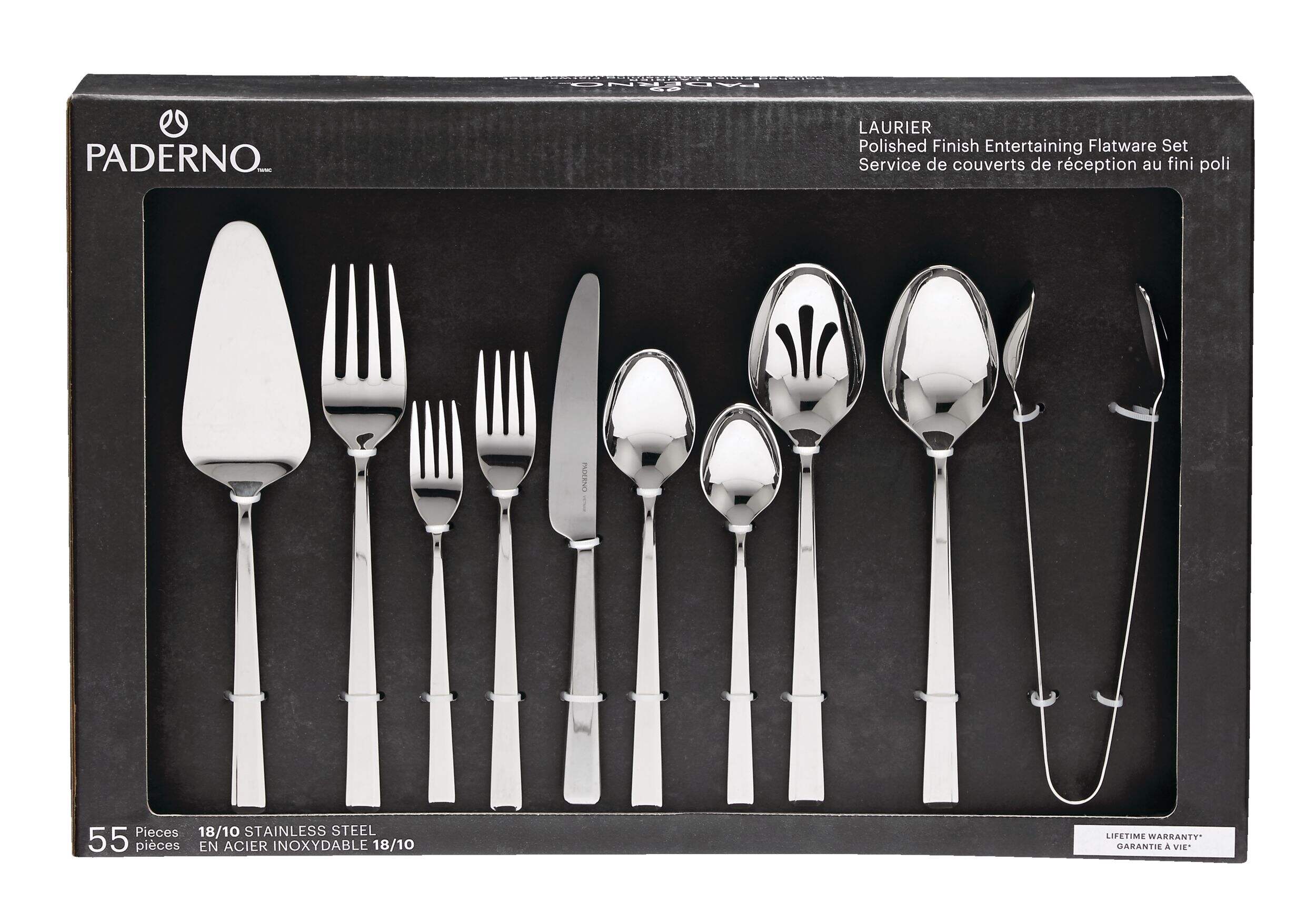 Featuring a stylish, modern design, the PADERNO Laurier Polished Finish Entertaining Flatware Set is perfect for casual, everyday use or for dinner parties. Guests and friends will love the polished finish, while you’ll appreciate the rust- and corrosion-resistant 18/10 stainless steel. Each item in this 55-piece flatware set is dishwasher-safe and easy to clean. The PADERNO flatware set includes ten 5-piece place settings and coordinating serveware.