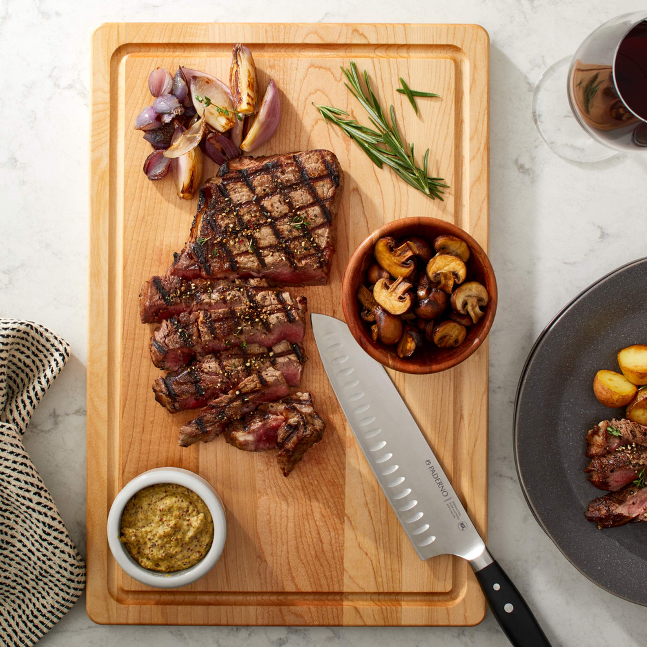 Handy for chopping just about anything, the PADERNO Maple Roast Board is a meal prep must-have. This reversible cutting board features a grooved side for quick chopping and a flat side with dug handles so you can serve your appetizers in style. Made from premium Canadian maple hardwood and featuring a simple yet stylish design, this chopping board is a durable choice that will look great sitting on your countertop. Plus, it’s incredibly low maintenance and easy to clean with a simple wipe-down.