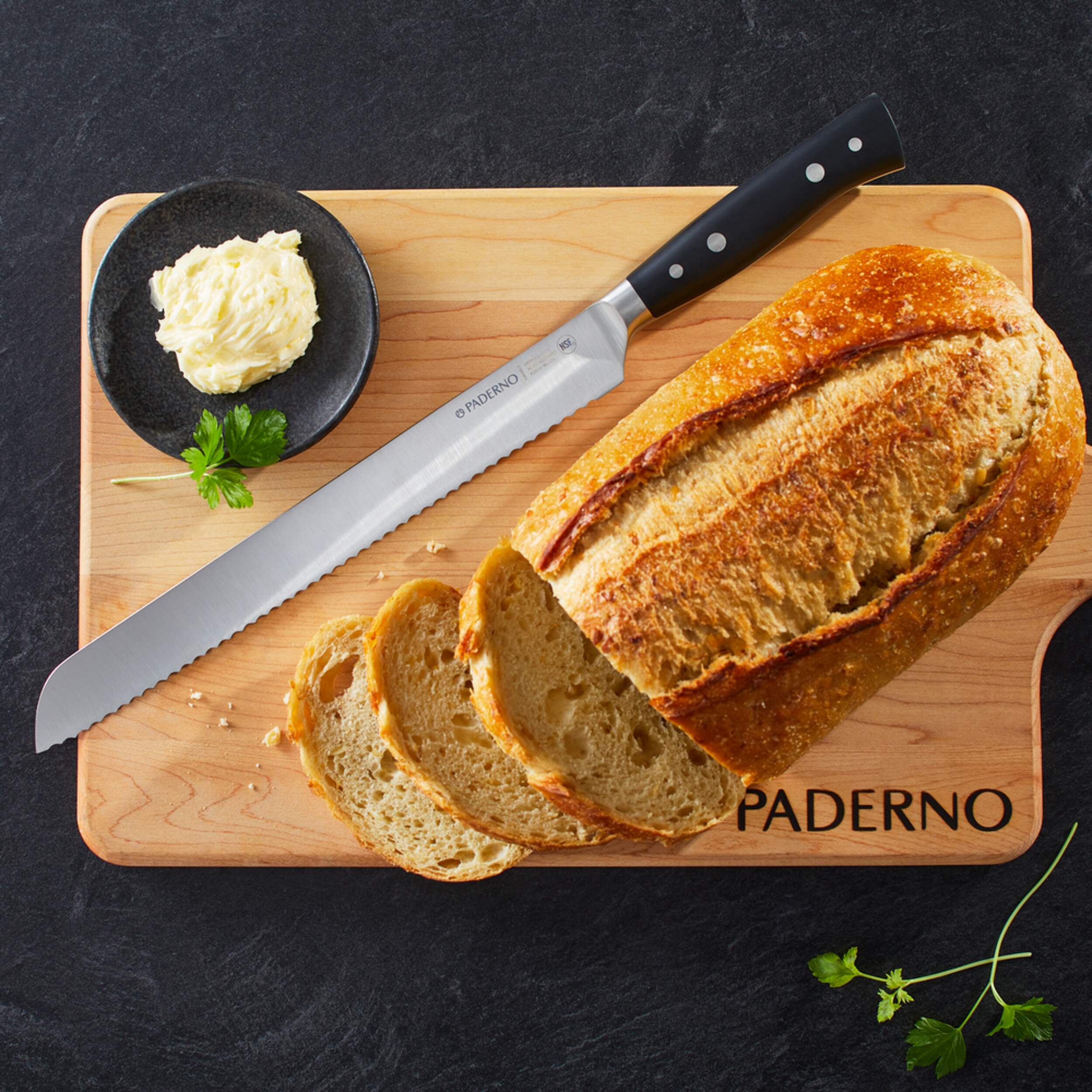 Well-crafted and built to last, the PADERNO Montgomery Bread Knife is a must-have kitchen tool. This professional-grade bread knife is forged from a single piece of German stainless steel and has an ergonomic design that’s easy to handle and allows for precise control. Featuring a full tang design with four rivets and a serrated blade, this stainless steel bread knife cuts easily through soft bread, bagels, baguettes, and more without squishing or breaking your bread.