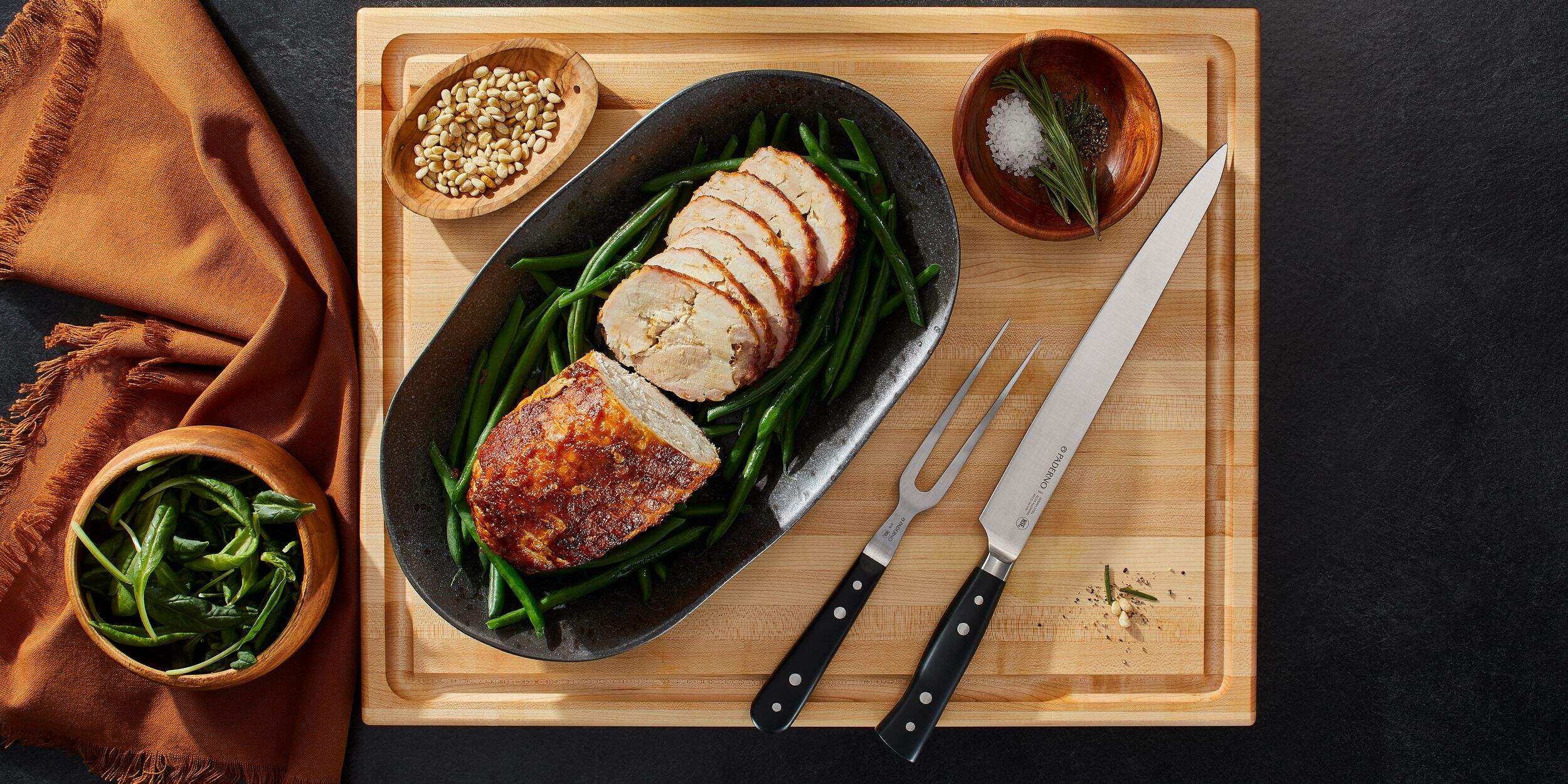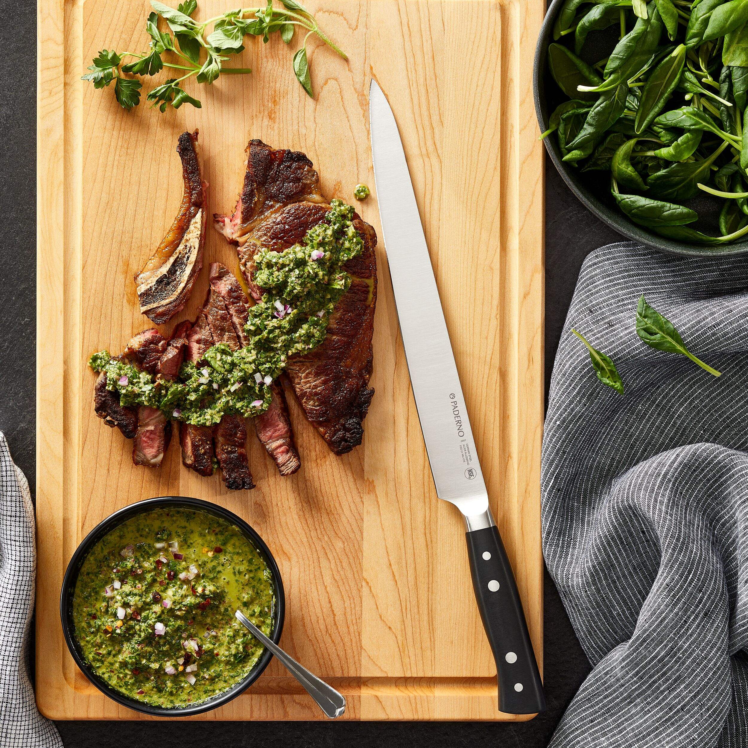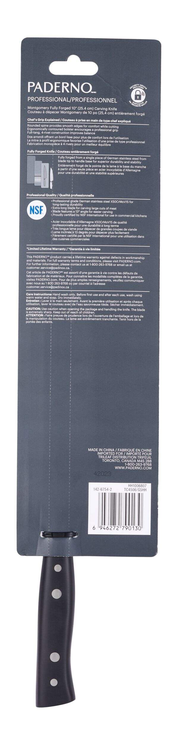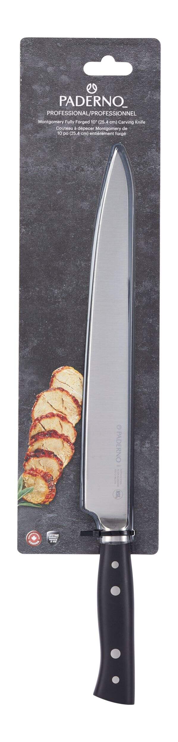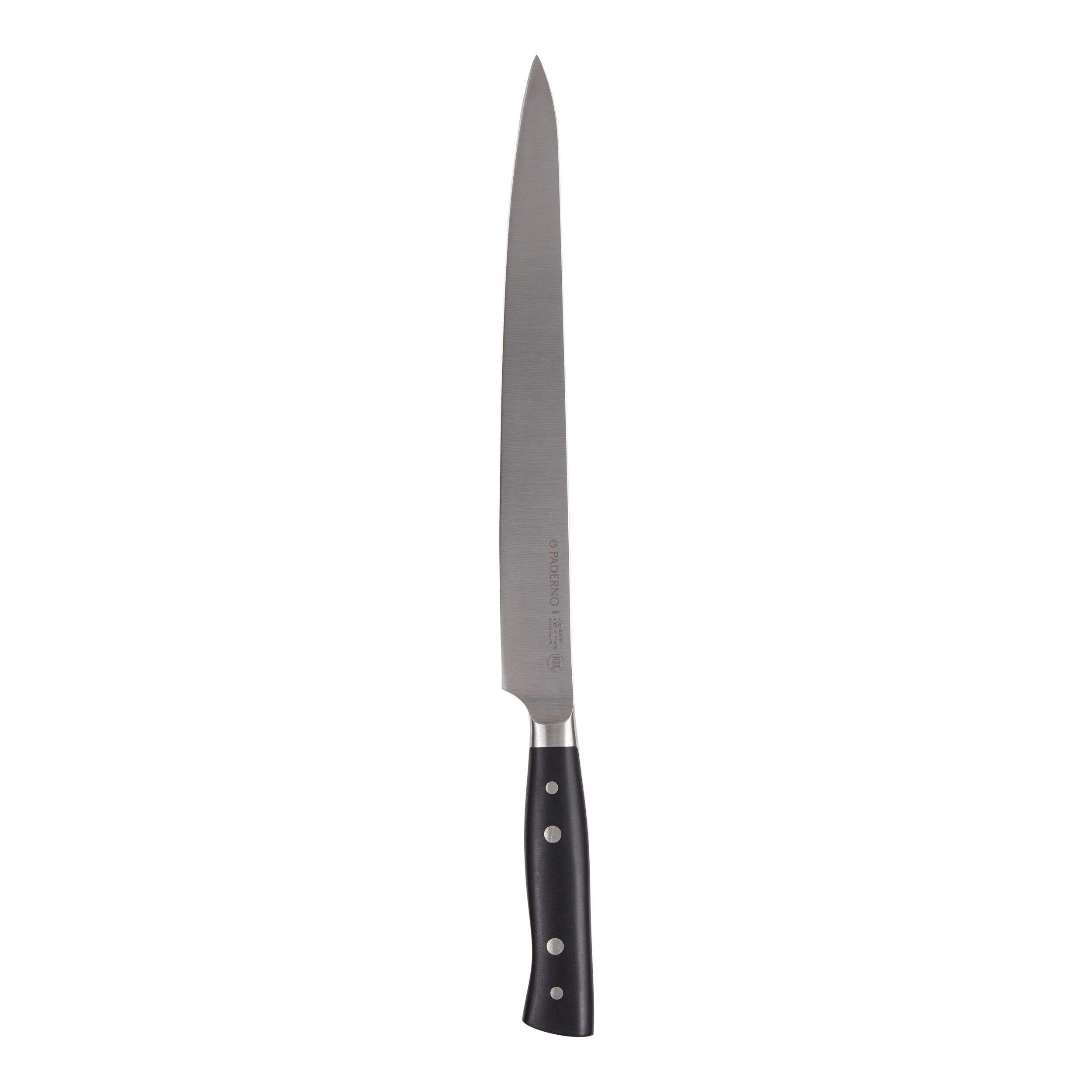 Slice and serve your next roast with ease with this Paderno Professional Montgomery Fully Forged Carving Knife. With a professional-level construction that features a long, sharp blade, this carving knife offers the control you need to easily cut through large cuts of meat like turkey, leg of lamb, ham, brisket and more. Featuring a durable construction and ergonomic grip, this carving knife is an essential tool for the holidays, dinner parties or for professional chefs.