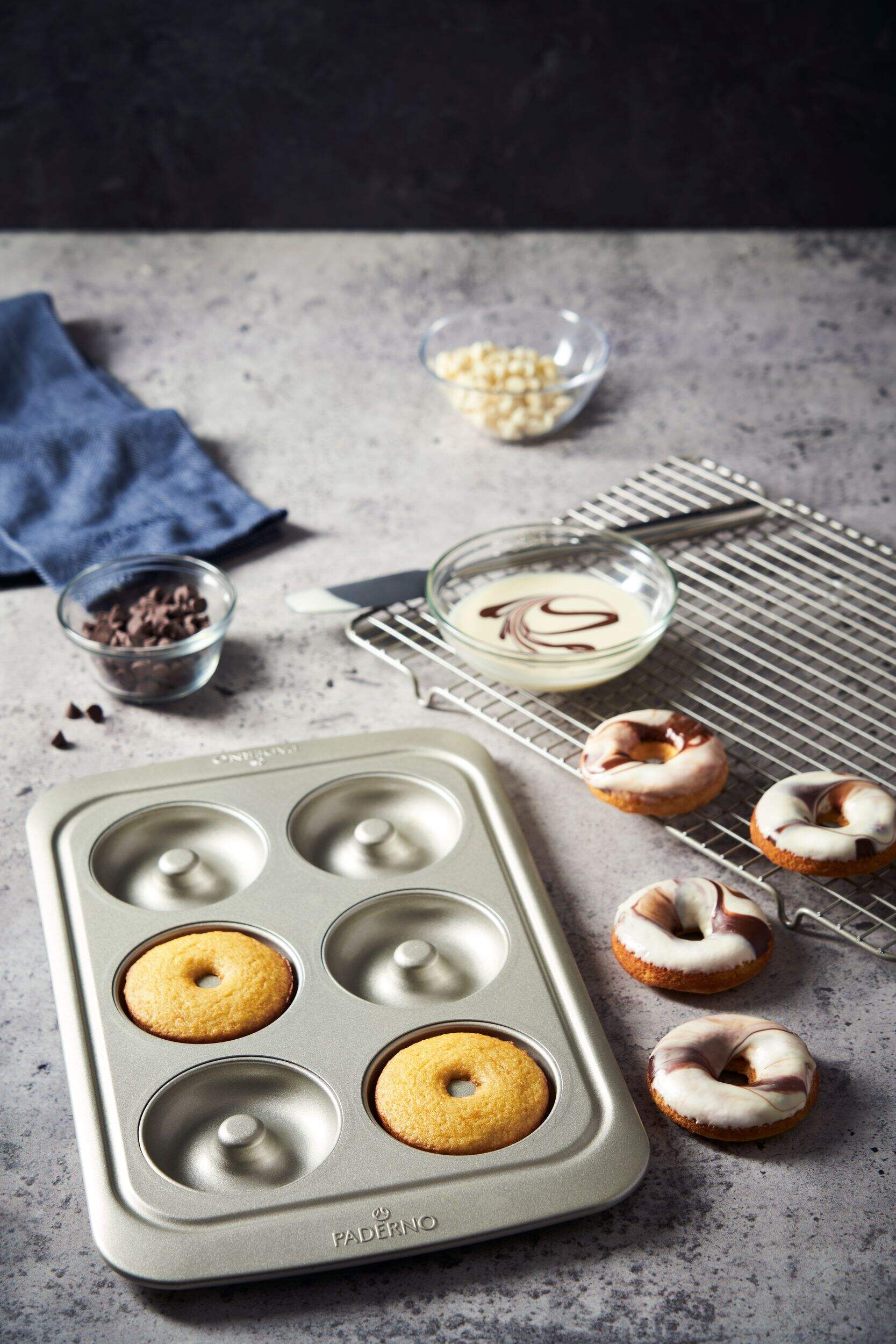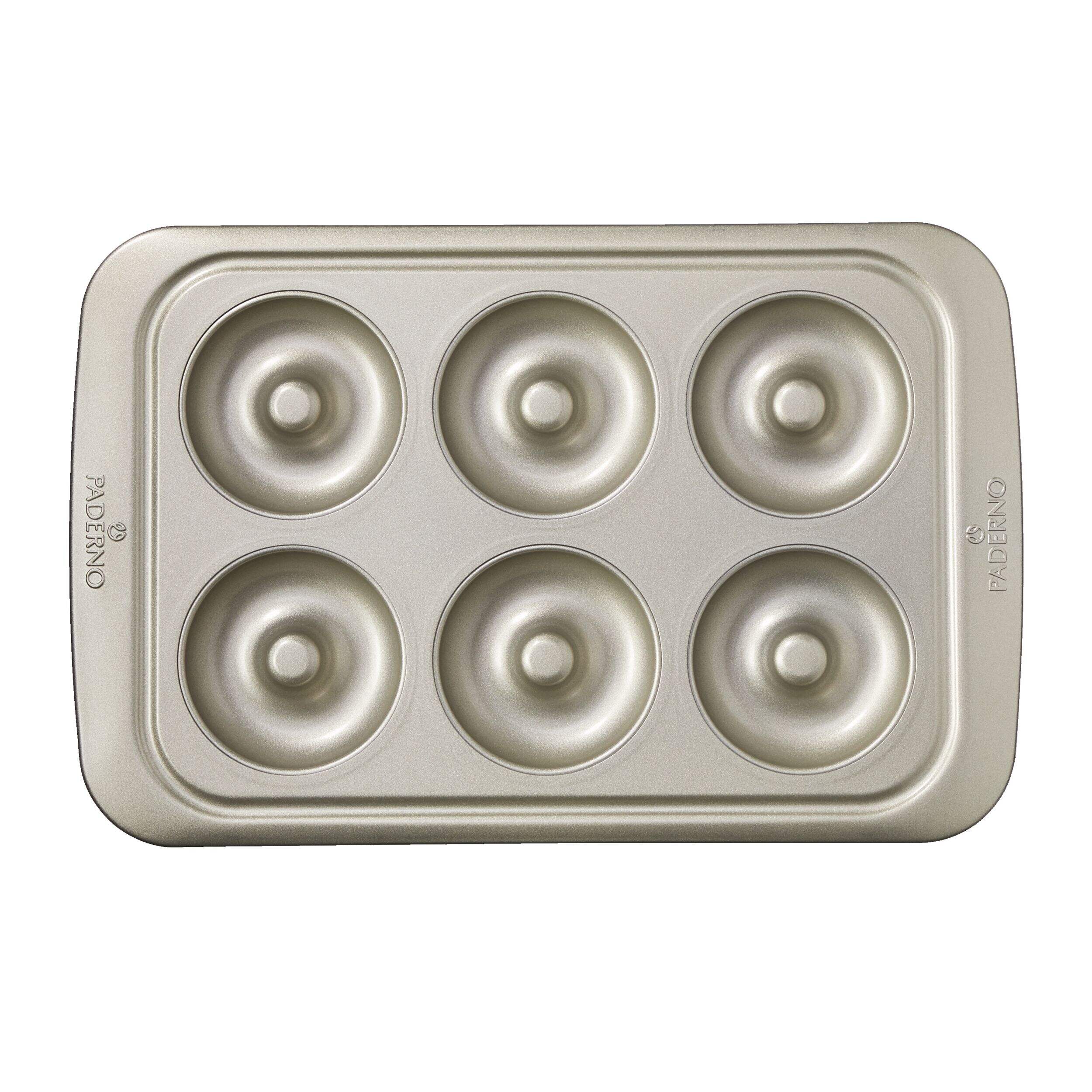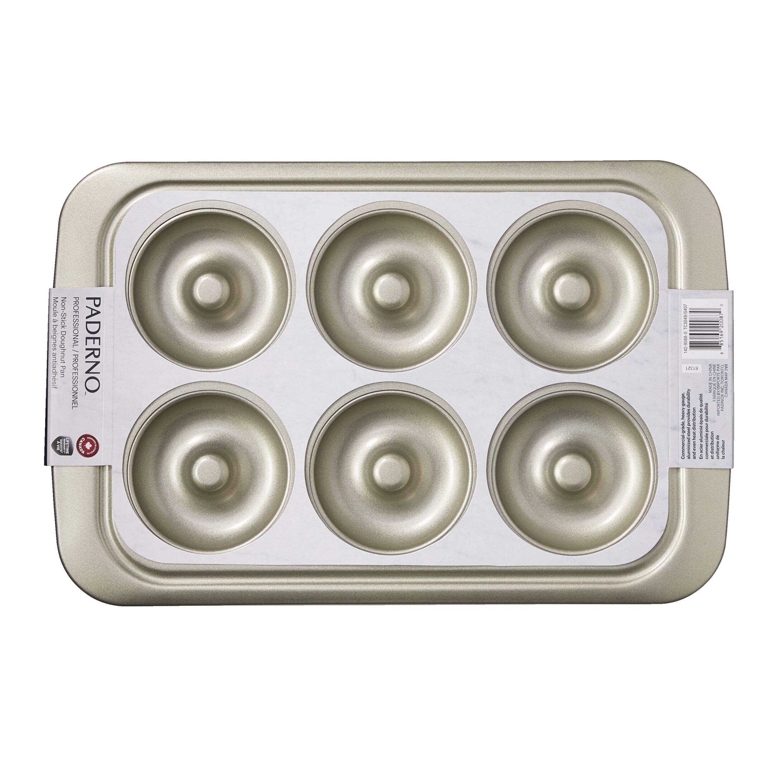 Create beautifully shaped donuts without a sticky, baked on-mess using the PADERNO Professional Non-Stick Donut Pan. This durable pan is crafted from commercial-grade, heavy-gauge aluminized steel with a two-layer non-stick coating for quick food release and easy cleanup. The reinforced rim ensures secure handling in and out of the oven without the pan warping. One donut pan makes six individual donuts.