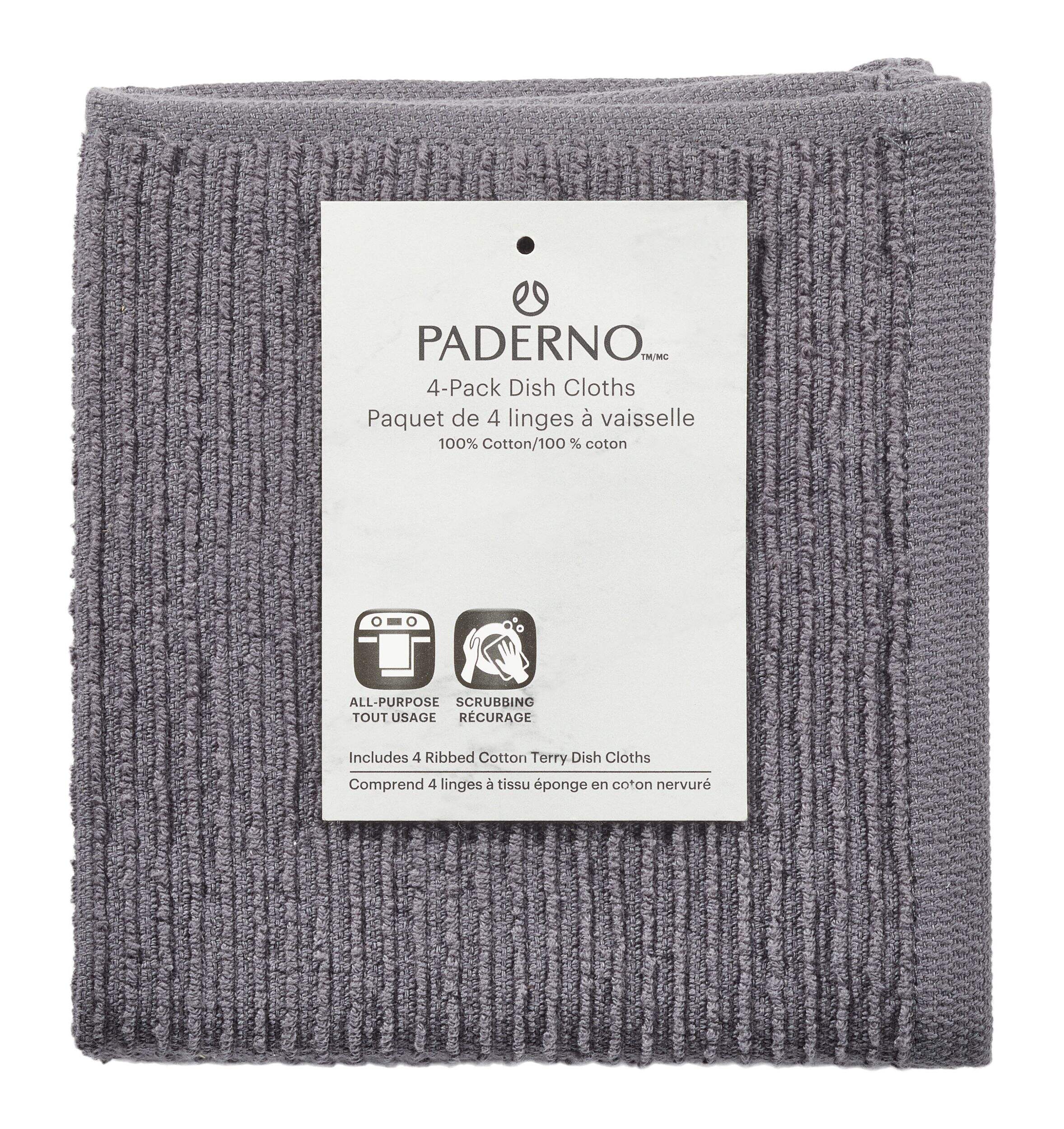 The PADERNO Ribbed Cotton Terry Square Dish Cloths deliver functionality and style to your kitchen. This convenient multi-pack of kitchen towels features a woven terry construction and a handy hanging loop for easy storage. Their ribbed terry fabric effectively tackles messes while adding a modern, textured look to your space.