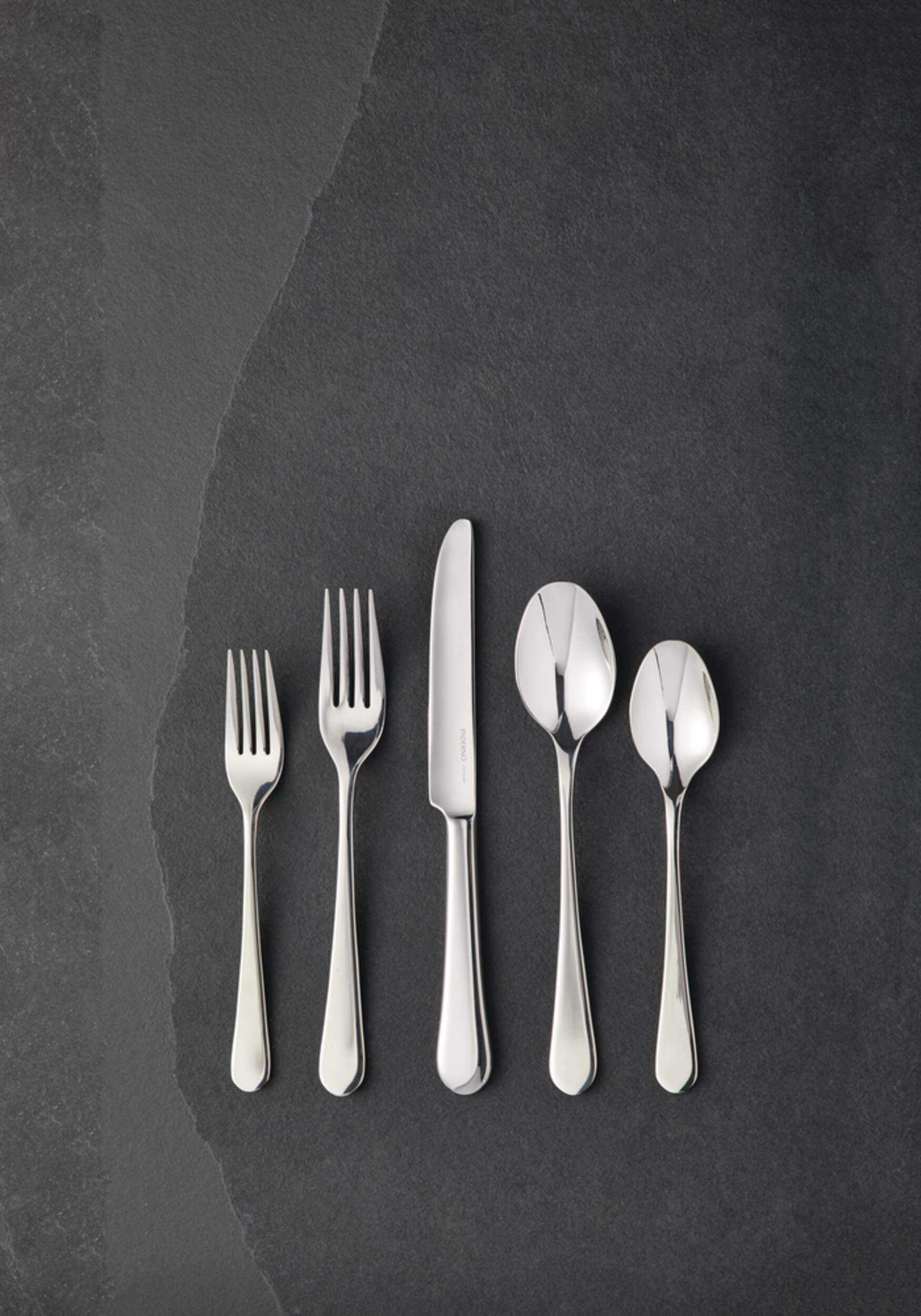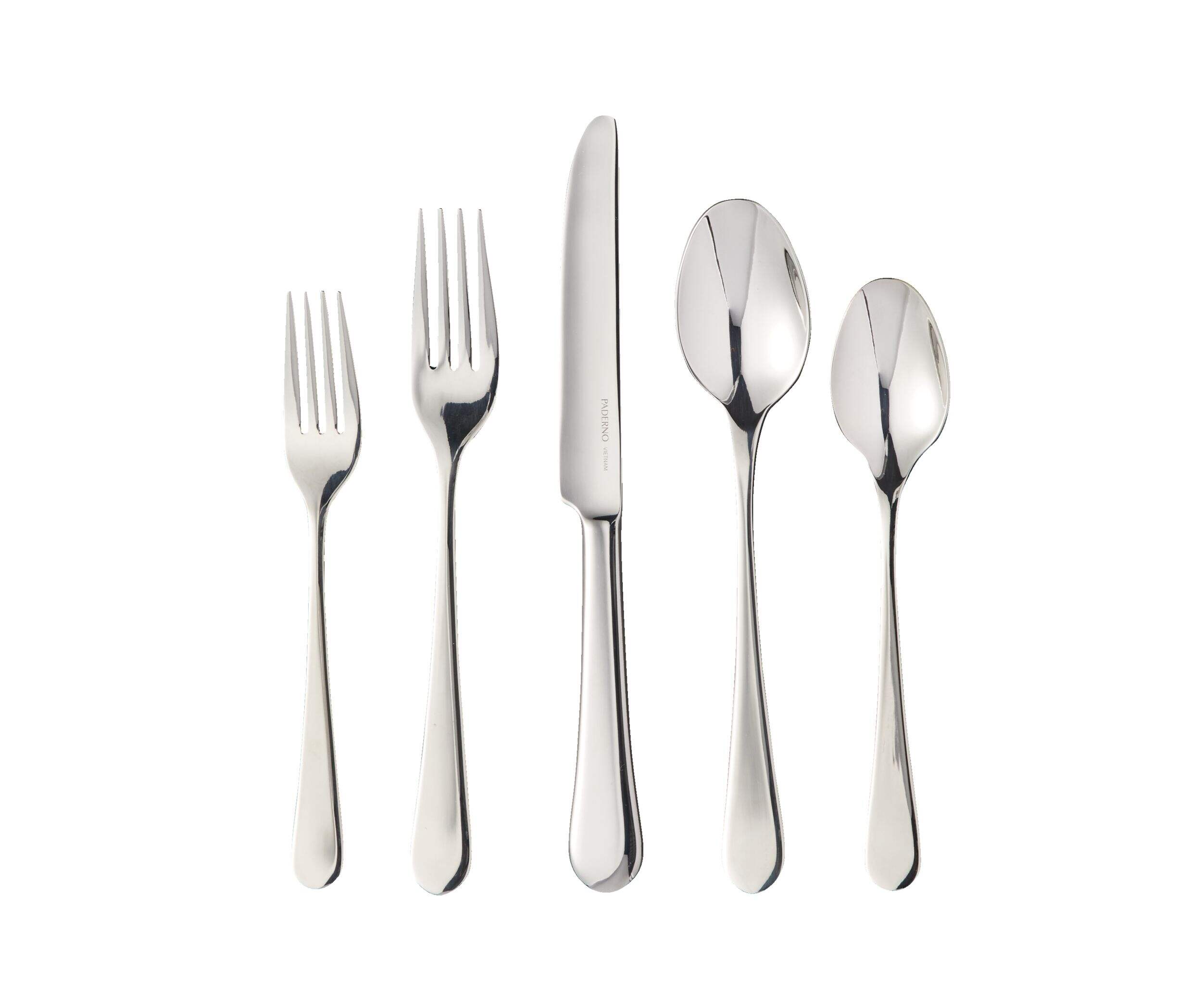 Each 5-piece setting includes a dinner knife, dinner fork, salad fork, dinner spoon and dessert spoon