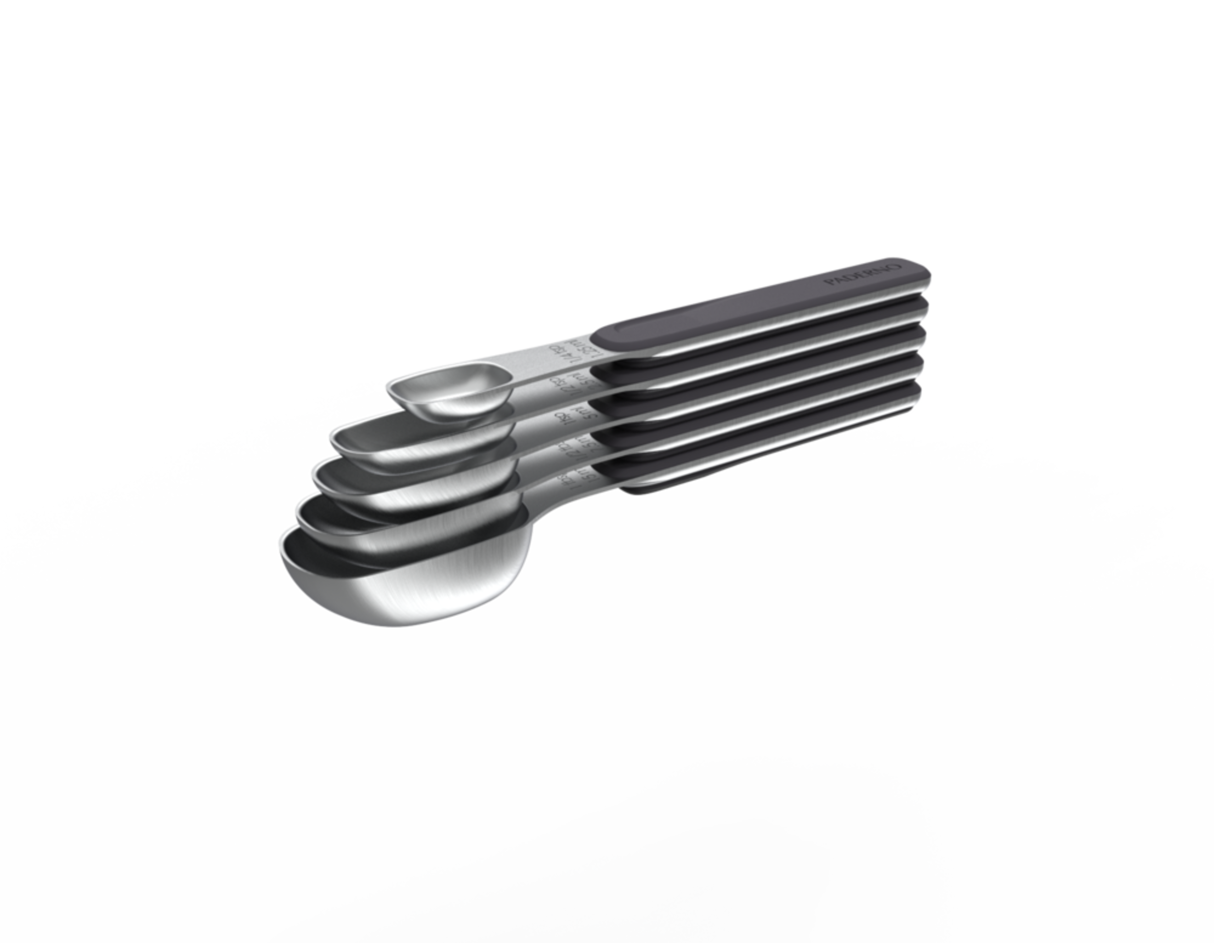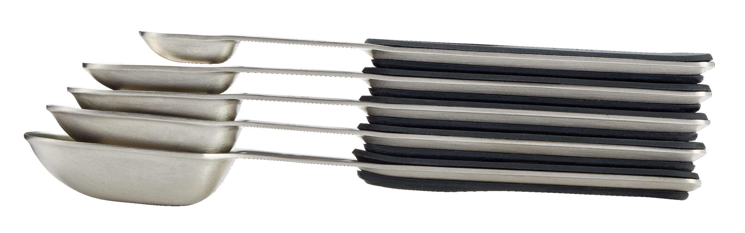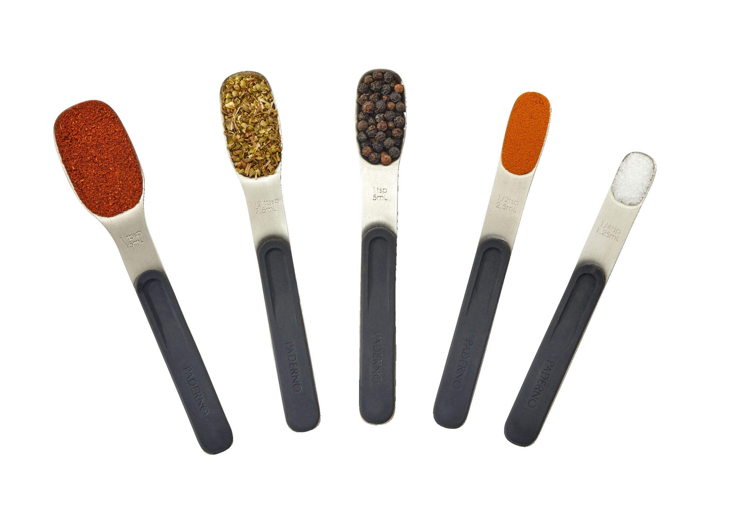 Get your ingredients just right with the PADERNO Magnetic Measuring Spoons. This 5-piece measuring spoon set has everything you need to bake like a professional, including 1/4 tsp, 1/2 tsp, 1 tsp, 1/2 tbsp and 1 tbsp measuring spoons. Their durable 18/10 stainless steel construction makes them easy to clean, while the comfortable silicone grips reduce slips and spills. The embossed markings will not fade over time, while each measuring spoon comes with a magnetic handle for simple stacking.