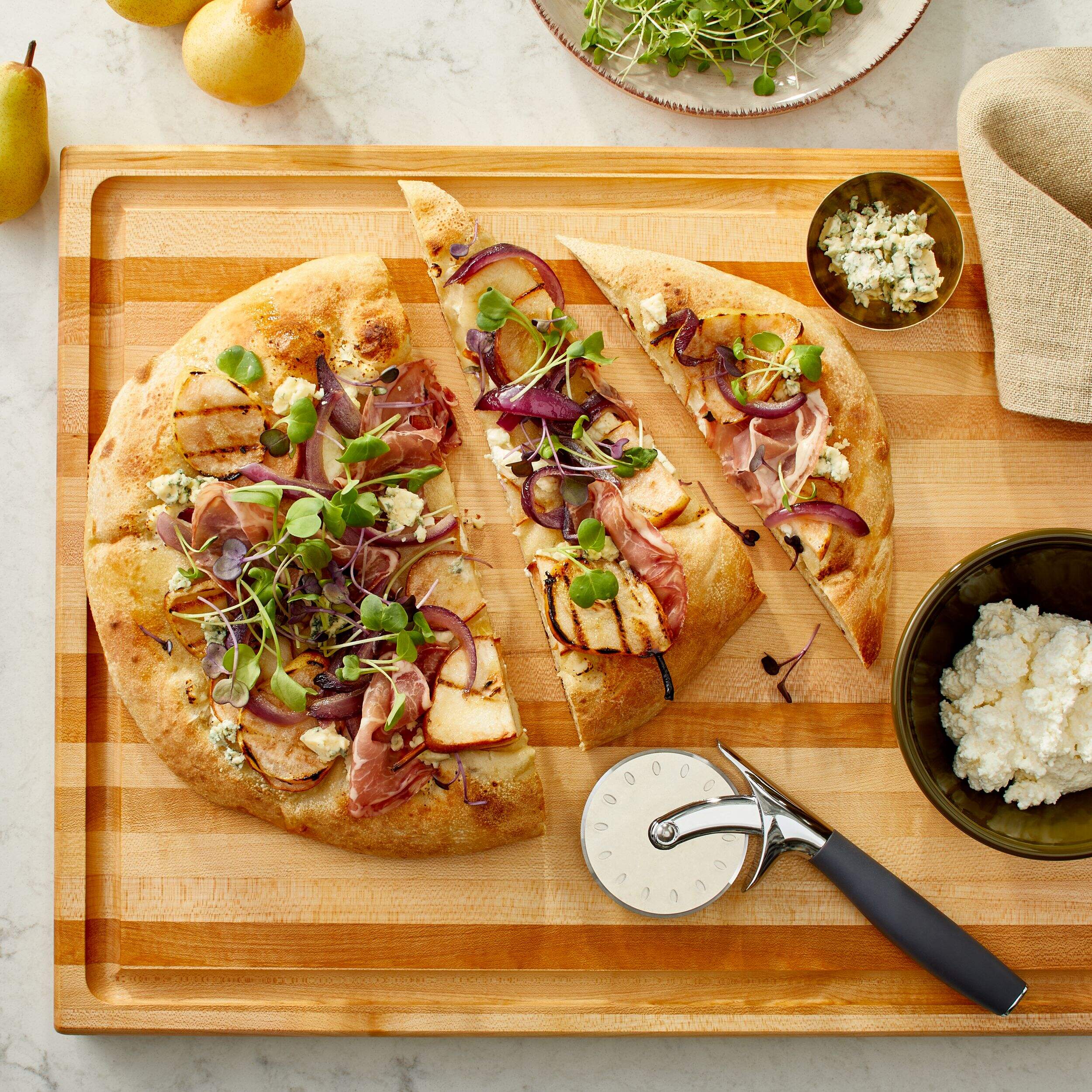 For pizza masters and amateur chefs alike, this PADERNO Pizza Wheel has a sharp, stainless steel blade for clean cuts and spectacular pies. Specially weighted to move effortlessly through the thickest crusts, this dishwasher-safe pizza slicer features blade kullens to minimize food sticking. The gap between its blade and handle makes cleaning simple. The pizza roller includes an ergonomic non-slip handle and a reusable blade guard for safe storing.