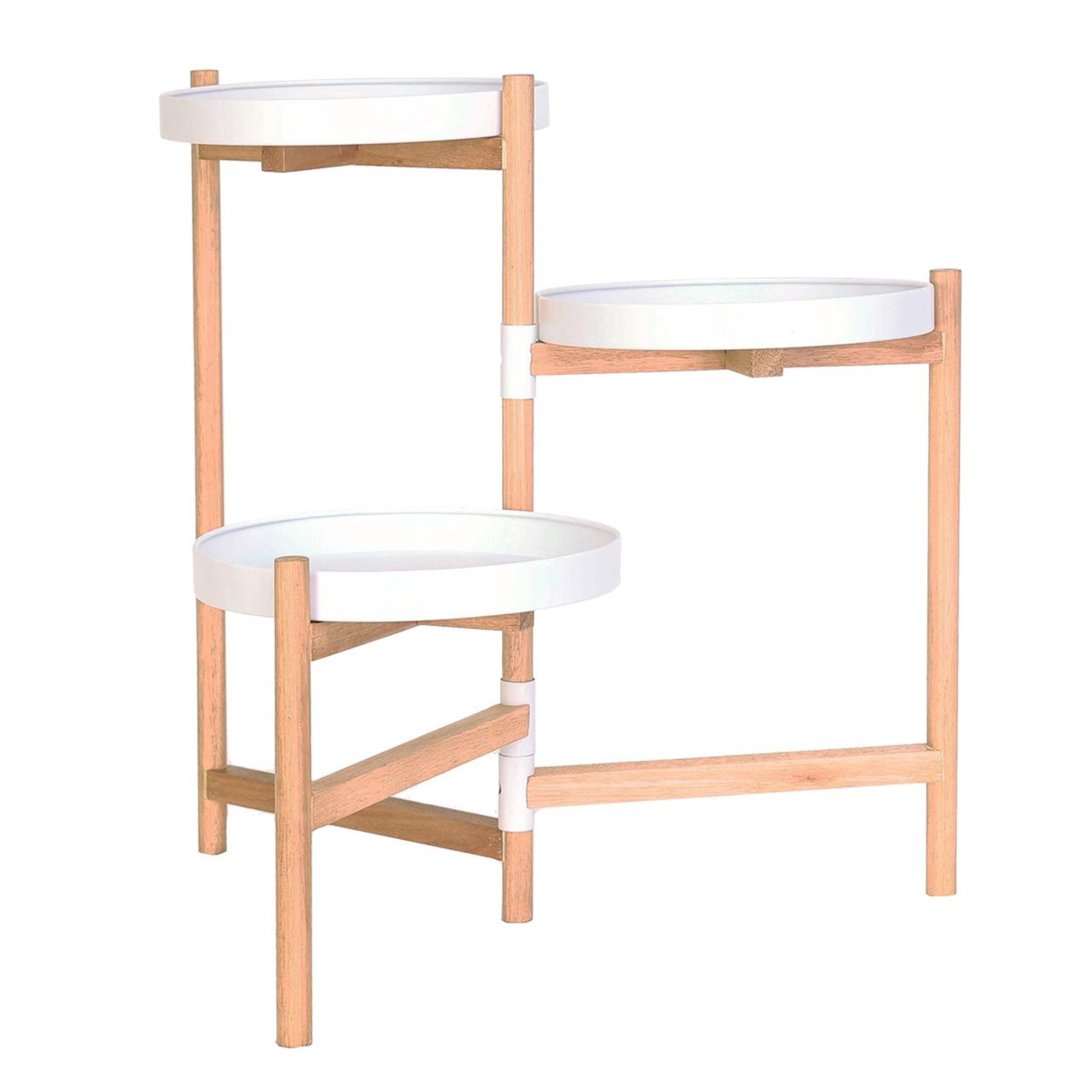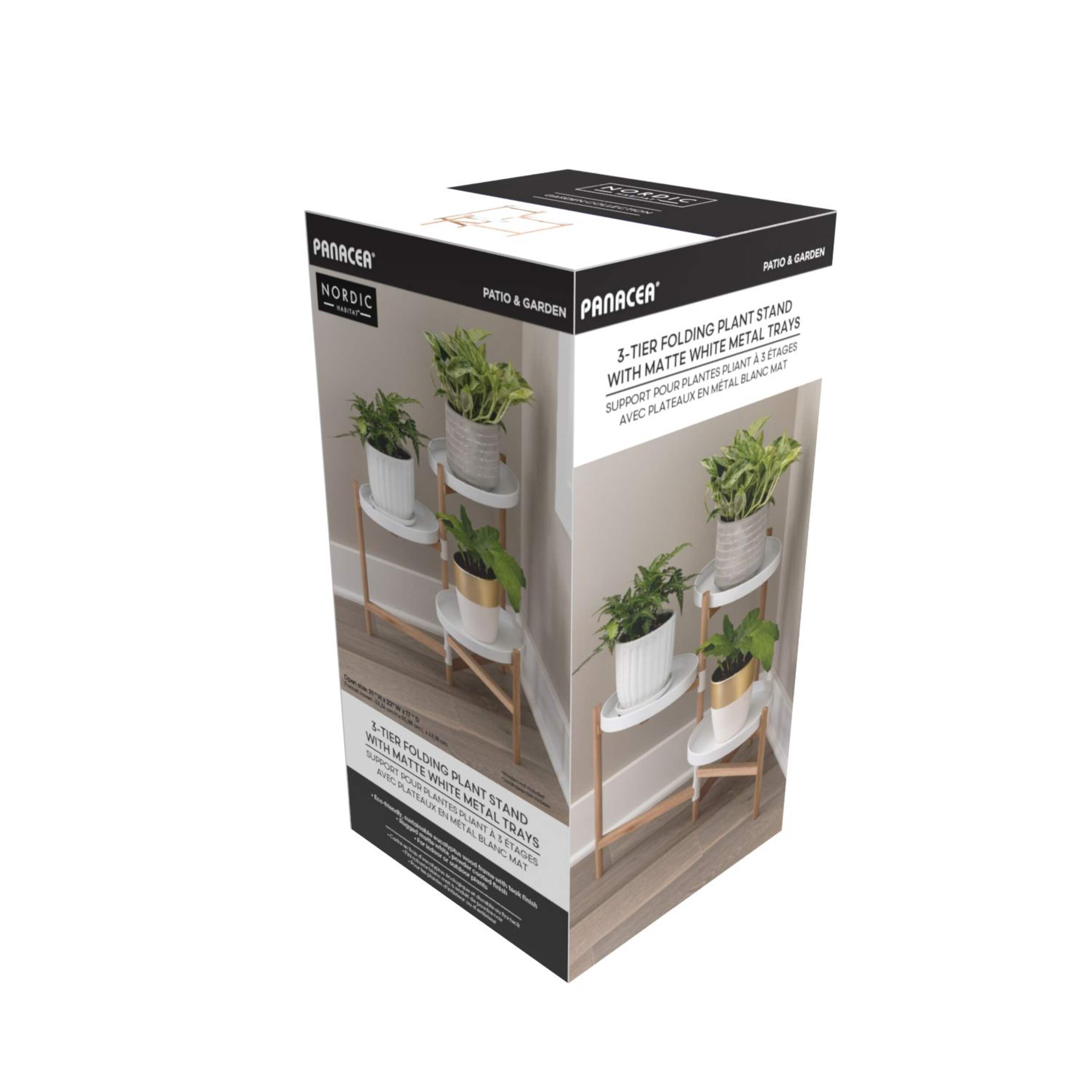The Panacea Nordic 3-Tier Folding Wood Plant Stand with Metal Trays features a sustainable natural eucalyptus wood stand with a teakwood colour finish