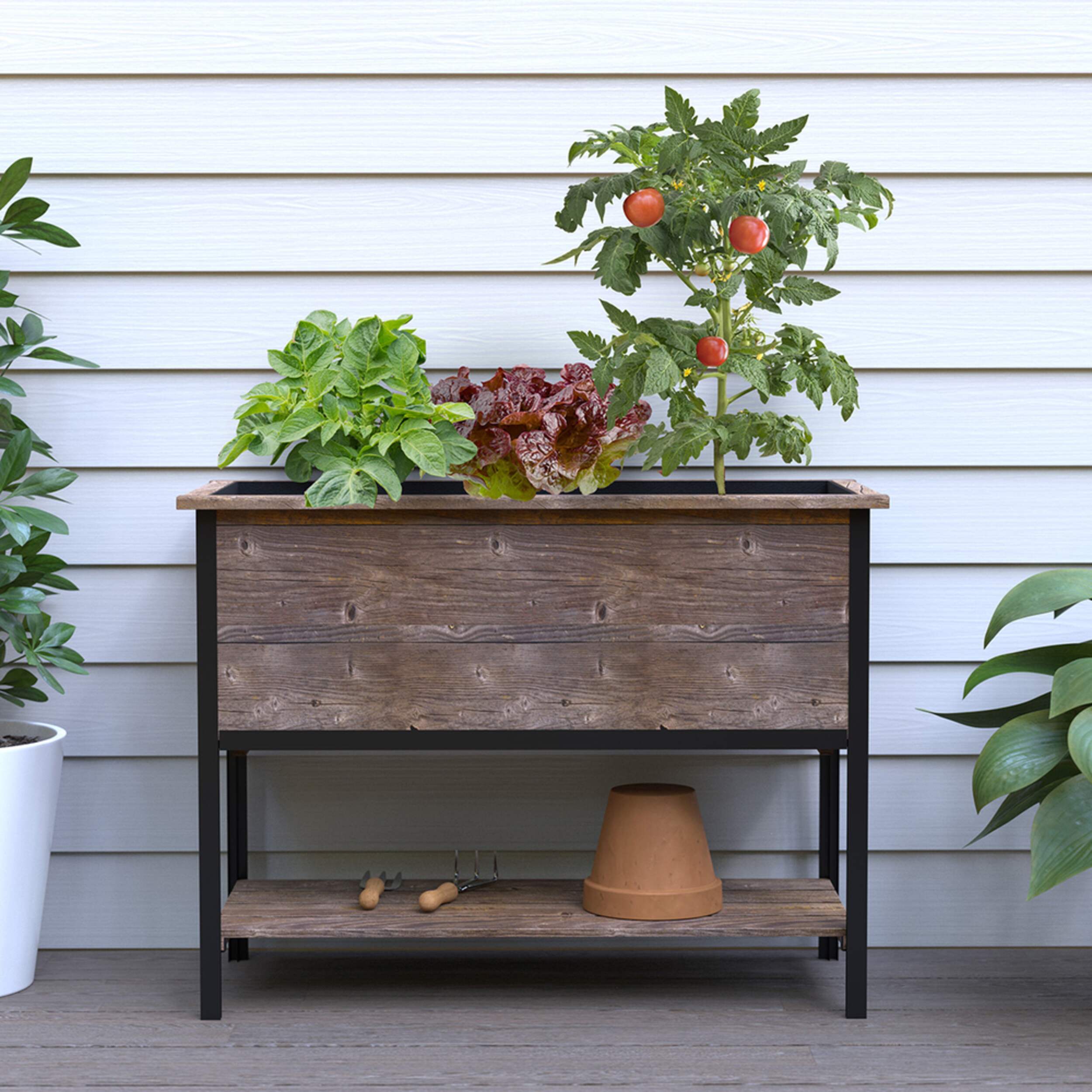 This rustic style wood and steel elevated garden bed brings the backyard in. The waist-high 30-inch height makes planting, maintaining and harvesting your tomatoes, vegetables, and herbs easy. The driftwood grey distressed cedar slats and sturdy aluminium frame with bottom shelf for storage have a timeless appeal, while holding up to 4.86 cubic feet of soil. The drainage holes in the included liner ensure proper water flow. At 39.75 by 18.2 by 30 inches assembled, this patio, balcony or garden bed is simple to put together and will stand the test of time.