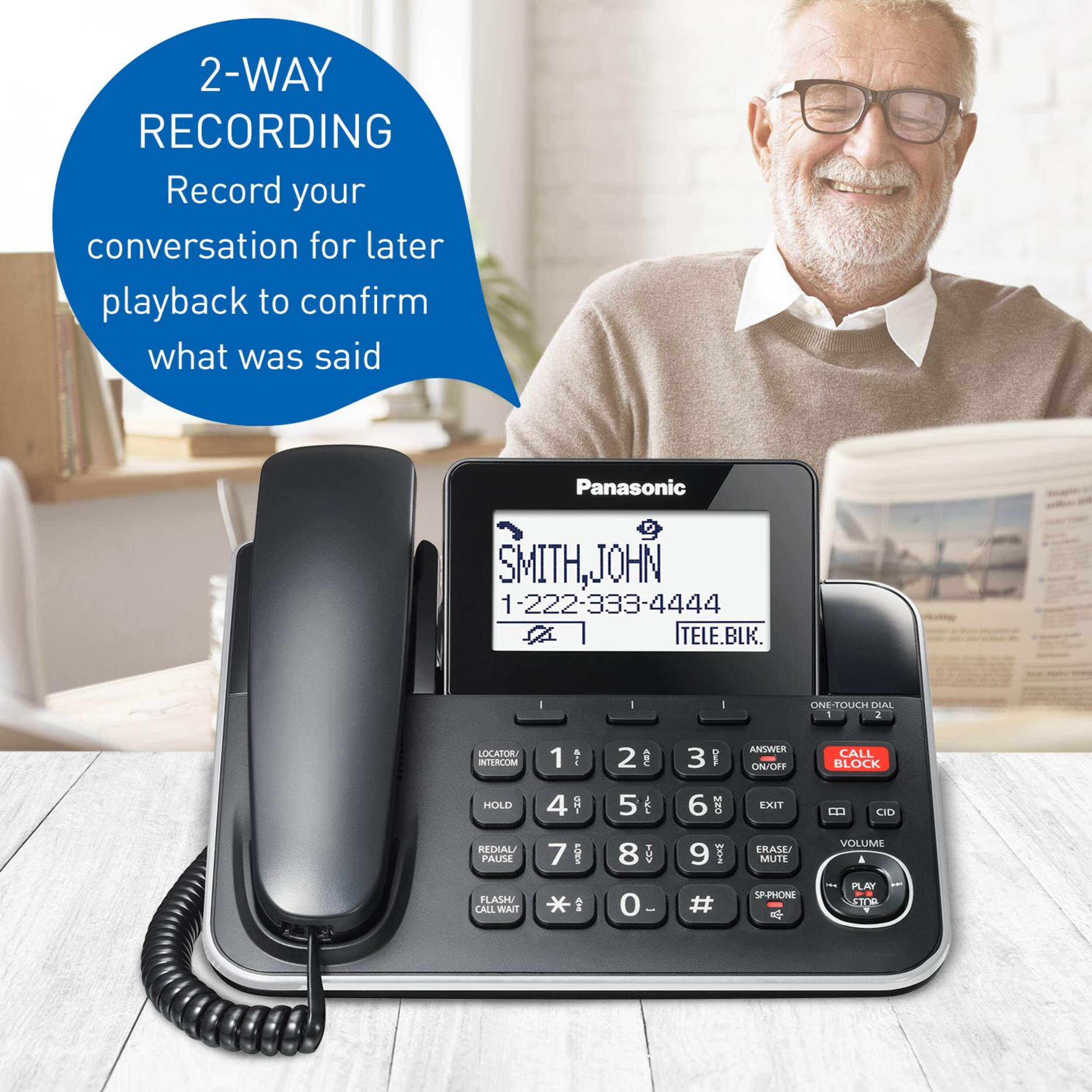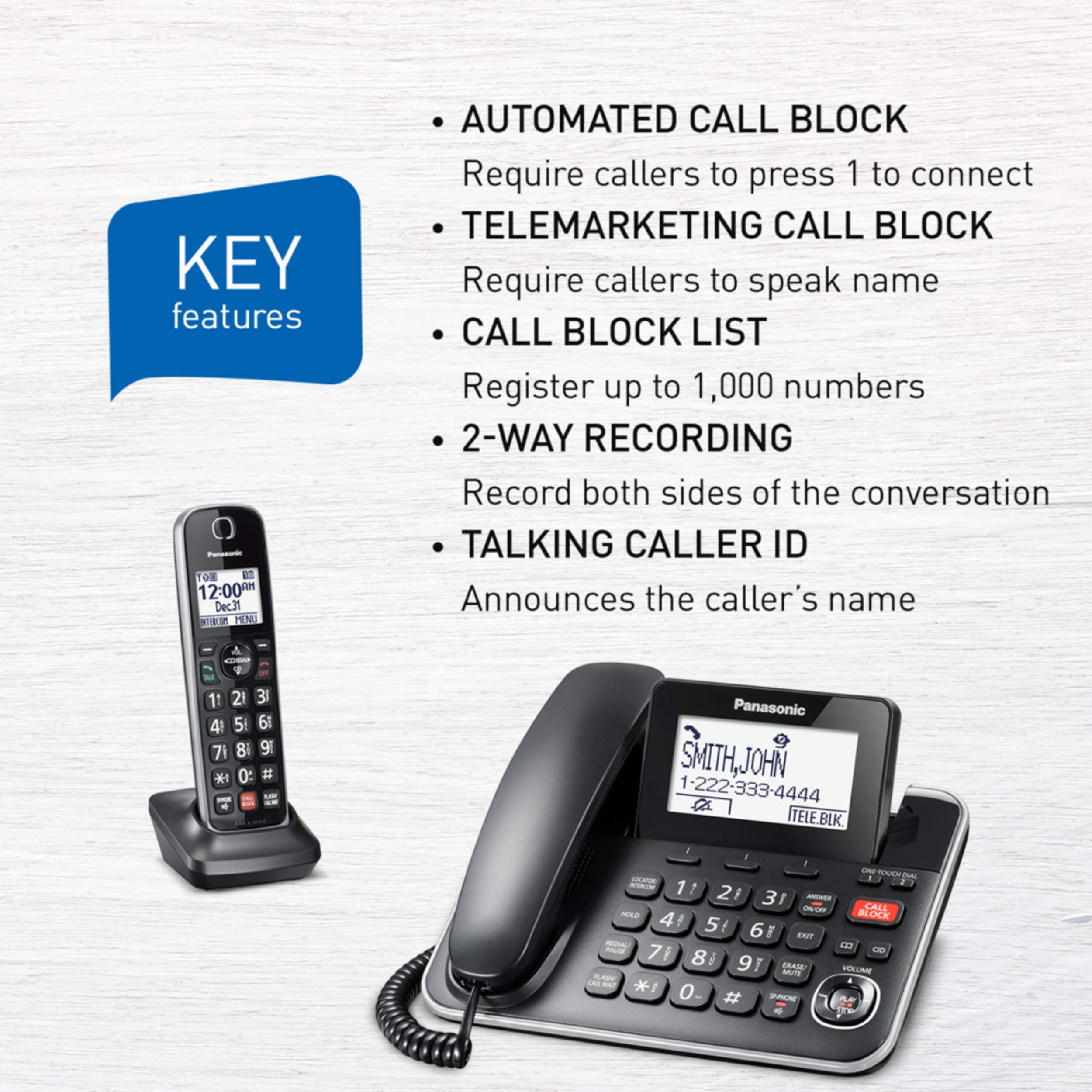 The Panasonic DECT 6.0 Corded/Cordless Phone Combo with Answering System is a smart, sleek, and reliable solution for effortless phone management. Equipped with both a corded and cordless handset, it offers flexibility and convenience. Say goodbye to unwanted calls with the Call Block feature, allowing you to block up to 1,000 nuisance numbers, including telemarketers, robocalls, and toll-free calls. With the press of a button, you can easily add numbers to your block list, ensuring they won’t bother you again. Stay informed with Talking Caller ID, which uses text-to-speech technology to announce the caller's name between rings, so you can decide whether to answer without checking the screen. The phone’s 2-way recording feature lets you record conversations for later playback, with an audible prompt to notify callers, deterring suspicious or unwanted calls. This system is packed with features to simplify everyday communication, making it a perfect fit for any home or office.