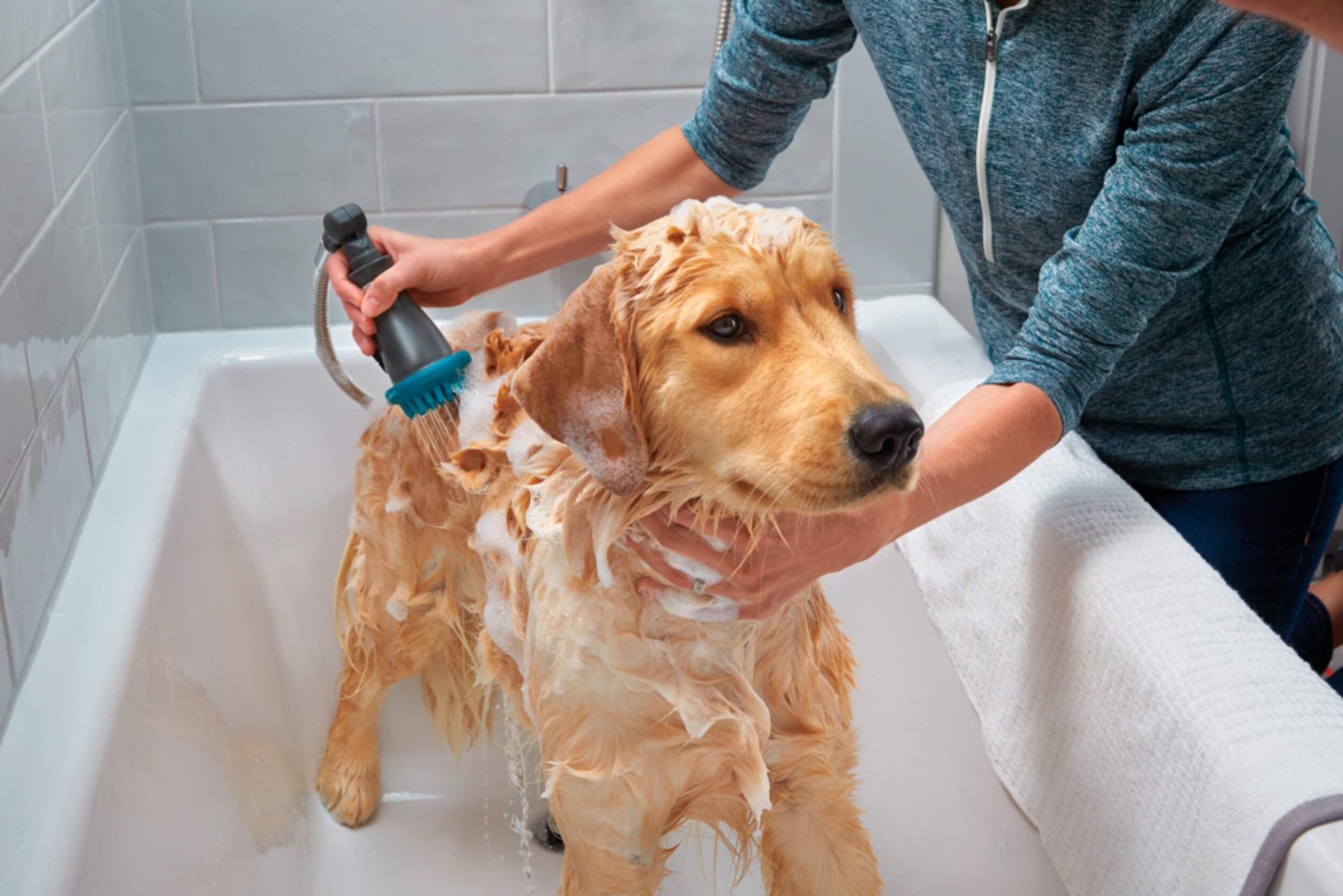 Pet attachment with "fingers" to scrub dirty pet fur