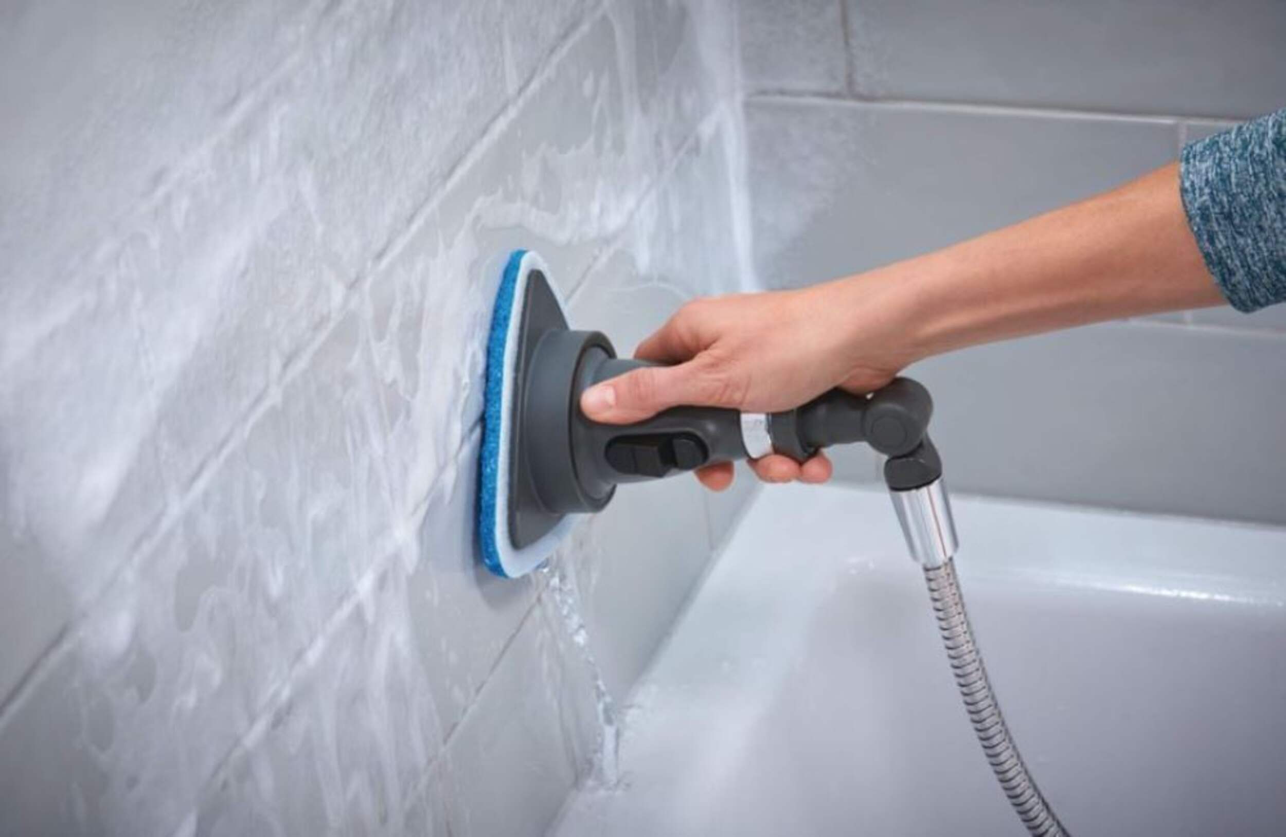 Cleaning pad attachment allows water to flow through for faster tub and tile cleaning