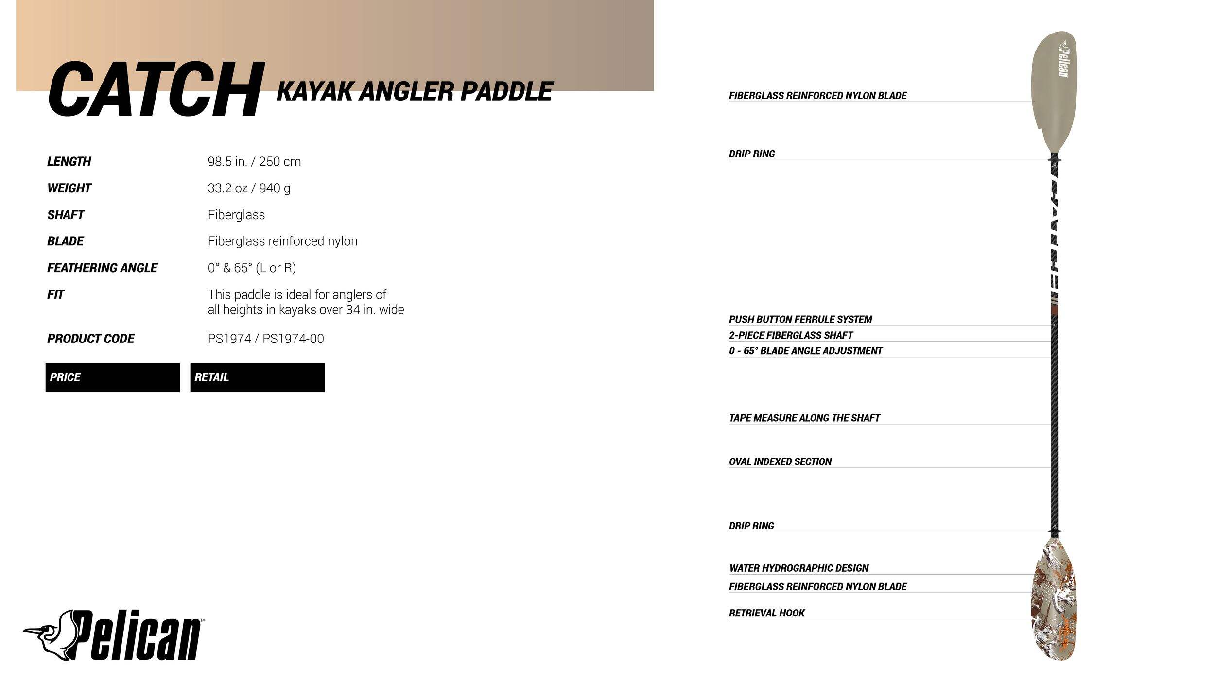 Enhance your fishing adventures with the Pelican Catch Angler Aluminum Kayak Paddle, designed to provide comfort and efficiency on the water. Whether paddling long distances or navigating tight spots, this lightweight and ergonomic paddle minimizes fatigue, ensuring a smooth and enjoyable experience. Its practical features make it a reliable choice for anglers who want to focus on the catch without compromise.