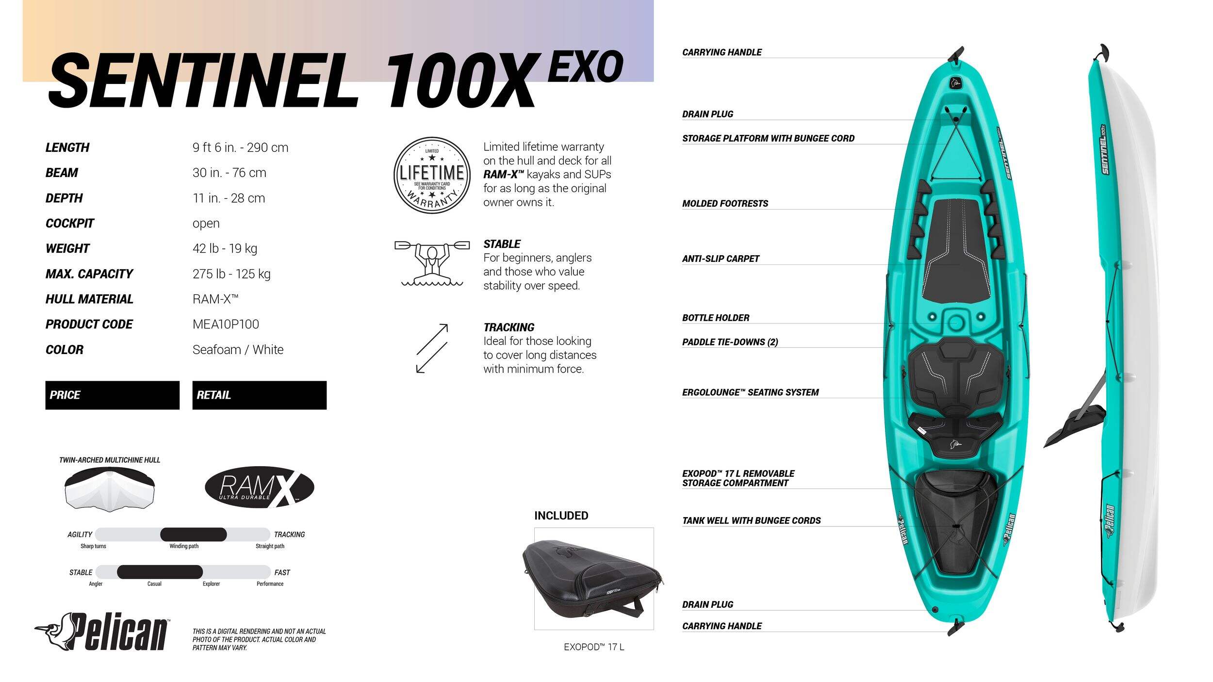 The Sentinel 100X EXO recreational kayak is a compact 9'6" kayak designed for the recreational paddler seeking a stable, comfortable, easy-to-store boat. Its non-slip mat is the ideal platform for your pet to join you on your kayaking excursions. This sit-on-top kayak features numerous add-ons, including a front storage platform, a spacious rear tank well with bungee cords, a molded bottle holder, 2 paddle tie-downs, and convenient carrying handles. Made from ultra-durable Ram-X™ material, this kayak is designed to create memorable moments along the waterway.