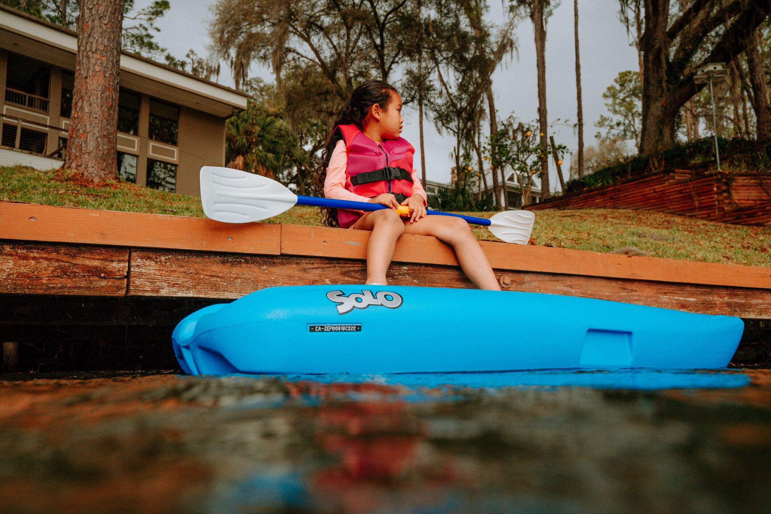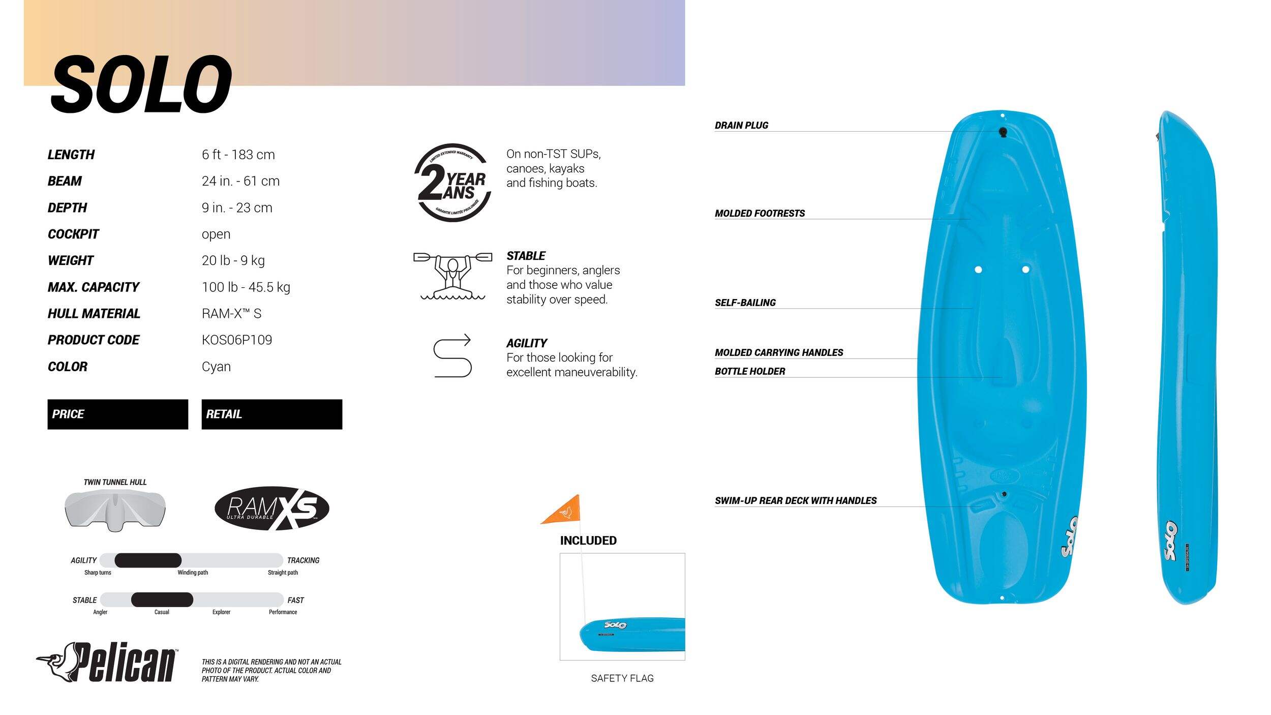 Get your little paddler out on the water with the Pelican Solo Kids Sit-On Recreational 1-Person Kayak. Perfectly scaled down to suit smaller paddlers, this kayak is easy to maneuver and provides superior stability, with a sit-on style and a moulded seat for extra safety and comfort. Made of impact-resistant Ram-X™, and packed with features, the Solo will provide years of paddling enjoyment.