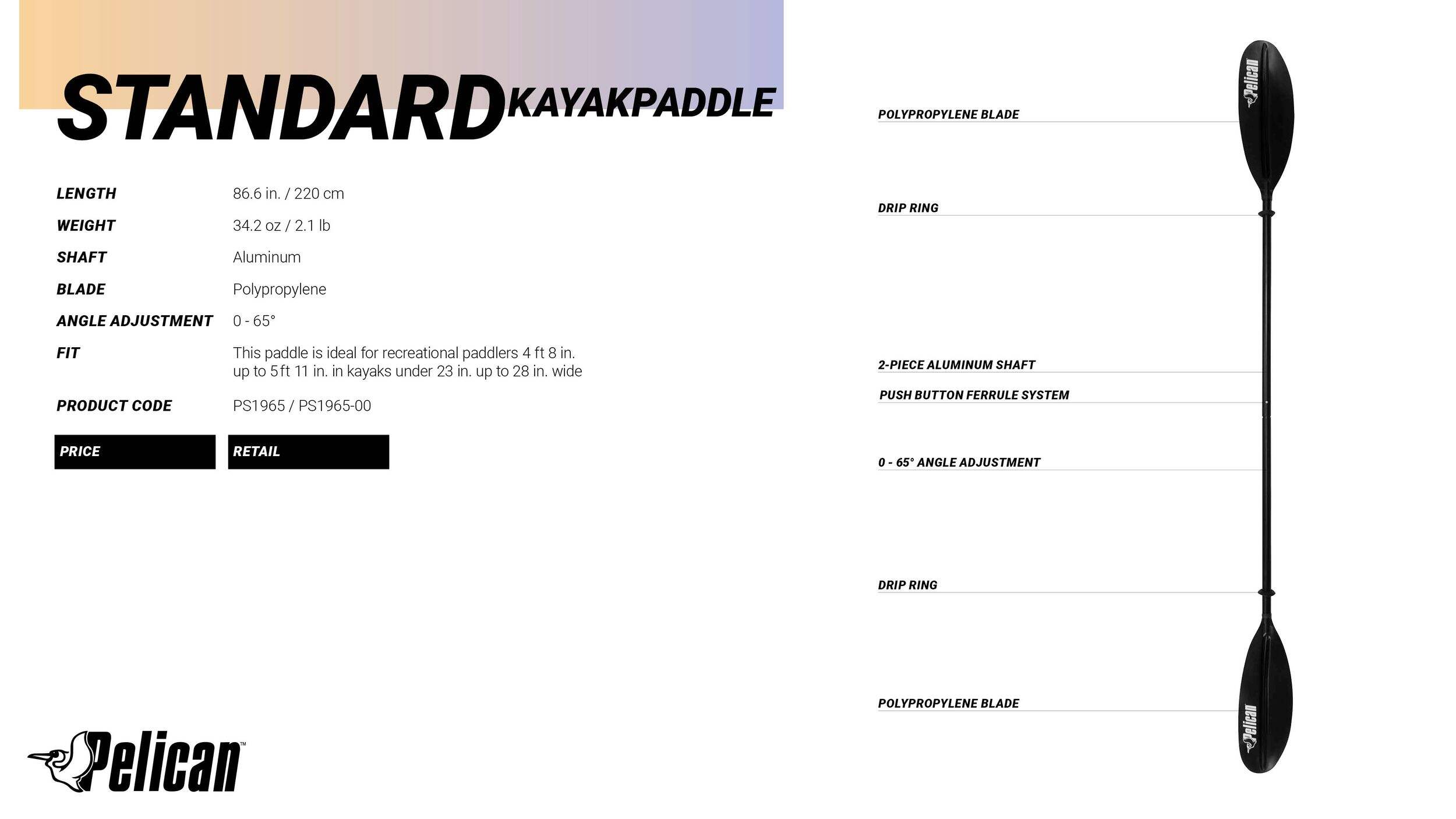 The Standard kayak paddle lives up to its name as a solid performer for both novice and advanced paddlers. The 2-piece shaft design simplifies transportation and storage for seasonal and weekend watersports adventures. The expertly contoured polypropylene blades encourage efficient technique while maximizing comfort on every stroke. This kayak paddle is a value choice, incorporating thoughtful features with strength and dependability.