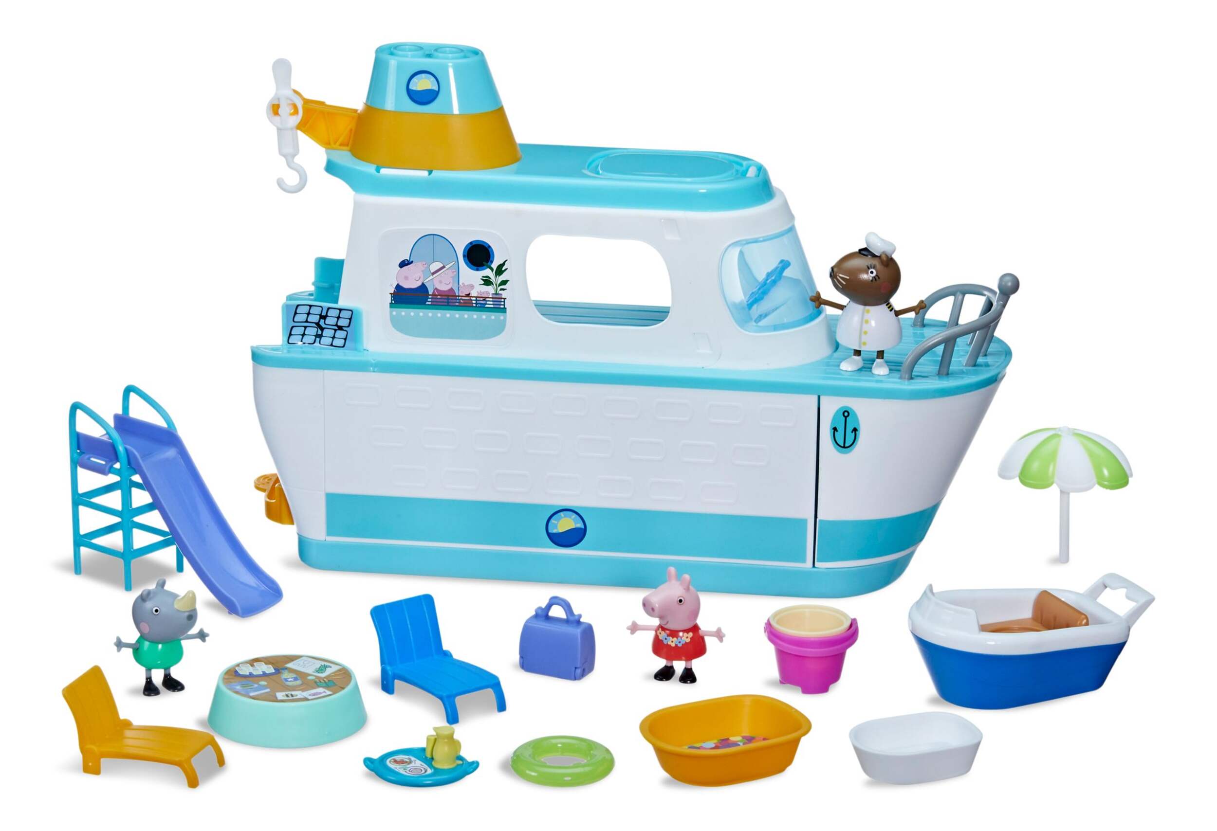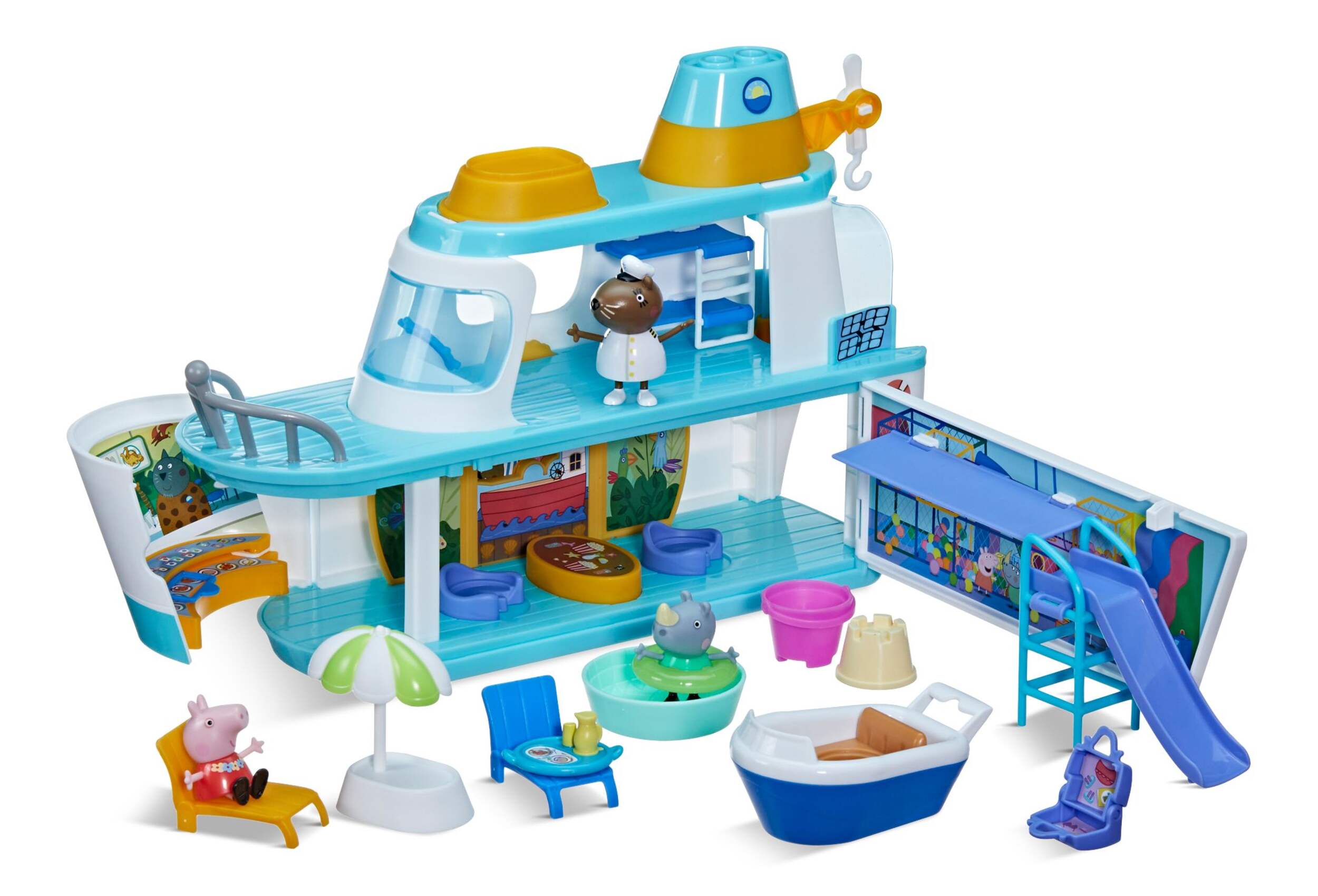 MULTILEVEL PEPPA PIG PLAYSET: Peppa's going on a cruise! The ship playset opens up to reveal lots of imagination possibilities, with 3 levels, lots of play areas and accessories, and 3 figures! (Not intended for water.)