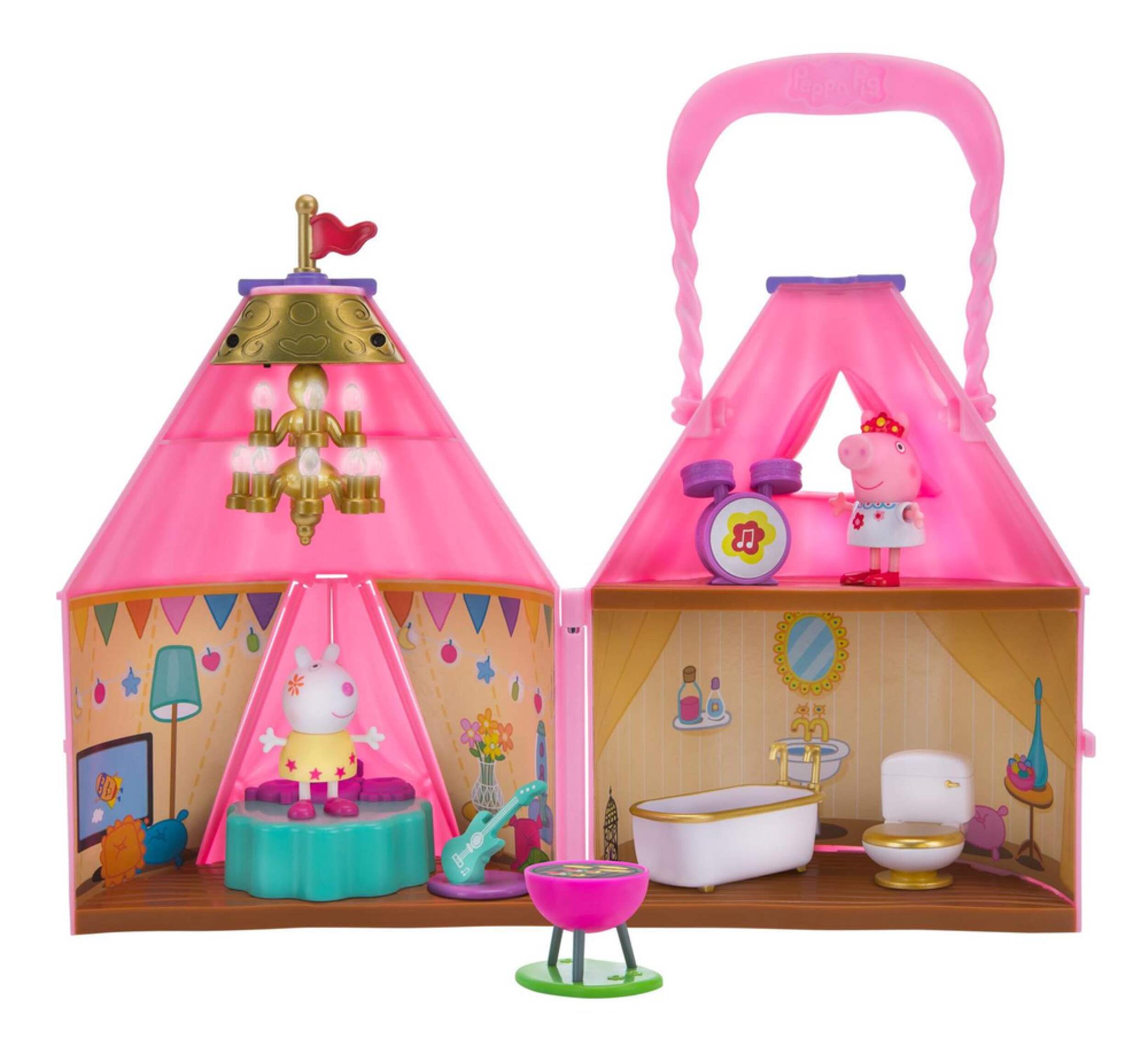 Includes 9 pieces; Glamping Tent, Peppa Pig, Suzy Sheep, Bed, Drum Set, Guitar, BBQ, Bathtub and Toilet