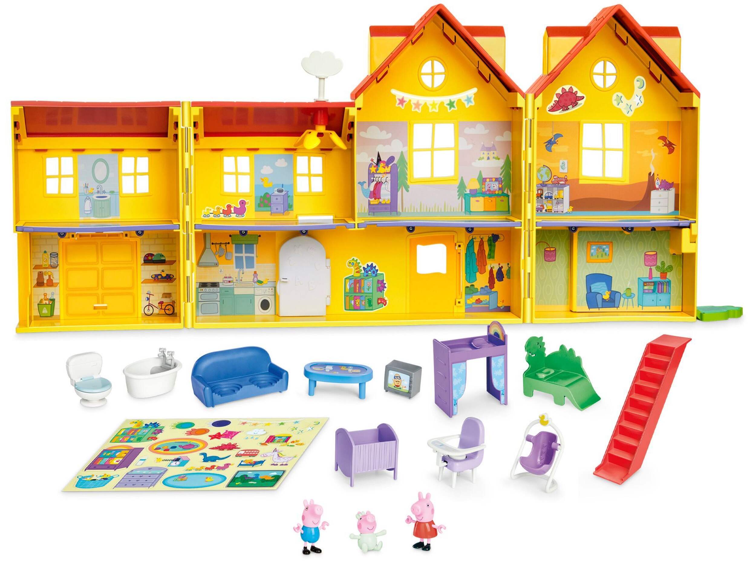 Packed with accessories to set up the doll house with a dino bed for George, a rainbow bed for Peppa, stairs that can be flipped into a slide, a toilet that opens, and more