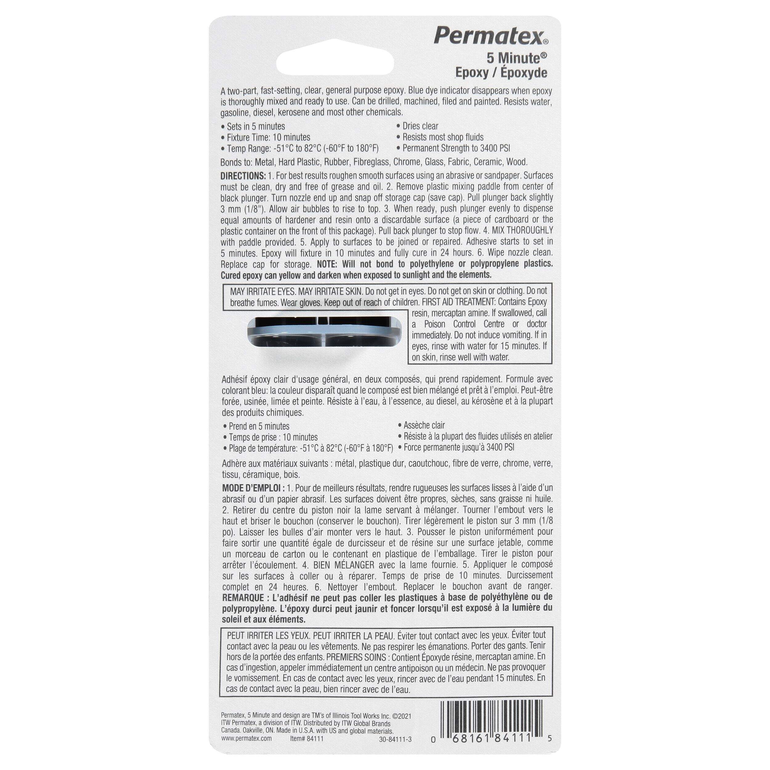 Versatile, easy-to-use, general purpose epoxy is a two-part adhesive and filler system. Sets in five minutes, no clamping needed. Clear appearance. Fills gaps and will not shrink. Resistant to water and solvents. Temperature range -60°F to 180°F (-51°C to 82°C). Permanent strength up to 3400 PSI.