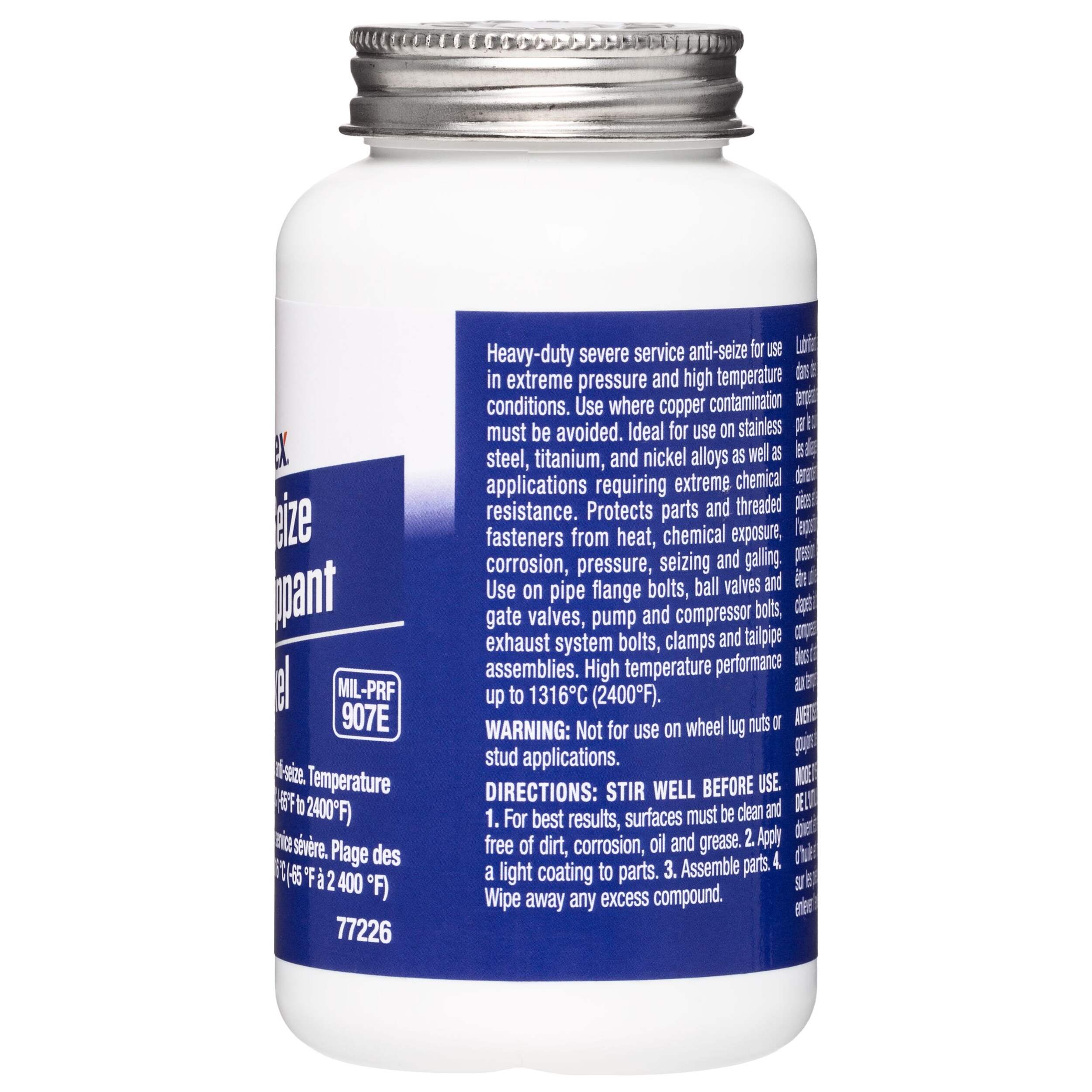 The Permatex High-Temperature Nickel Anti-Seize Lubricant effectively withstands extreme pressure and temperatures up to 1315°C (2400°F). Resistant to most chemical, acid solutions, road salt, salt water and steam, it is recommended for stainless steel, titanium and nickel alloys. This lubricant inhibits rusting, cold welding and galvanic corrosion while preventing galling during assembly. It also allows for easy disassembly, making it a versatile solution for high-temperature applications requiring durable lubrication and protection.