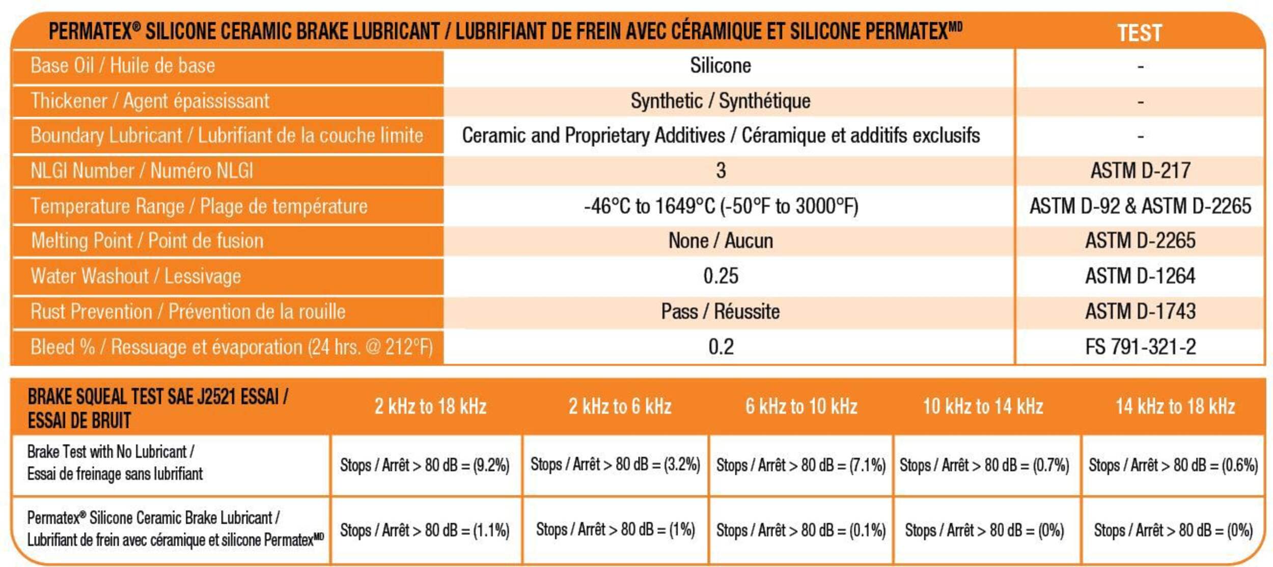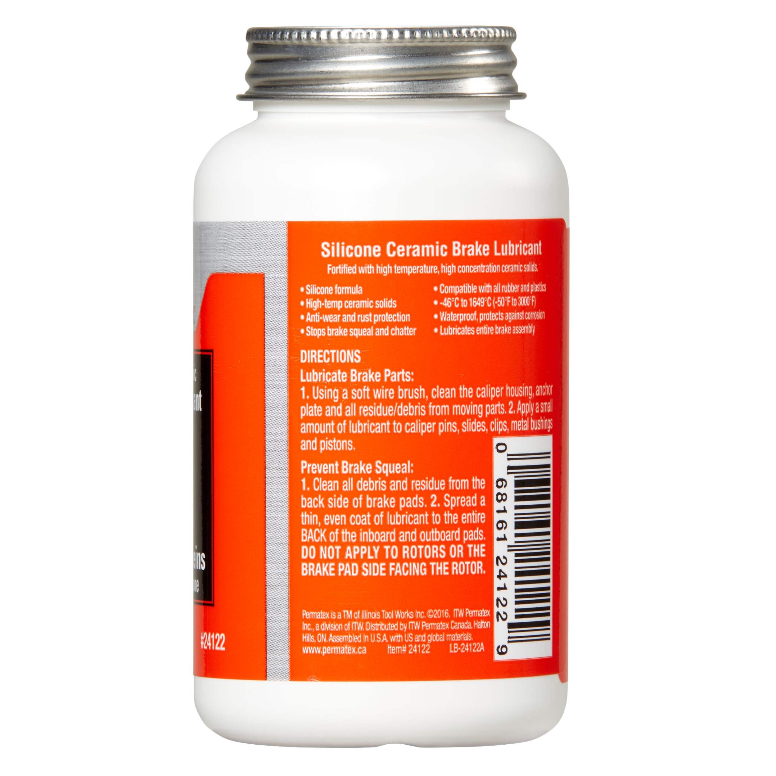 Permatex Orange Silicone Ceramic Brake Lubricant provides high-performance lubrication to caliper pins, sleeves, bushings and pistons. This high temperature lubricant prevents seizing and galling of critical brake components. The silicone-based formula is non-melting and fortified with ceramic solids. Temperature range -50° F to 3000° F (-46° C to 1649° C). Lasts longer than ordinary Caliper Grease and Disc Brake Quiet products. 100% compatible with internal/external brake rubber and plastic hardware, including ethylene-propylene rubber and metal components.