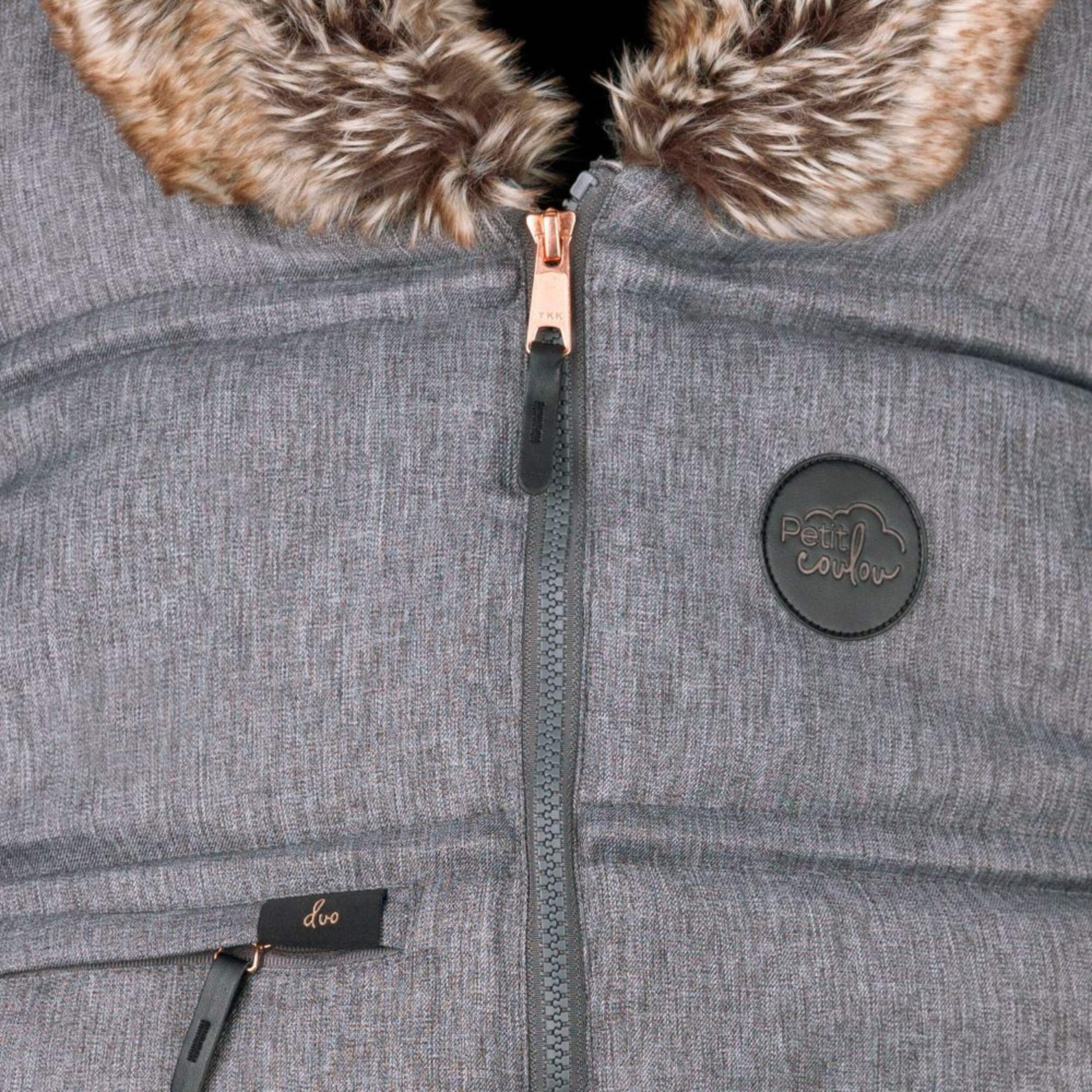 The Petit Coulou 3 Seasons Baby Car Seat Cover in Graphite offers breathable comfort for your little one. This mid-season coat has a removable liner to meet fall, winter, and spring needs. The unique patented design features integrated rods for structure to prevent sagging. Made of hypoallergenic and water-repellent fabric, this cover allows air circulation and regulates temperature while keeping the baby warm. With an igloo effect and vegan fur, it ensures direct contact between the harness and the baby. Easy to install and remove thanks to its elastic base, this cover is designed for temperatures ranging from -30 ̊C to 15 ̊C. Suitable from September to May, the Petit Coulou car seat cover provides comfort and warmth in your baby's car seat.