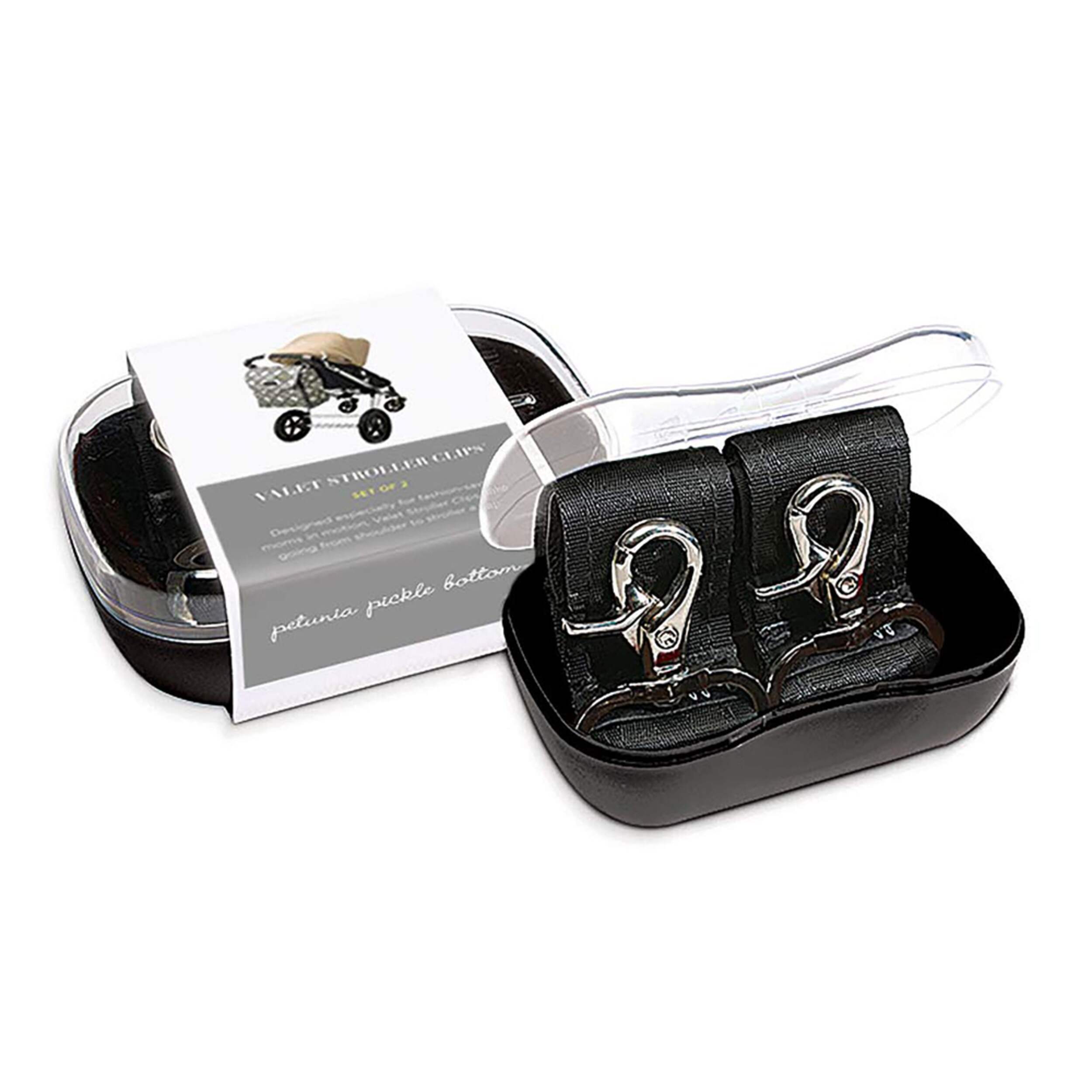 The Petunia Pickle Bottom Valet Stroller Clips, Silver/Black, offer ultimate convenience to parents on the go. The stroller clips instantly transform most diaper bags into stroller bags. Unlike simple stroller hooks, the sturdy non-skid straps fit most stroller handles and securely keep diaper bags in place, so you'll never have to juggle your belongings again. The metal snap-hooks easily attach to diaper bags, while the monogrammed case inside helps organize smaller items, giving you everything you need - all without sacrificing style. Say goodbye to juggling a diaper bag and stroller - with these clips, your bag, and essentials are always within reach.