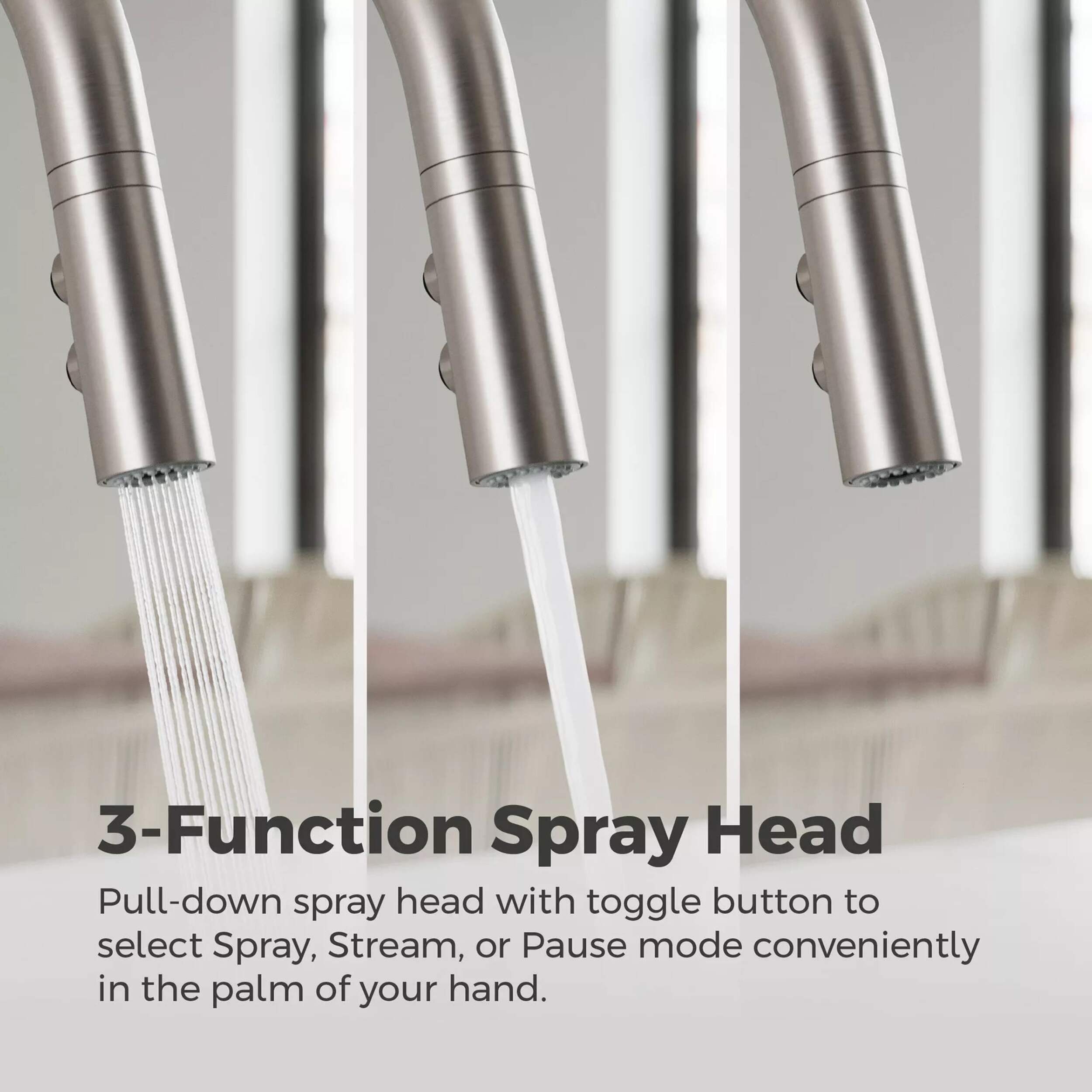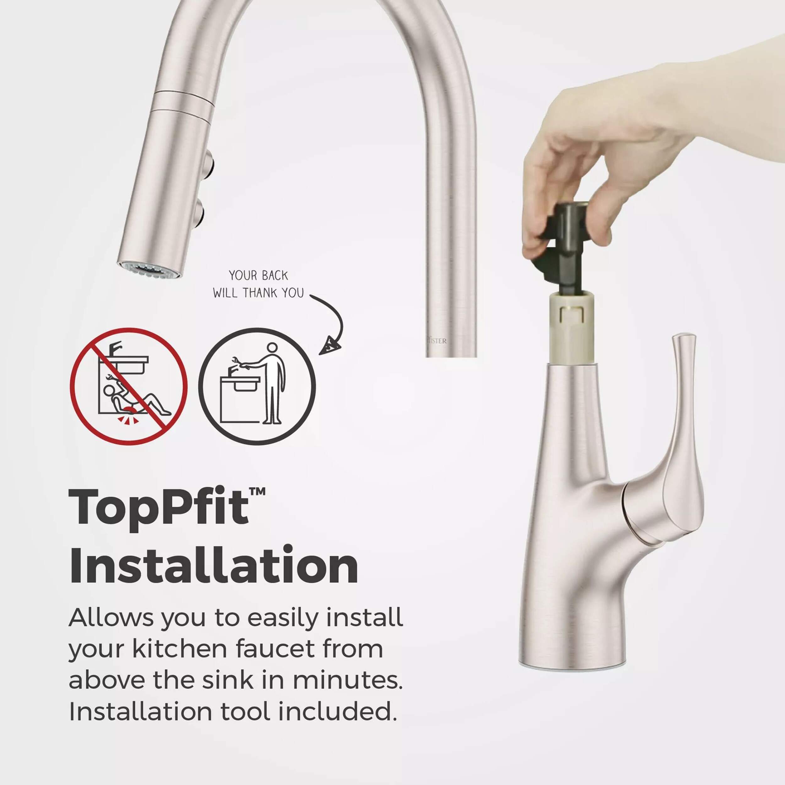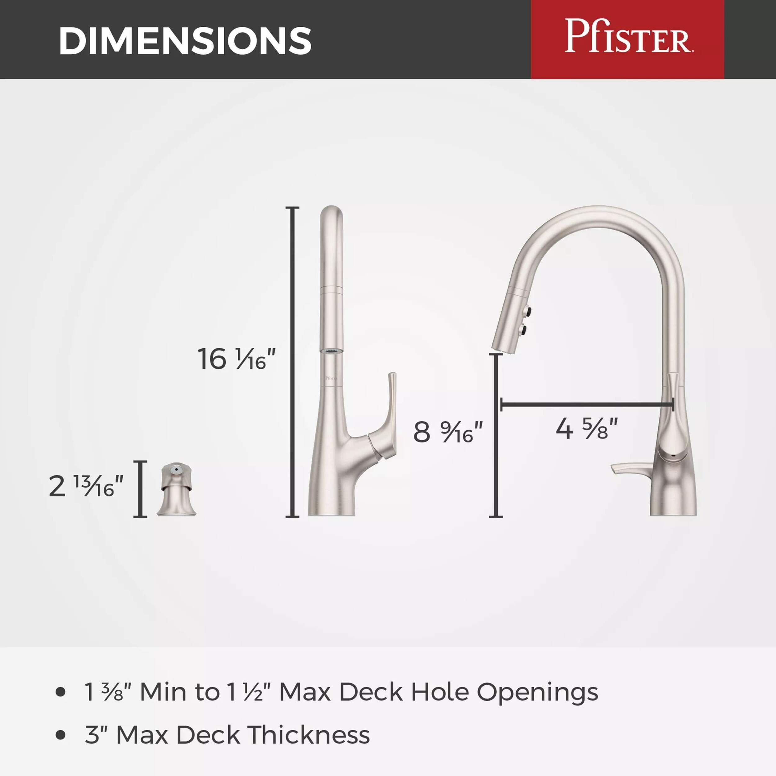 The Pfister Arvada Pull-Down Kitchen Faucet in Stainless Steel combines modern design with practical functionality, making it perfect for any kitchen. With a pull-down spray head, it offers flexible reach and easy maneuverability for various tasks, while the high-arc spout provides ample clearance for larger pots and pans. Durable and easy to install, the Pfister Arvada faucet is designed to enhance both style and efficiency in your kitchen.