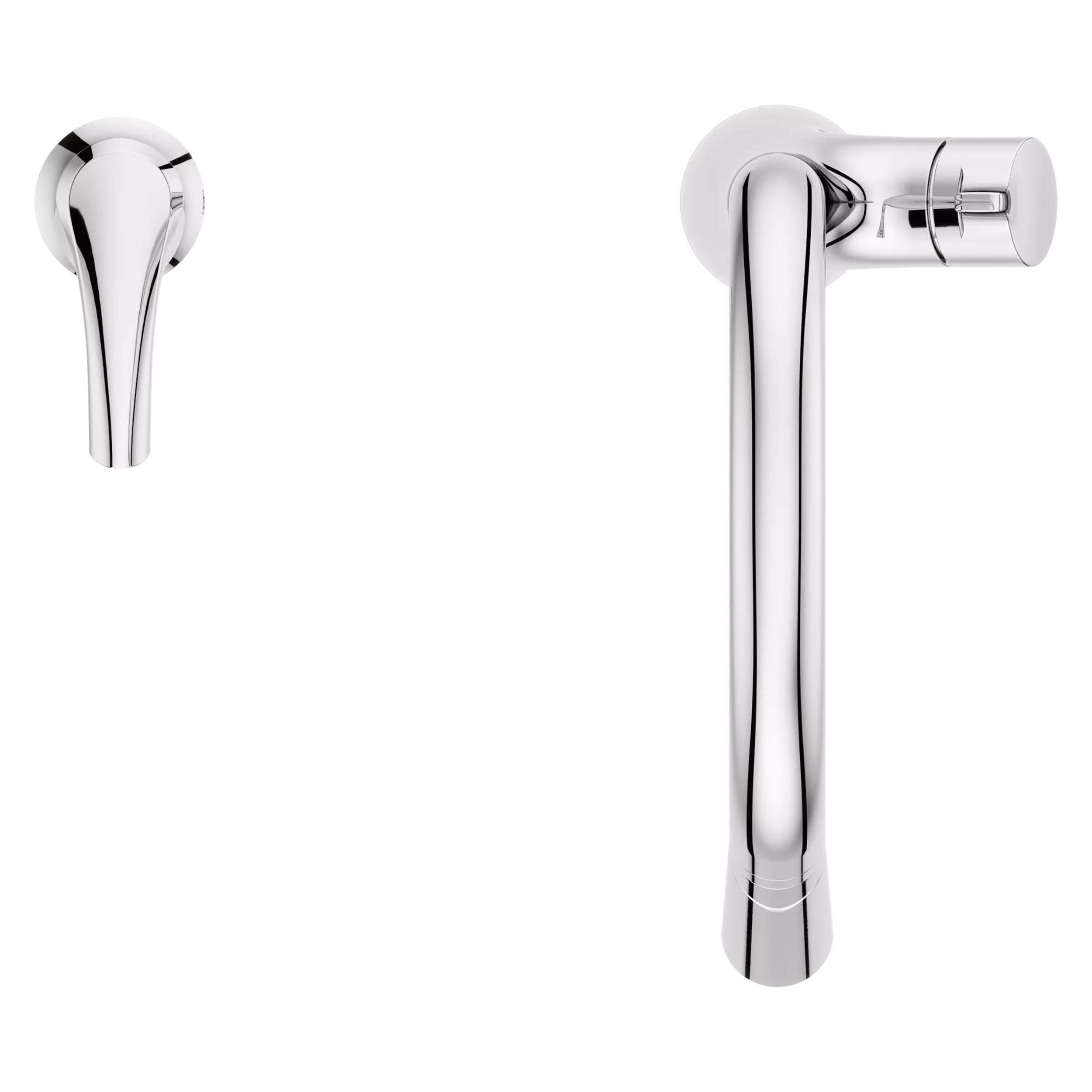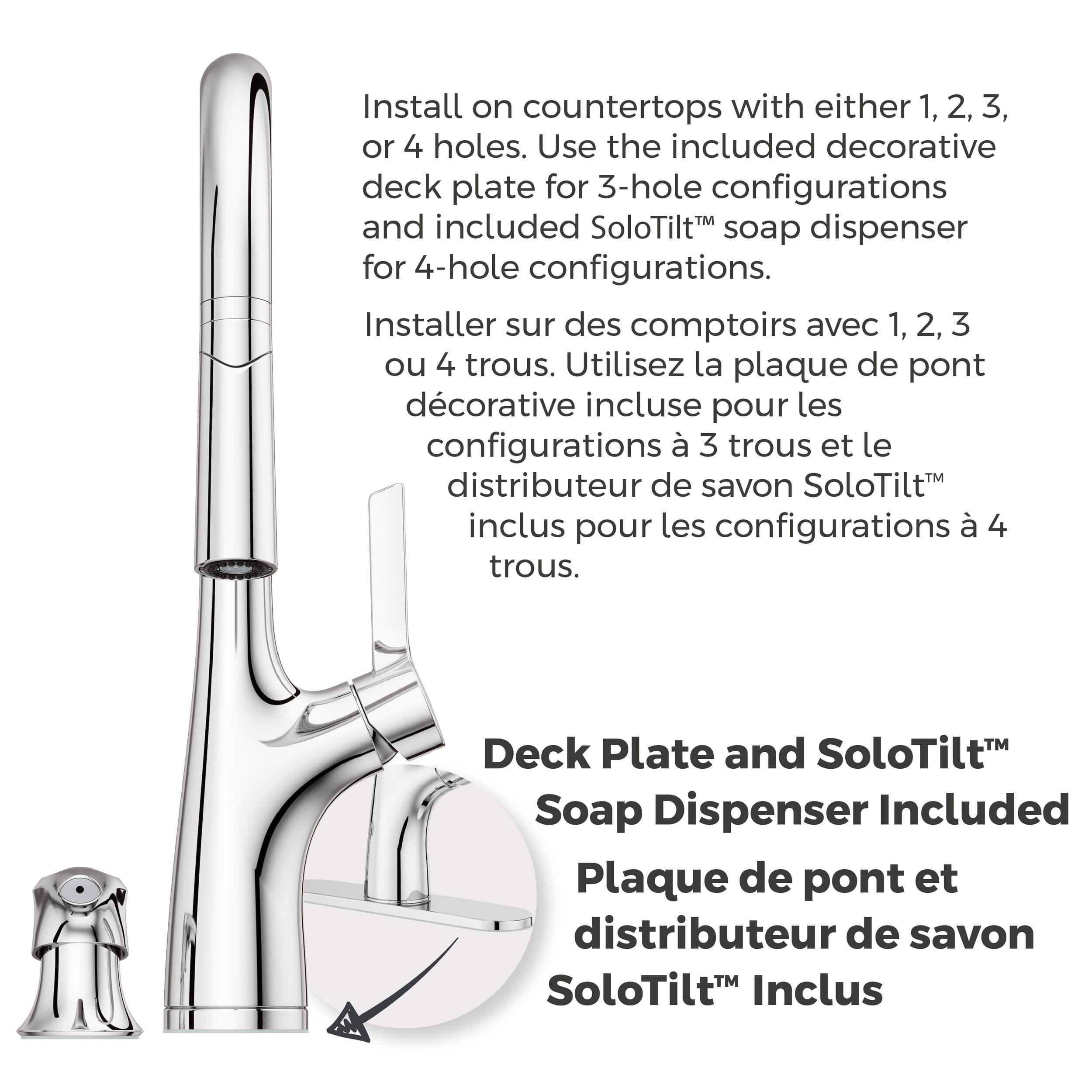 Elegant forward handle design underscores ergonomic function and helps where space behind the faucet is limited
