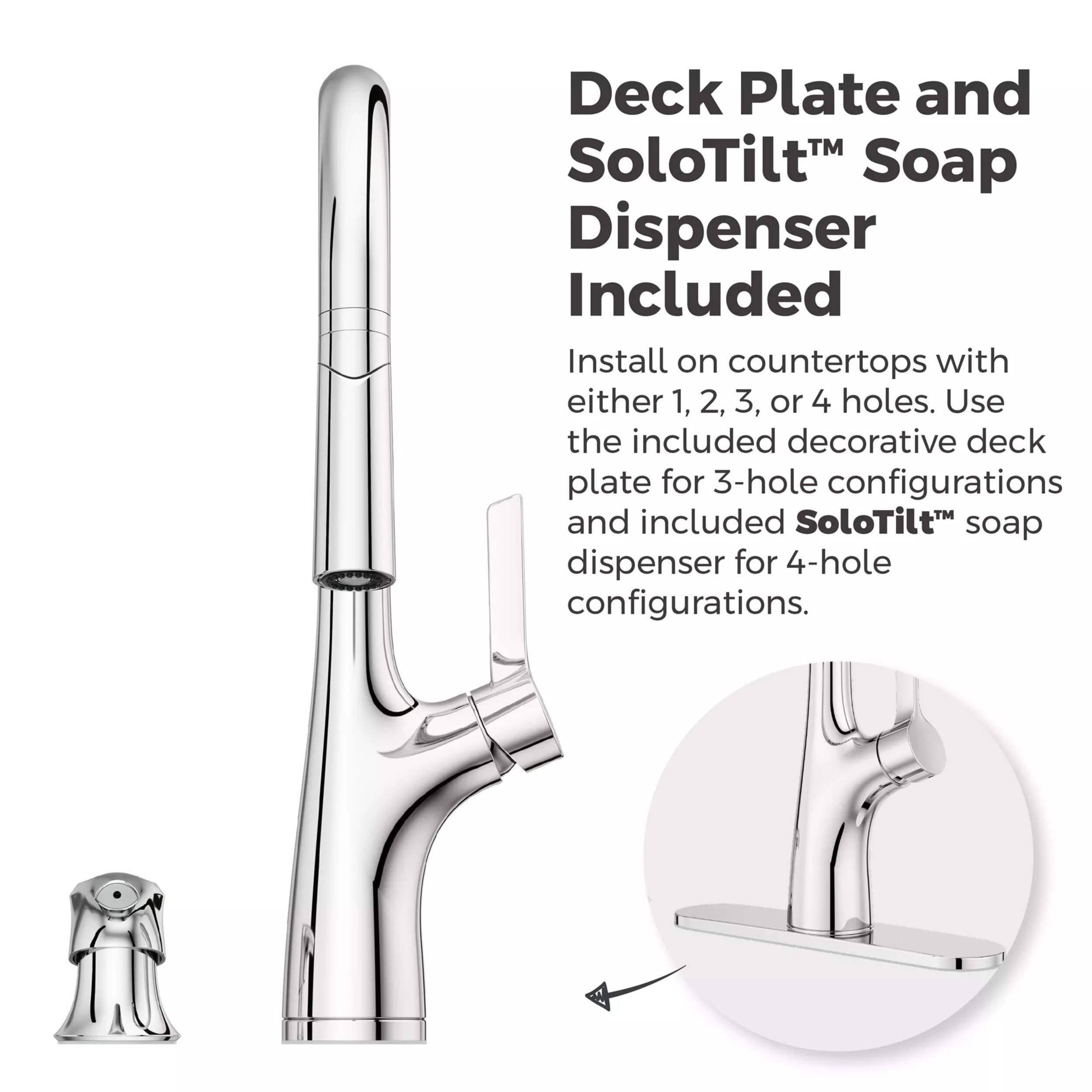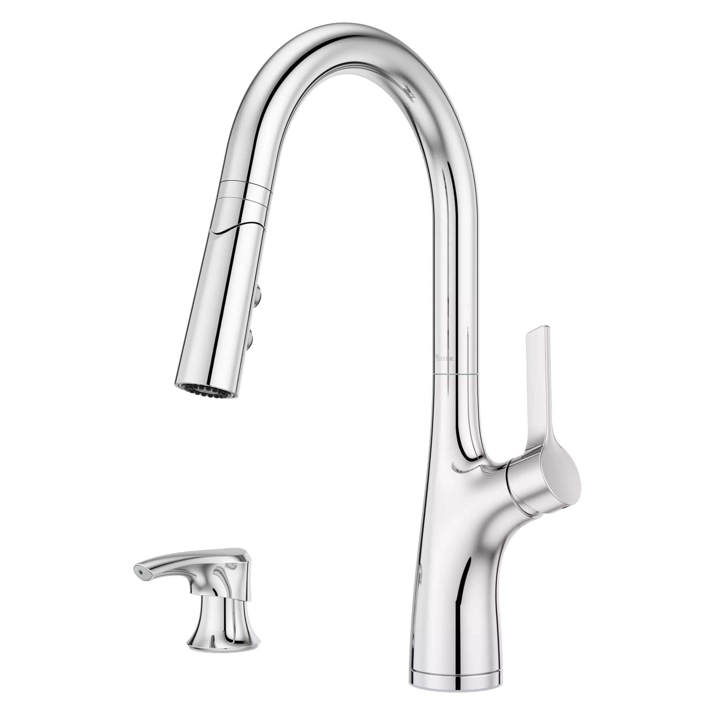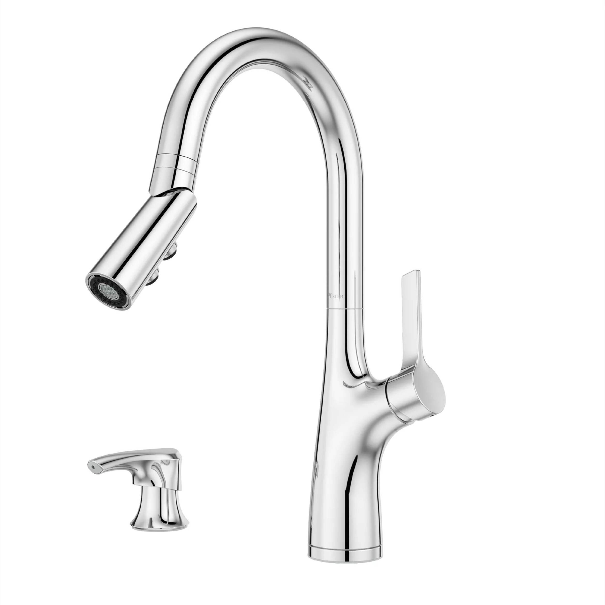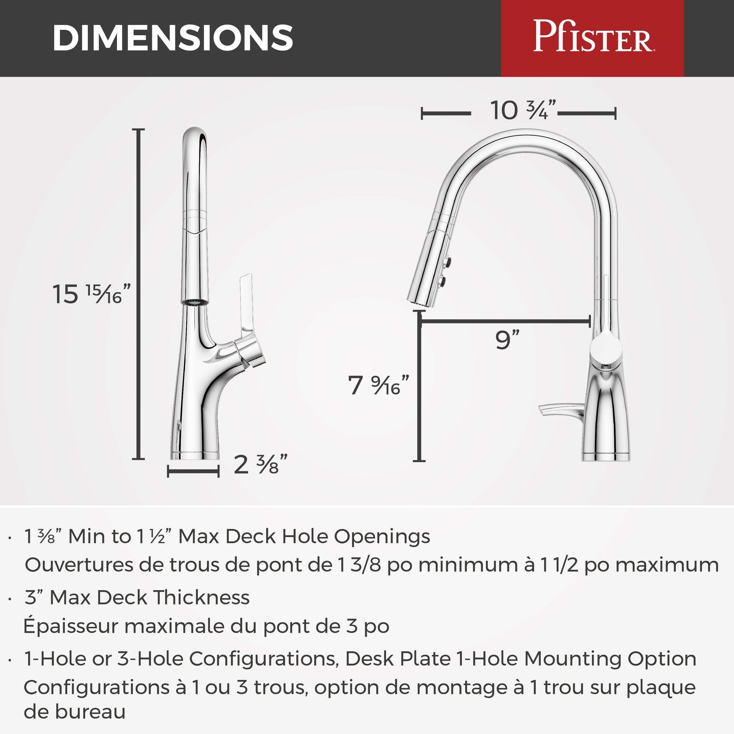 The Pfister Ceylon Pull-Down Kitchen Faucet in Polished Chrome combines elegant style with versatile functionality, making it a sophisticated addition to any kitchen. Featuring a pull-down spray head, this faucet provides extended reach and flexibility for everyday kitchen tasks. Its high-arc spout offers ample clearance for filling large pots, while the polished chrome finish adds a touch of modern shine.