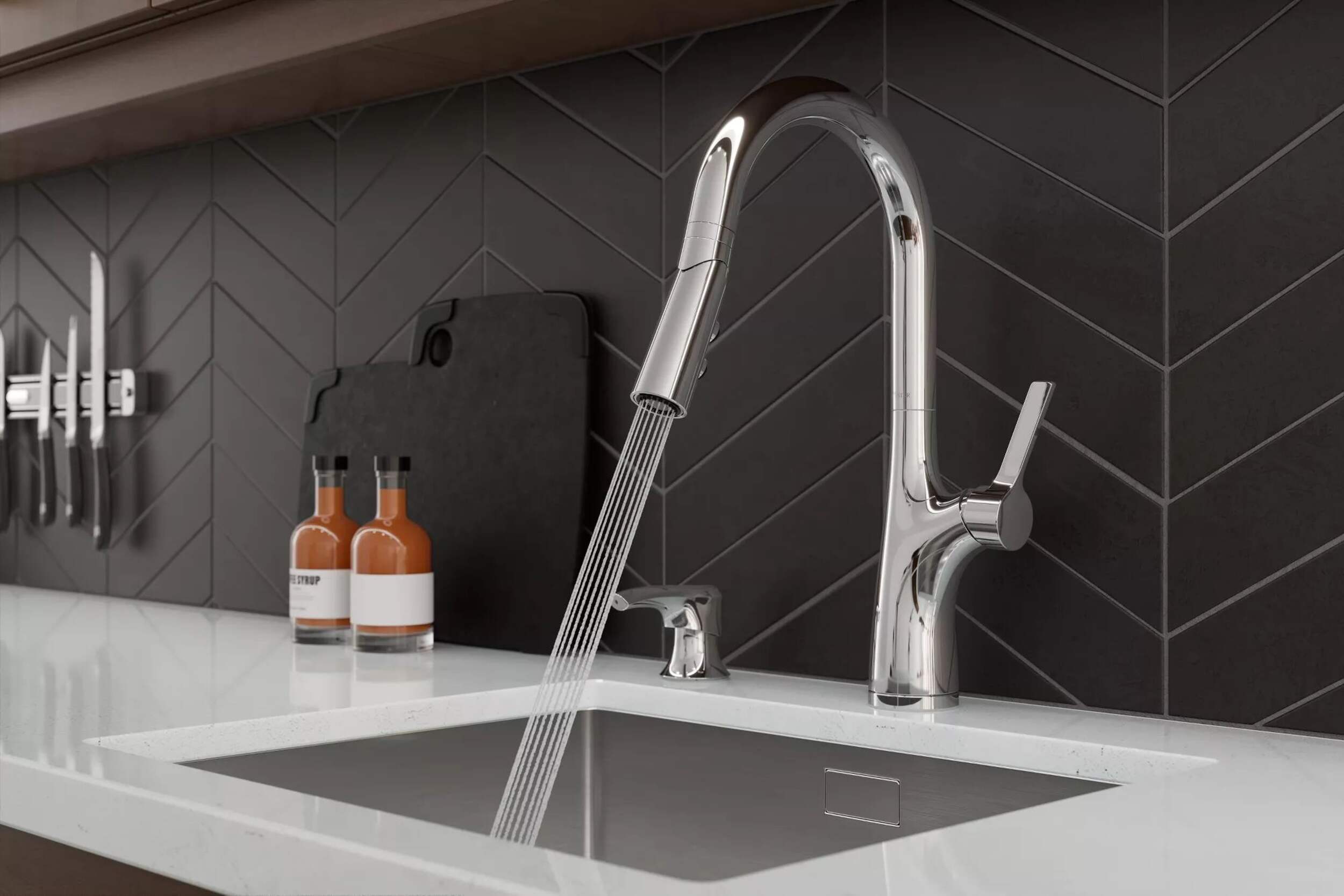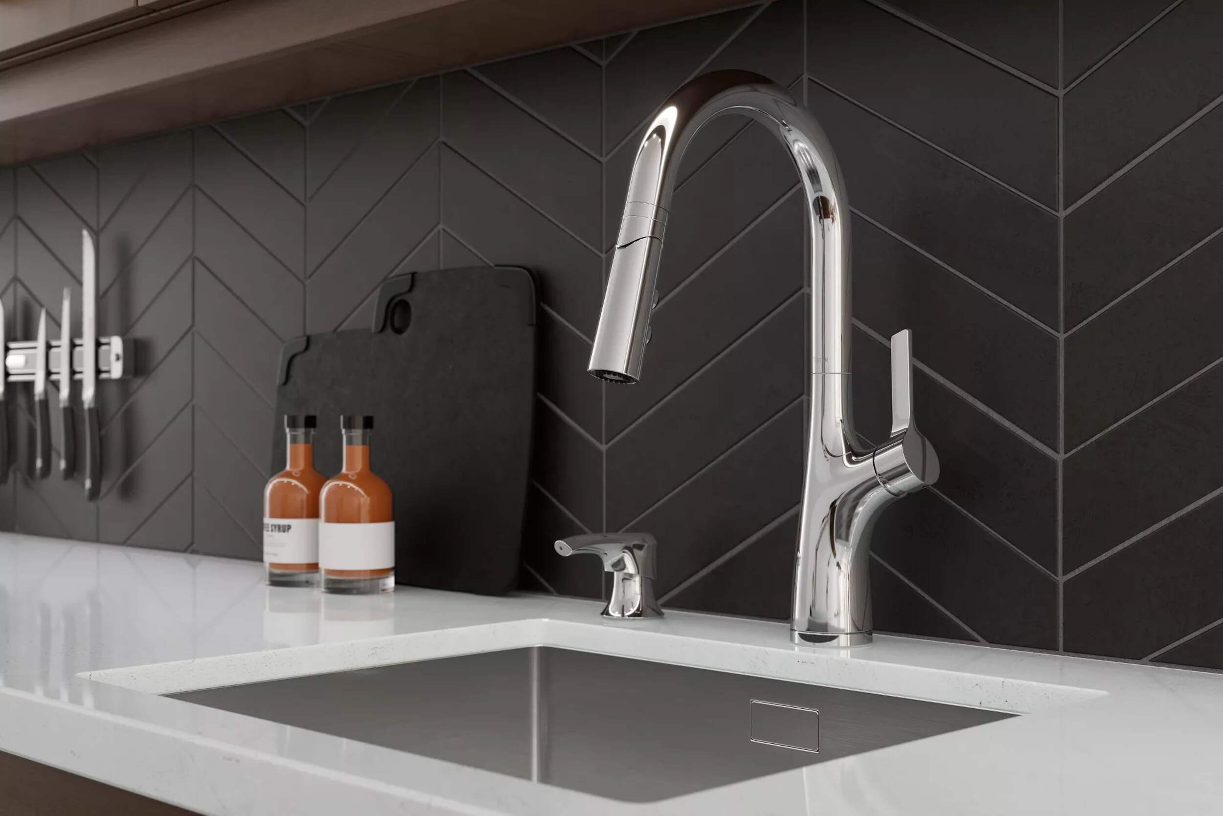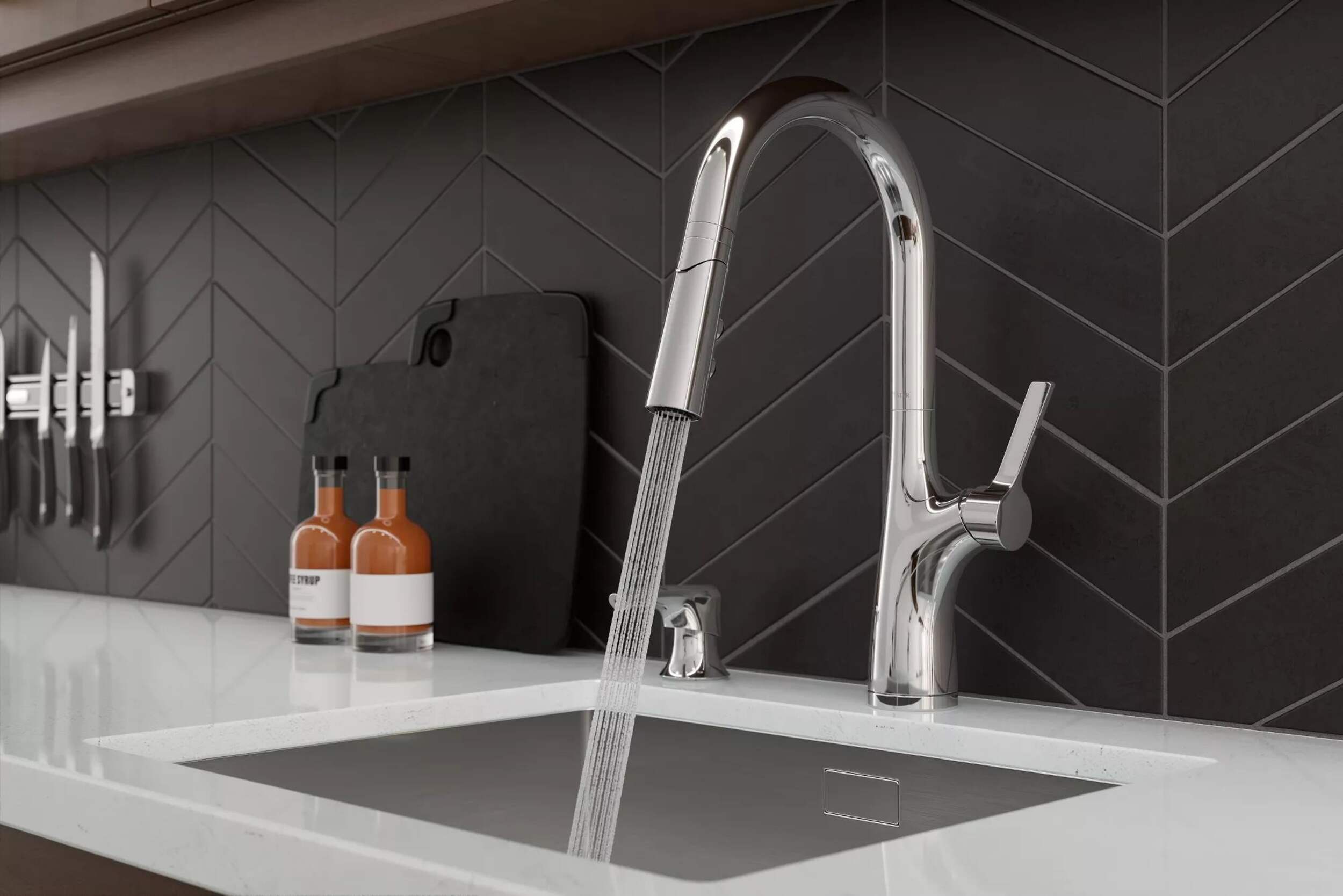 The Pfister Ceylon Pull-Down Kitchen Faucet in Polished Chrome combines elegant style with versatile functionality, making it a sophisticated addition to any kitchen. Featuring a pull-down spray head, this faucet provides extended reach and flexibility for everyday kitchen tasks. Its high-arc spout offers ample clearance for filling large pots, while the polished chrome finish adds a touch of modern shine.