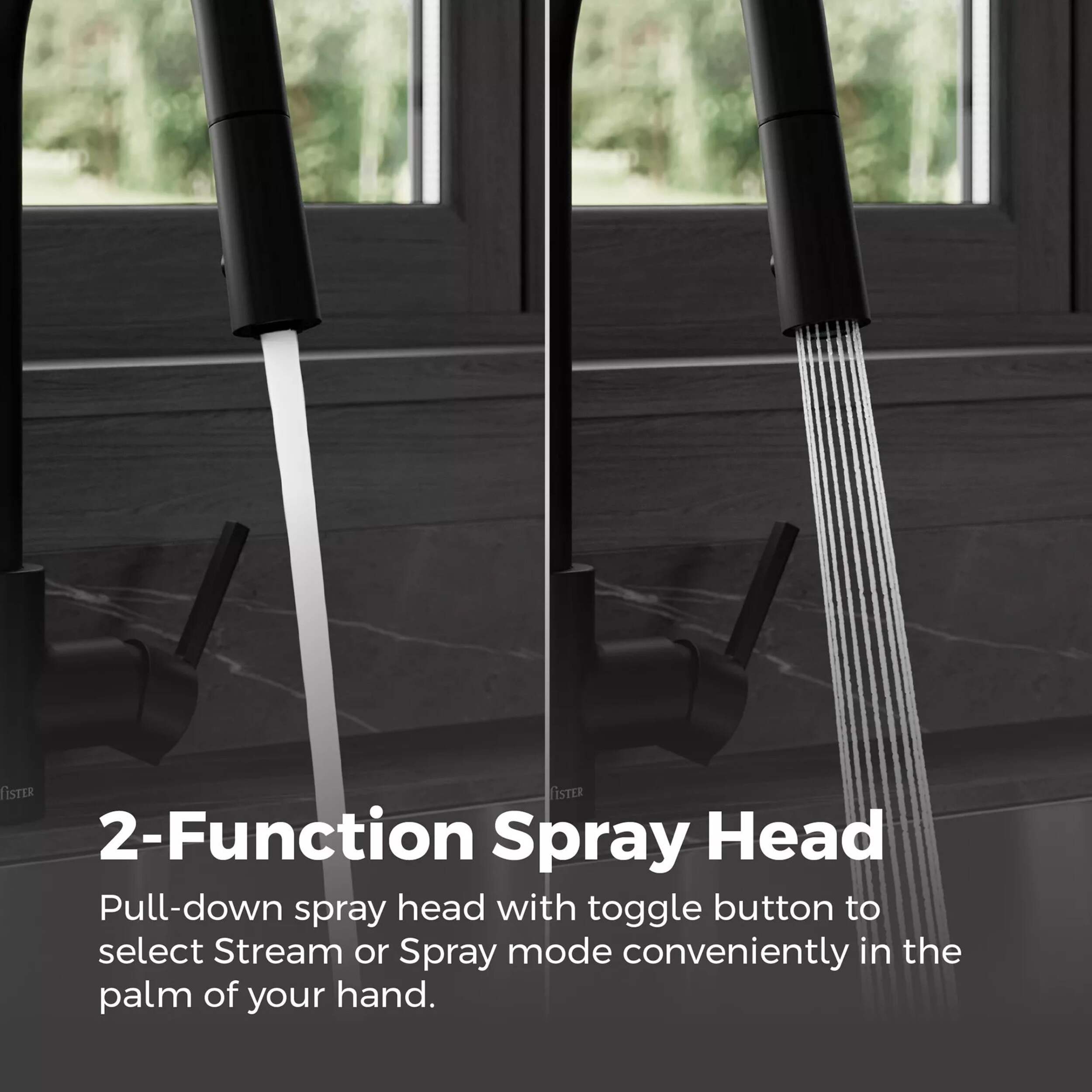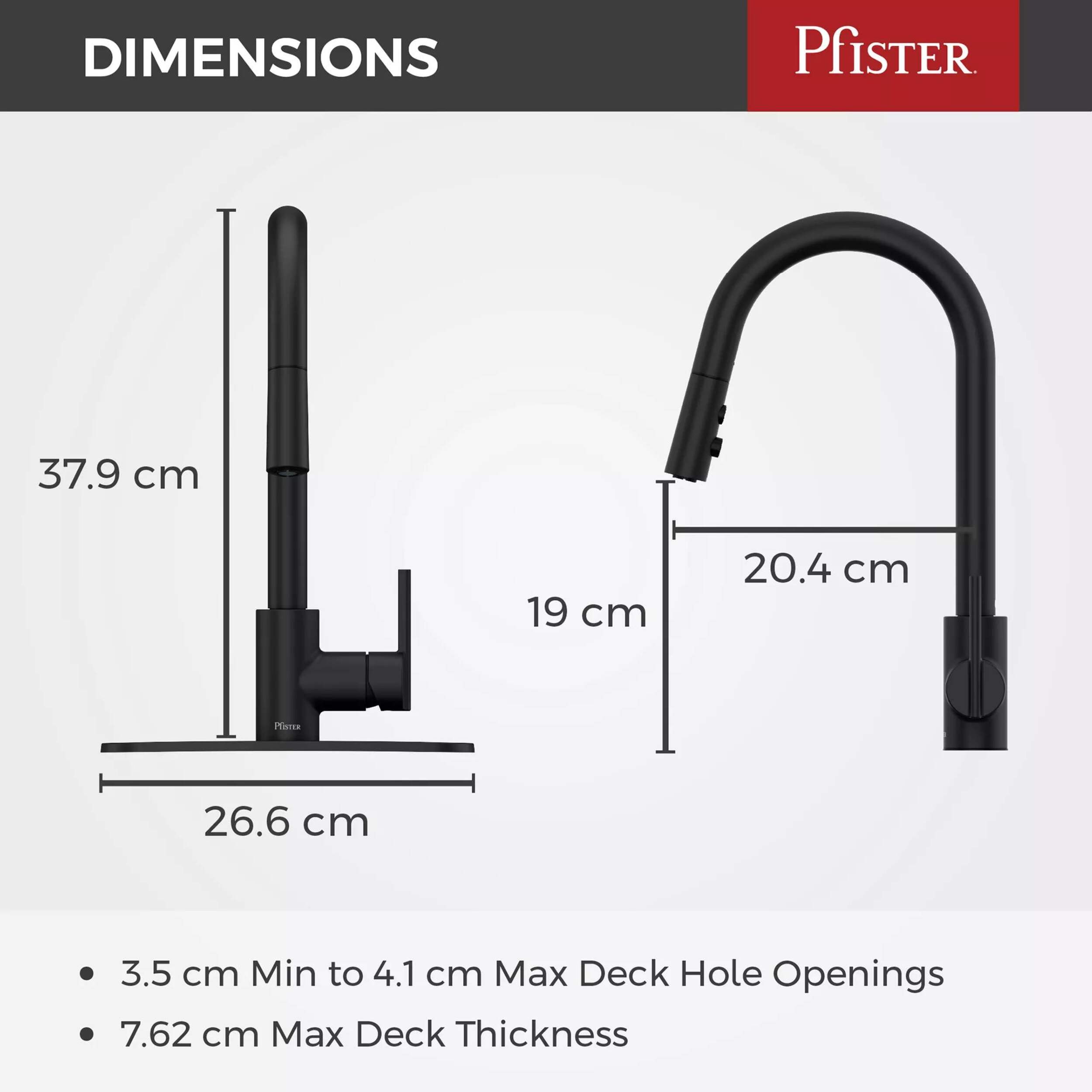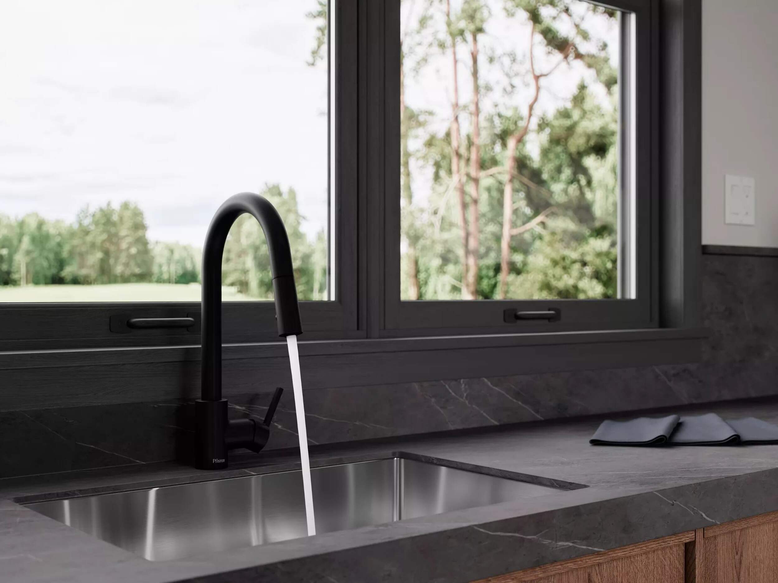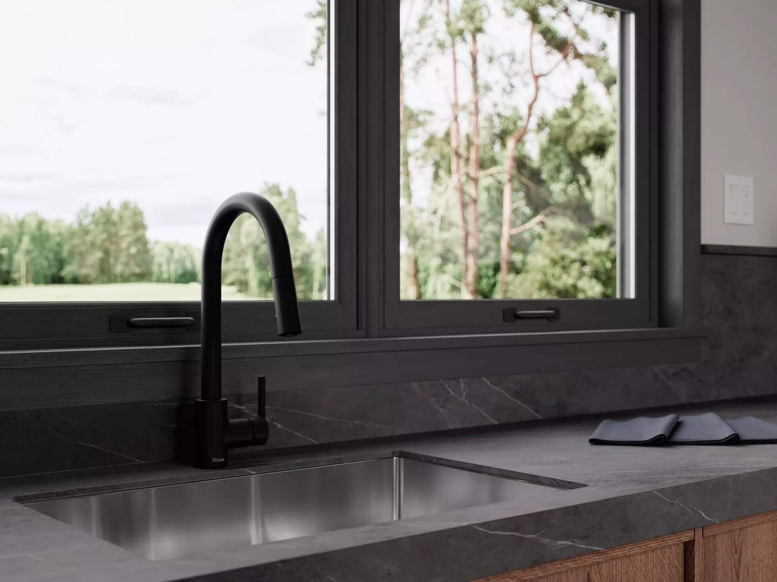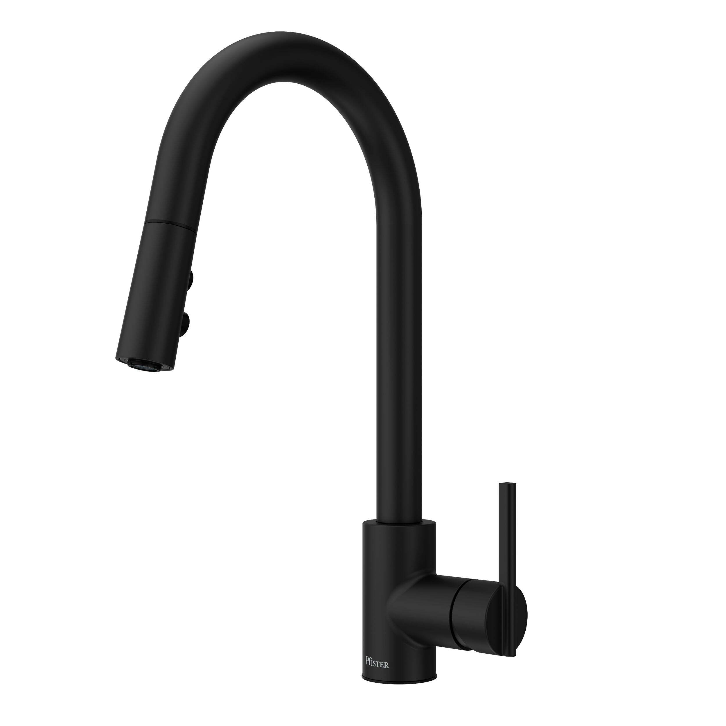 The Pfister Modern Pull-Down Kitchen Faucet in Matte Black combines contemporary style with practical functionality, making it a standout addition to any kitchen. Featuring a sleek pull-down spray head, this faucet provides excellent reach and maneuverability, ideal for various kitchen tasks. The high-arc spout offers ample clearance for larger pots and pans, while the matte black finish adds a sophisticated touch.