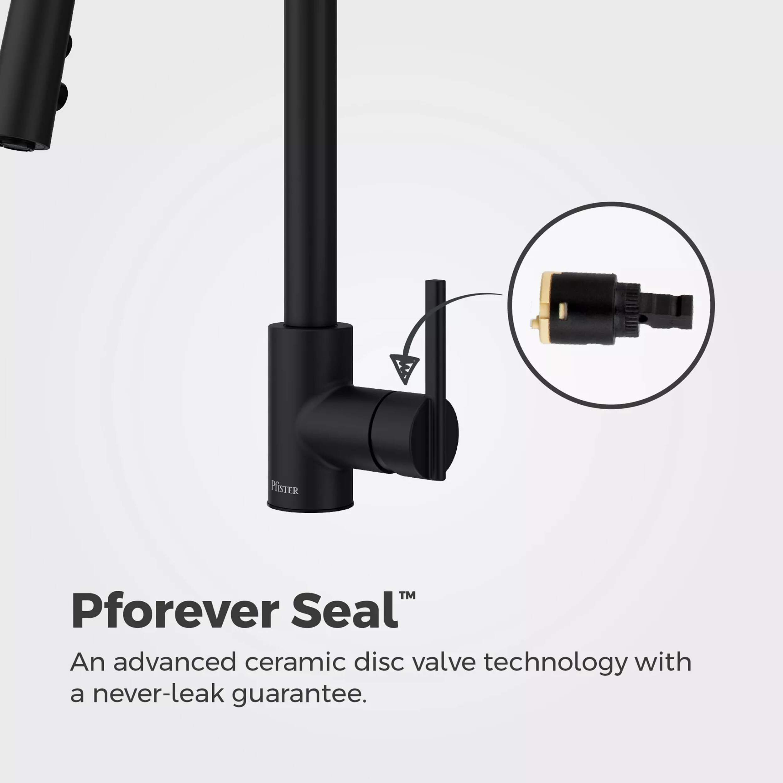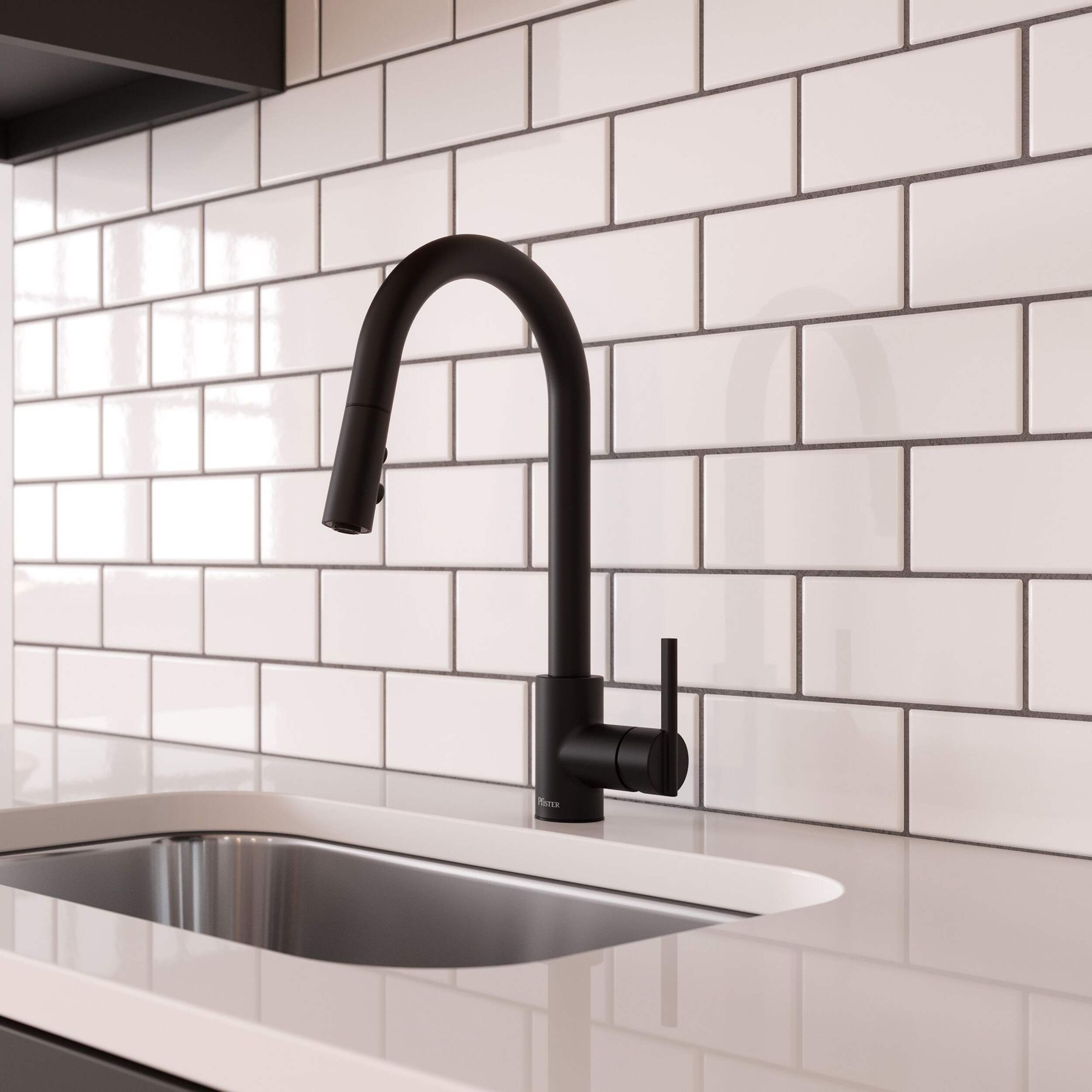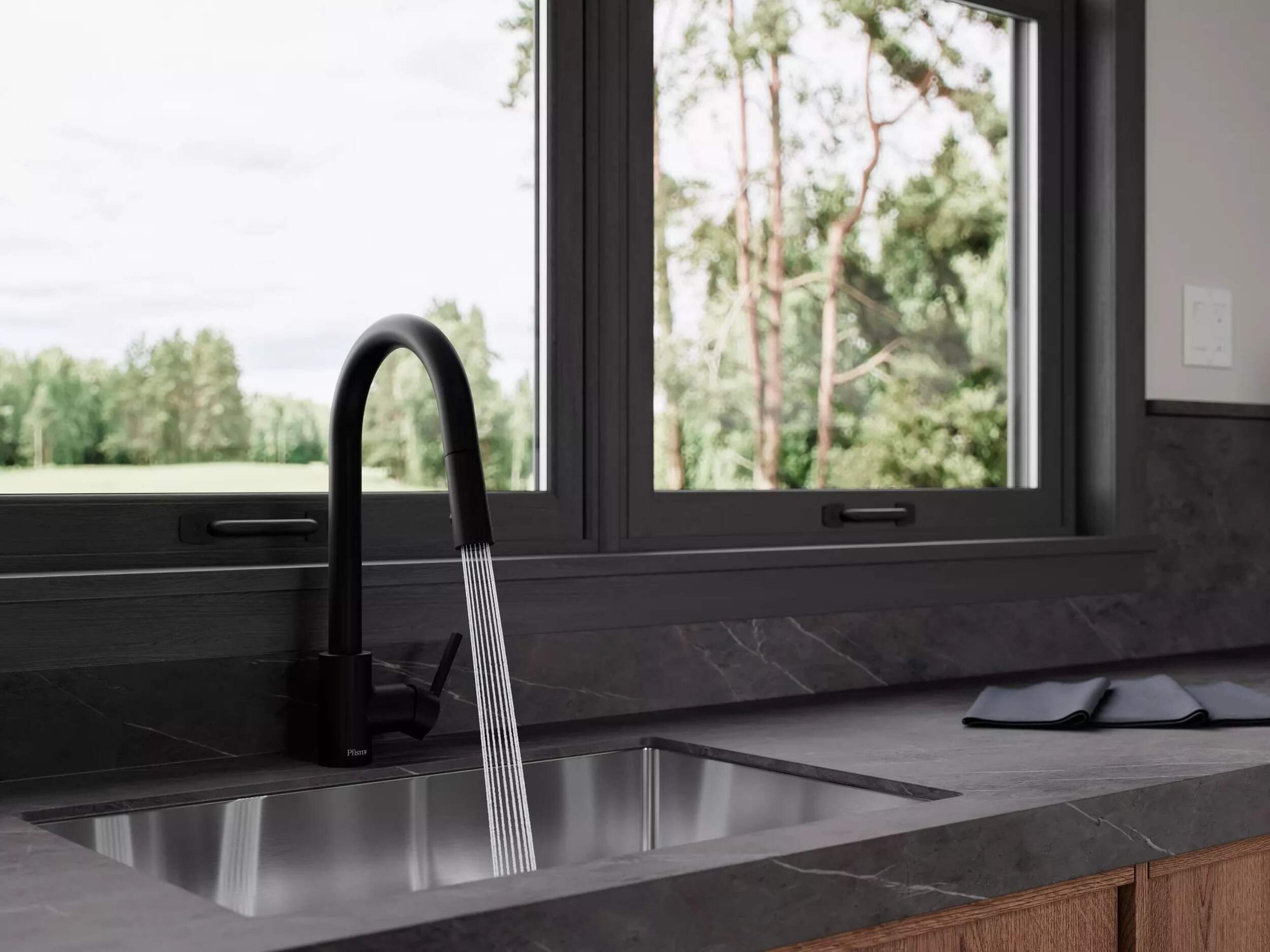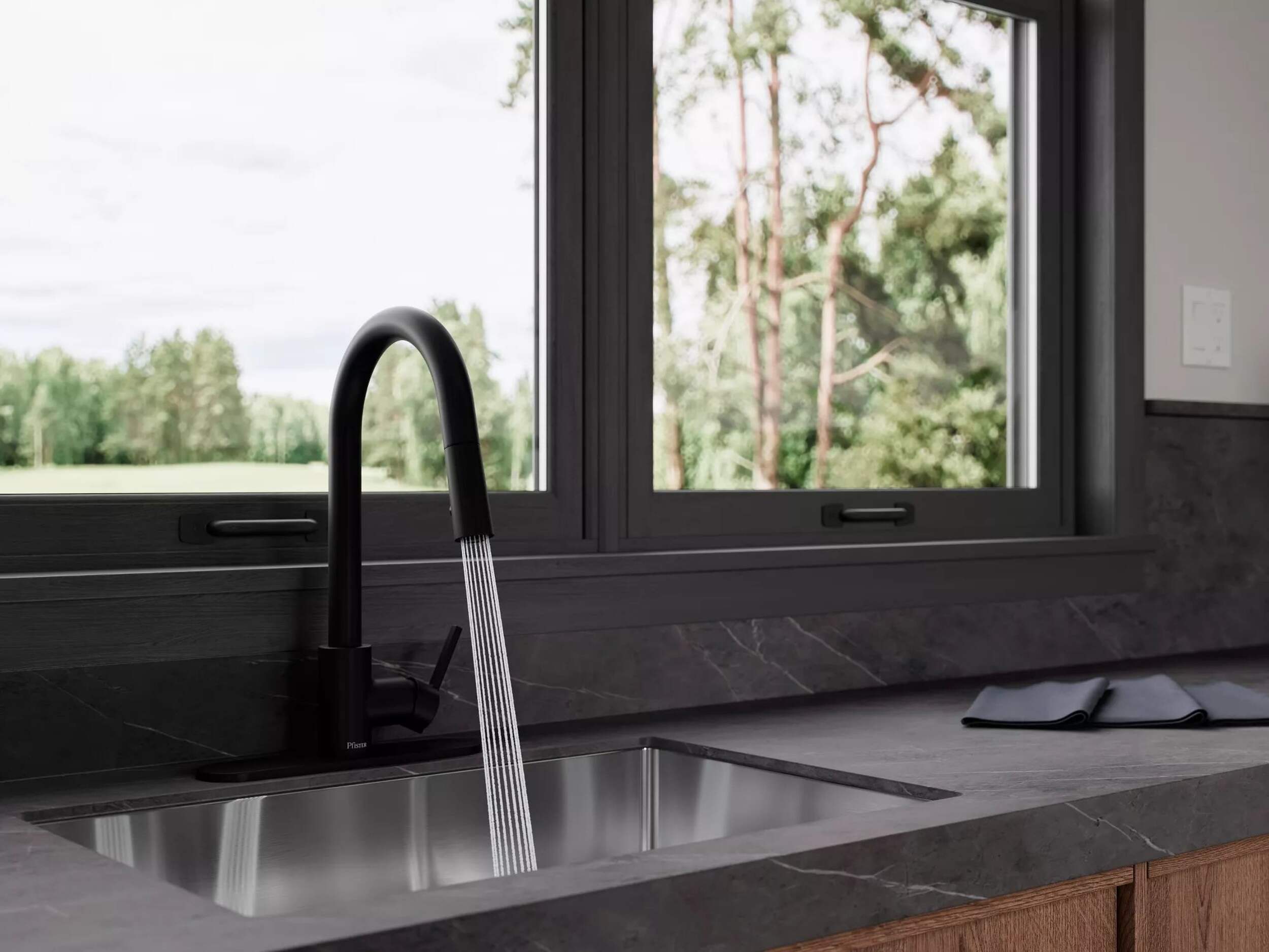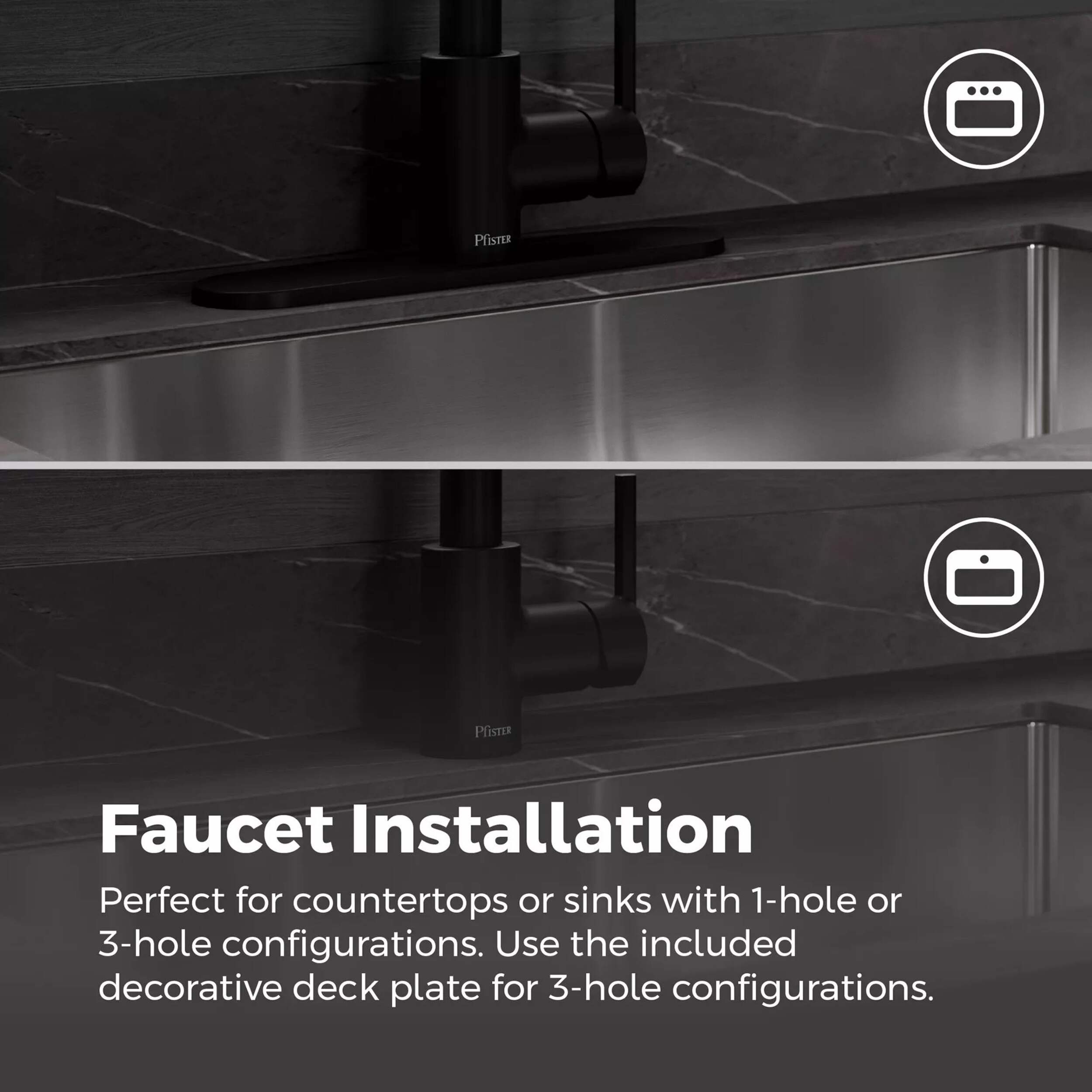 The Pfister Modern Pull-Down Kitchen Faucet in Matte Black combines contemporary style with practical functionality, making it a standout addition to any kitchen. Featuring a sleek pull-down spray head, this faucet provides excellent reach and maneuverability, ideal for various kitchen tasks. The high-arc spout offers ample clearance for larger pots and pans, while the matte black finish adds a sophisticated touch.