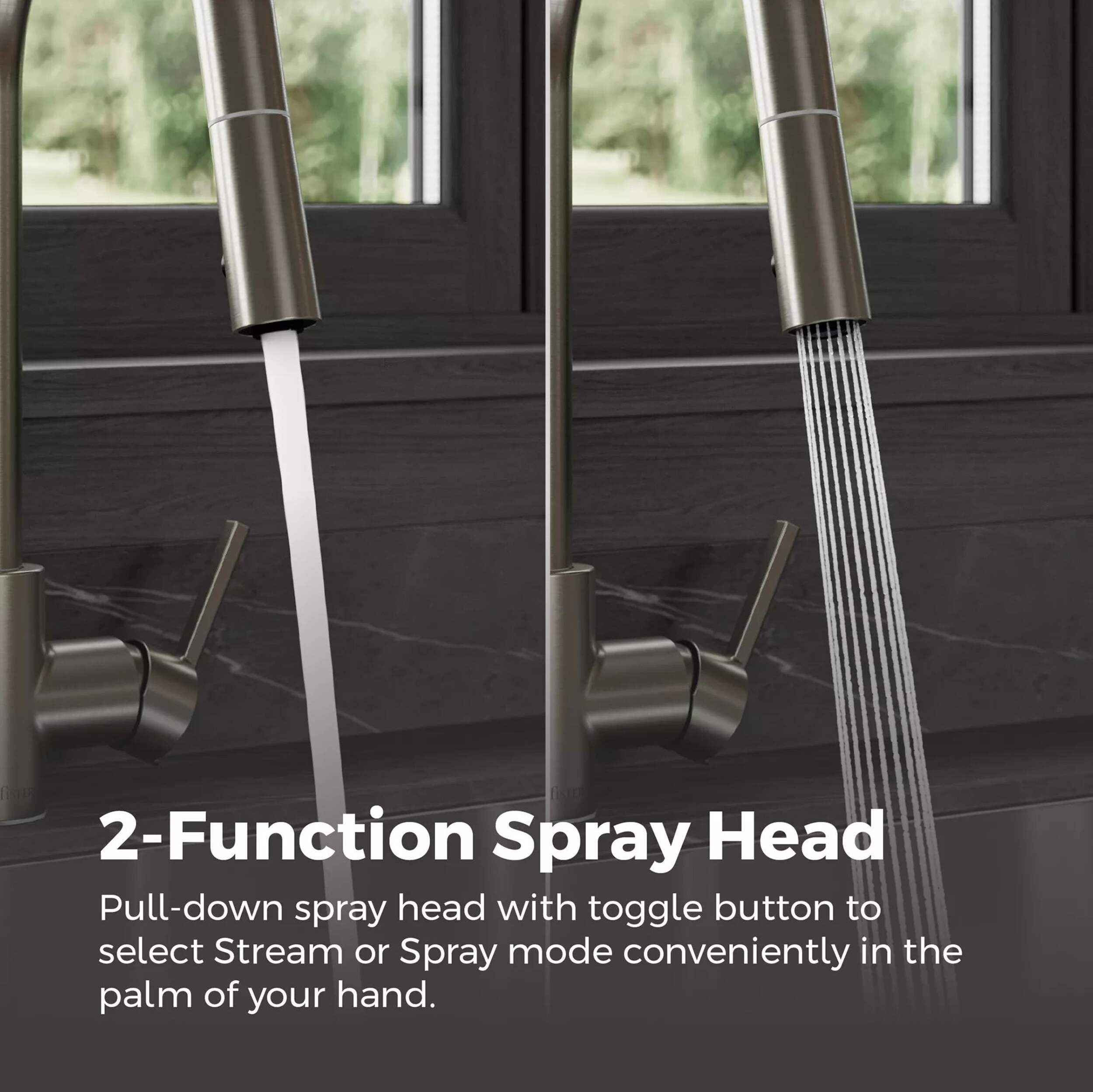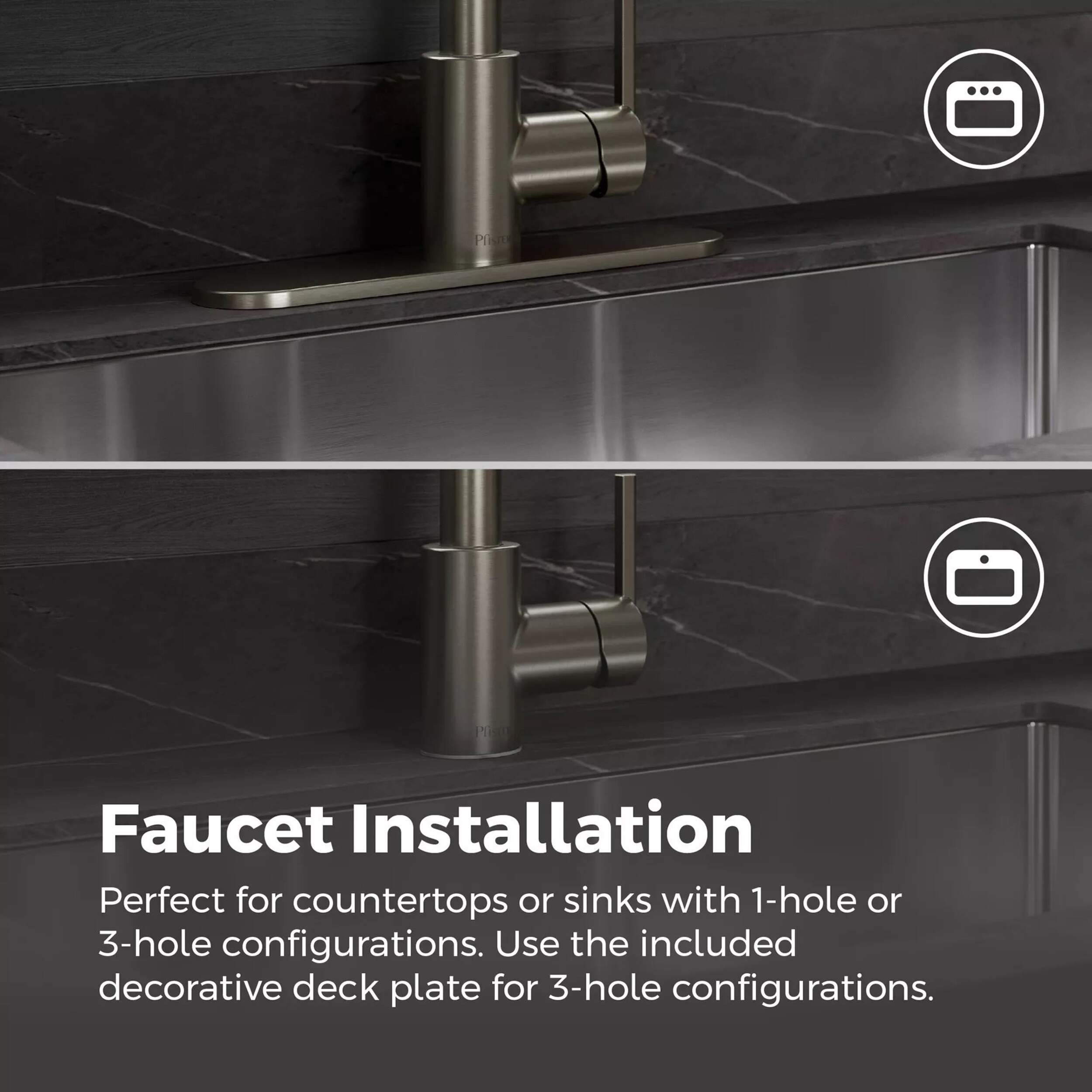 The Pfister Modern Pull-Down Kitchen Faucet in Stainless Steel combines sleek design with everyday functionality, making it an ideal addition to any contemporary kitchen. Featuring a high-arc spout and a flexible pull-down spray head, this faucet provides extended reach and precision for rinsing, washing, and filling large pots. The single-handle design allows smooth water flow and temperature control, while the stainless steel finish resists tarnishing and adds a sophisticated touch.