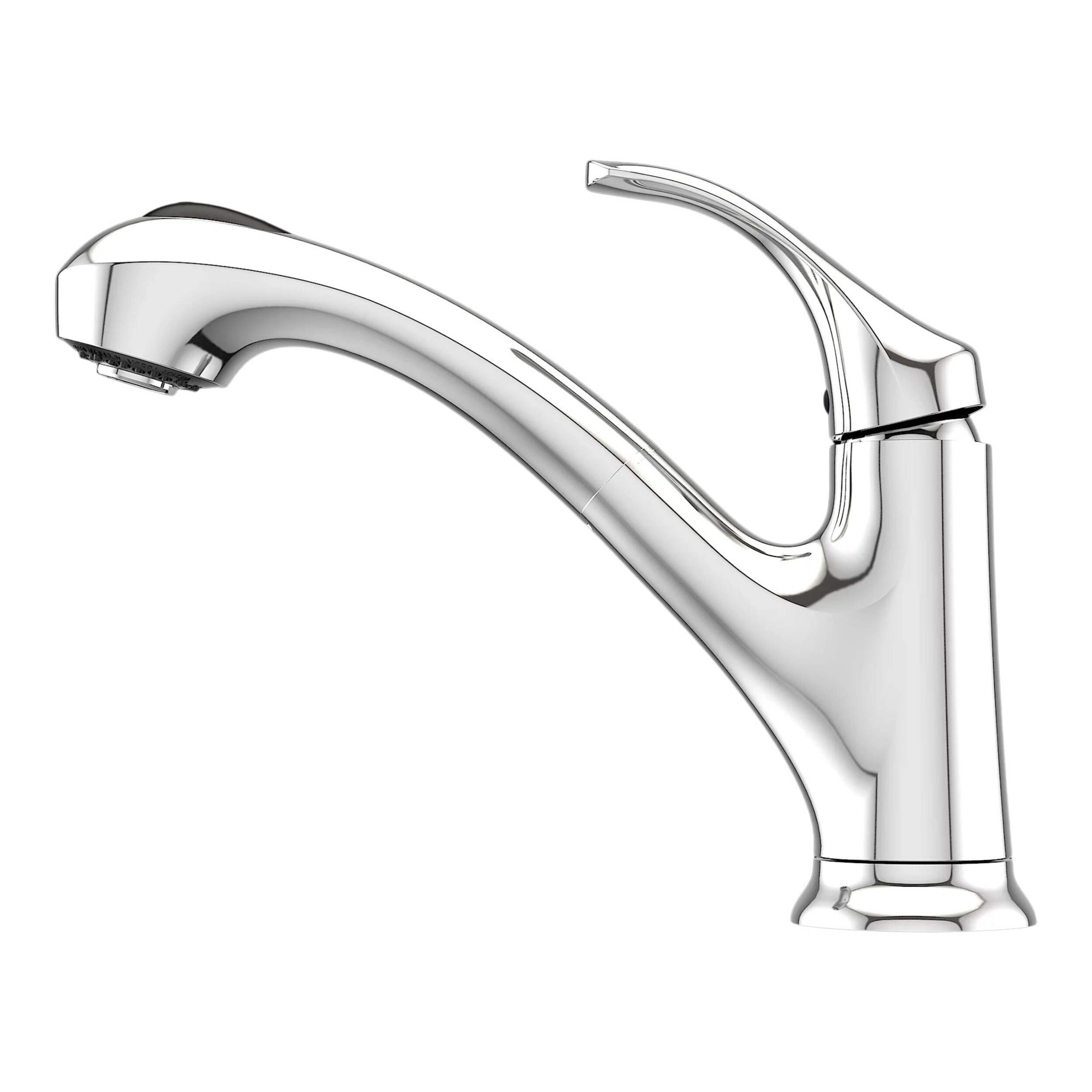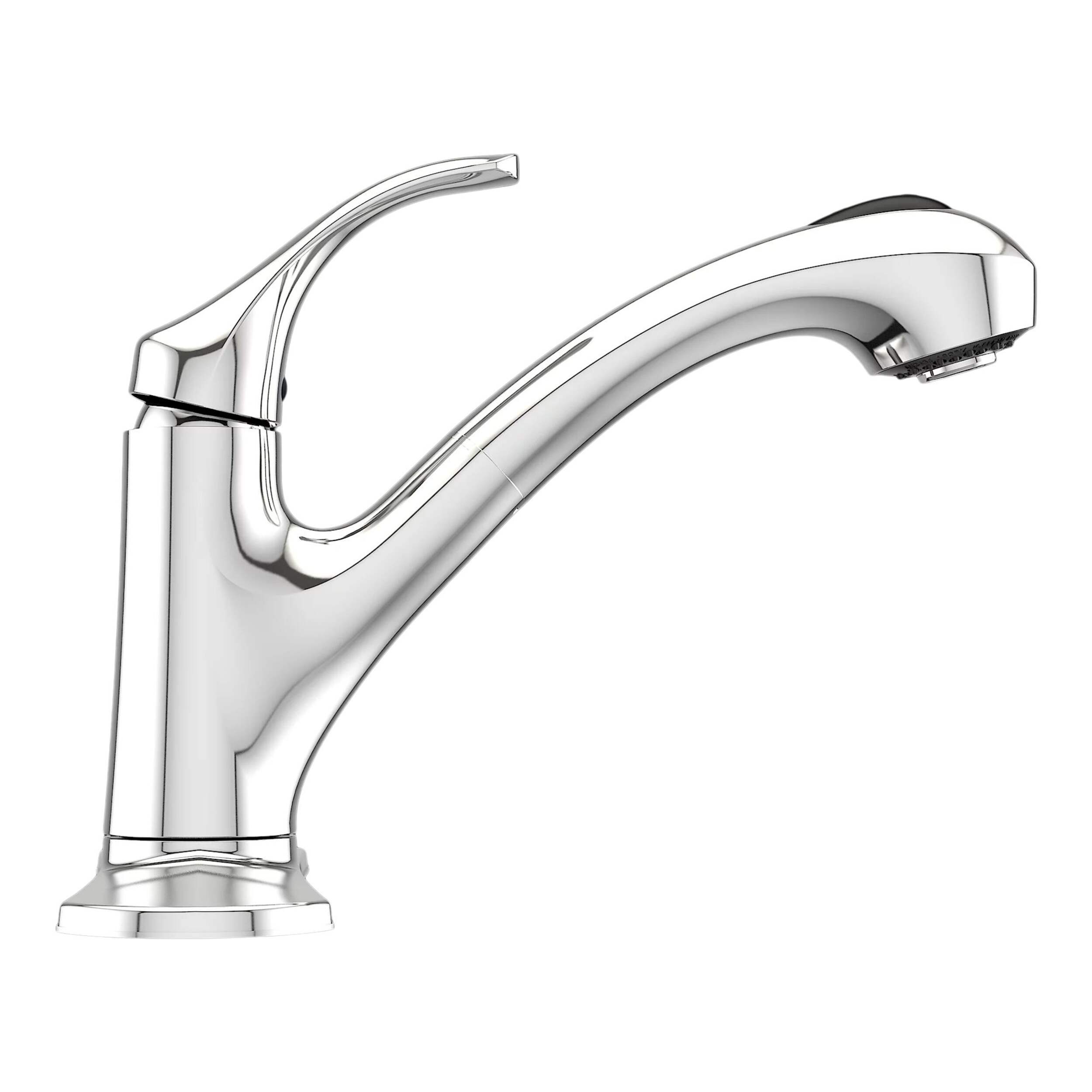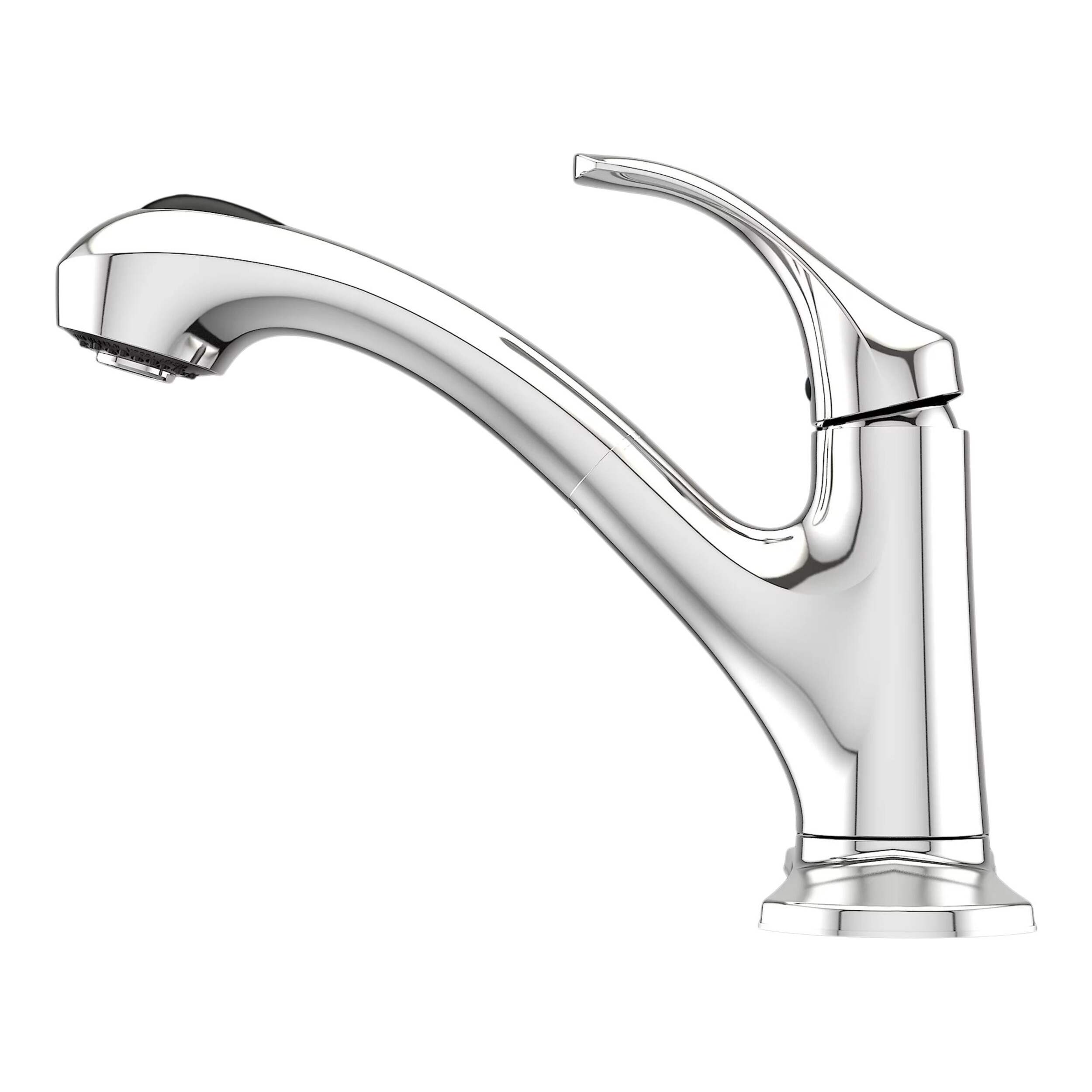 Add functionality to your kitchen with the streamlined look of this Pfister Shelton Single Handle Pull Out Kitchen Faucet. This high-quality single handle faucet brings a fresh, sophisticated style to any kitchen with its bold lines and clean, geometric form. With the extra convenience of a pull-out to make rinsing a breeze, this kitchen faucet is as functional as it is beautiful and installs easily with the included installation hardware and escutcheon plate.