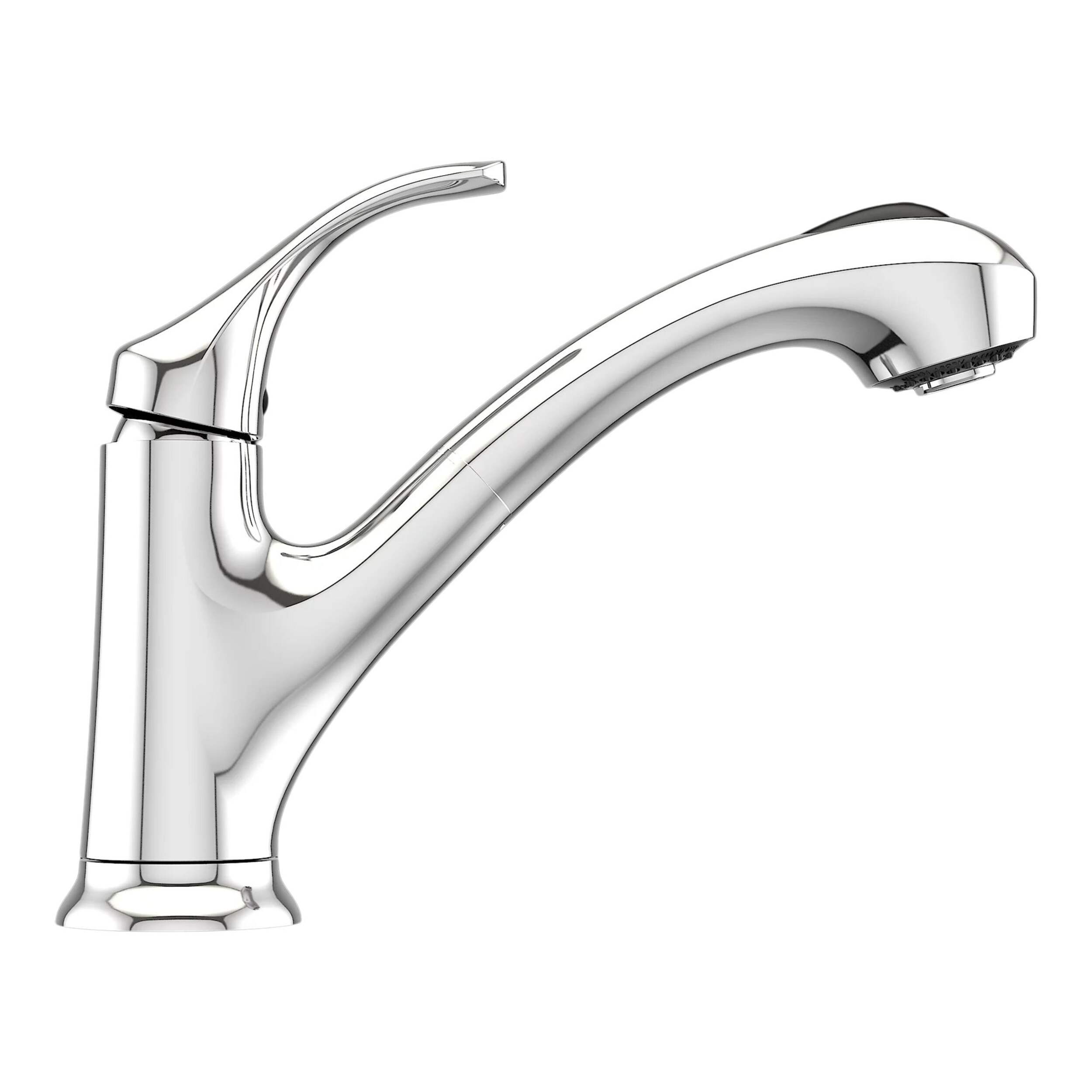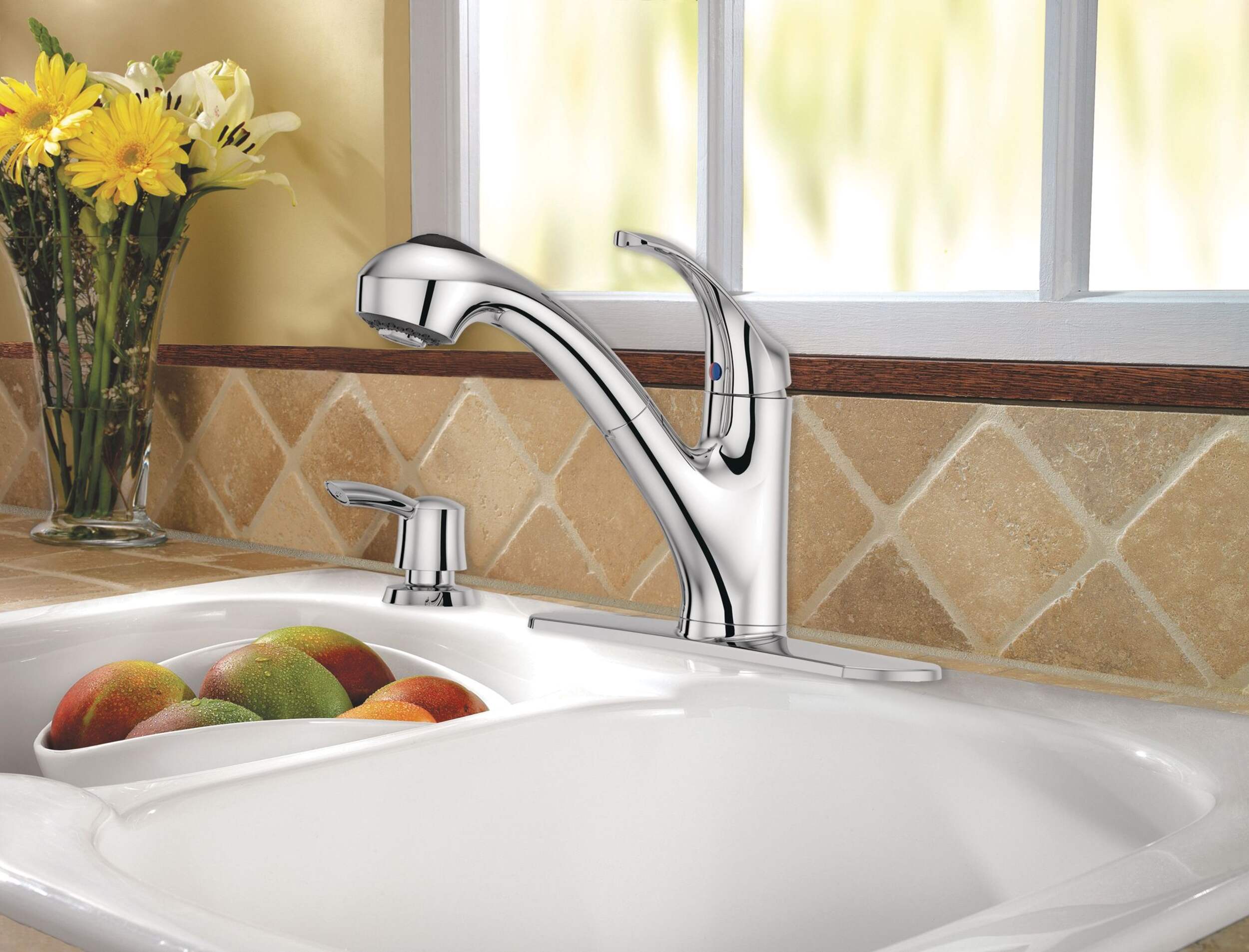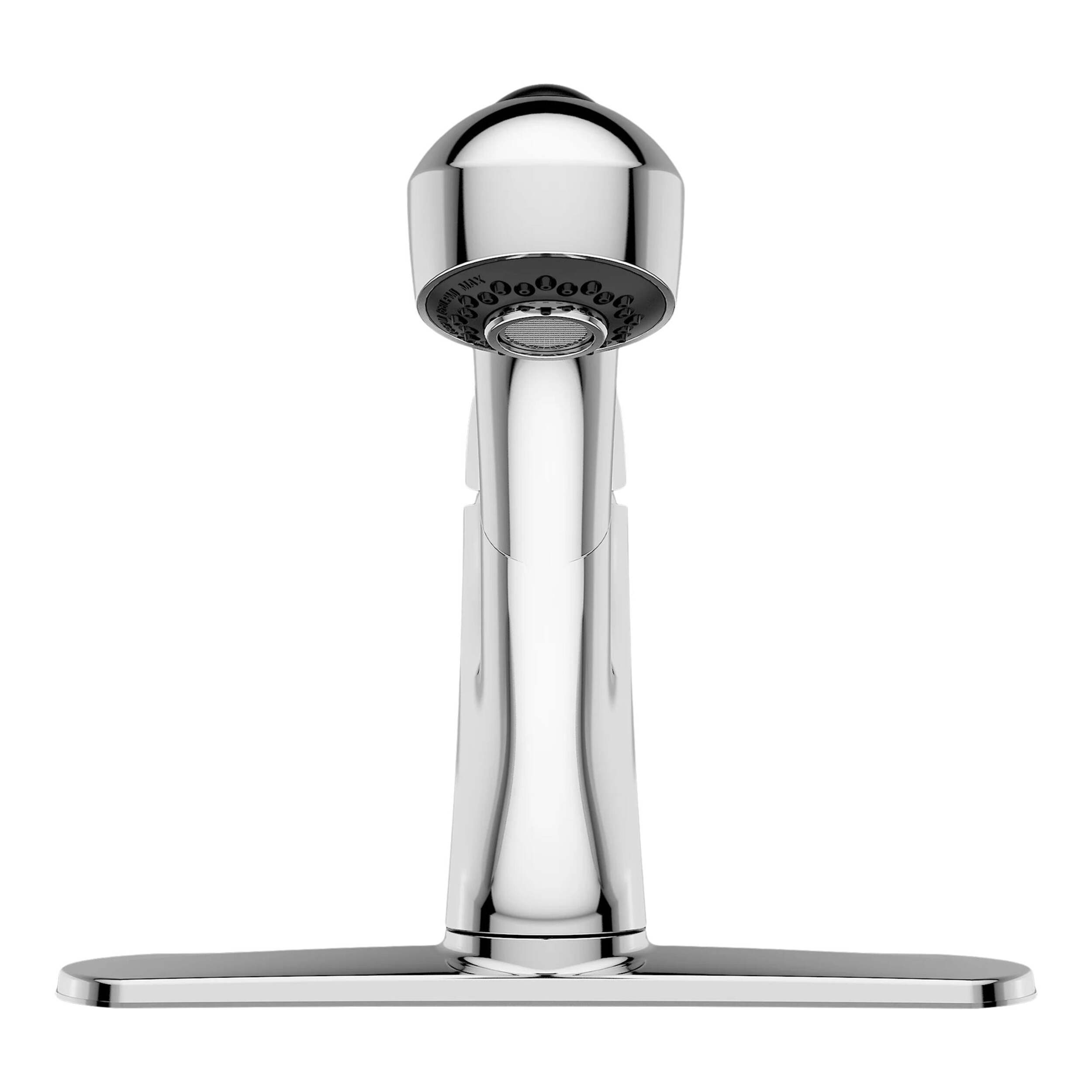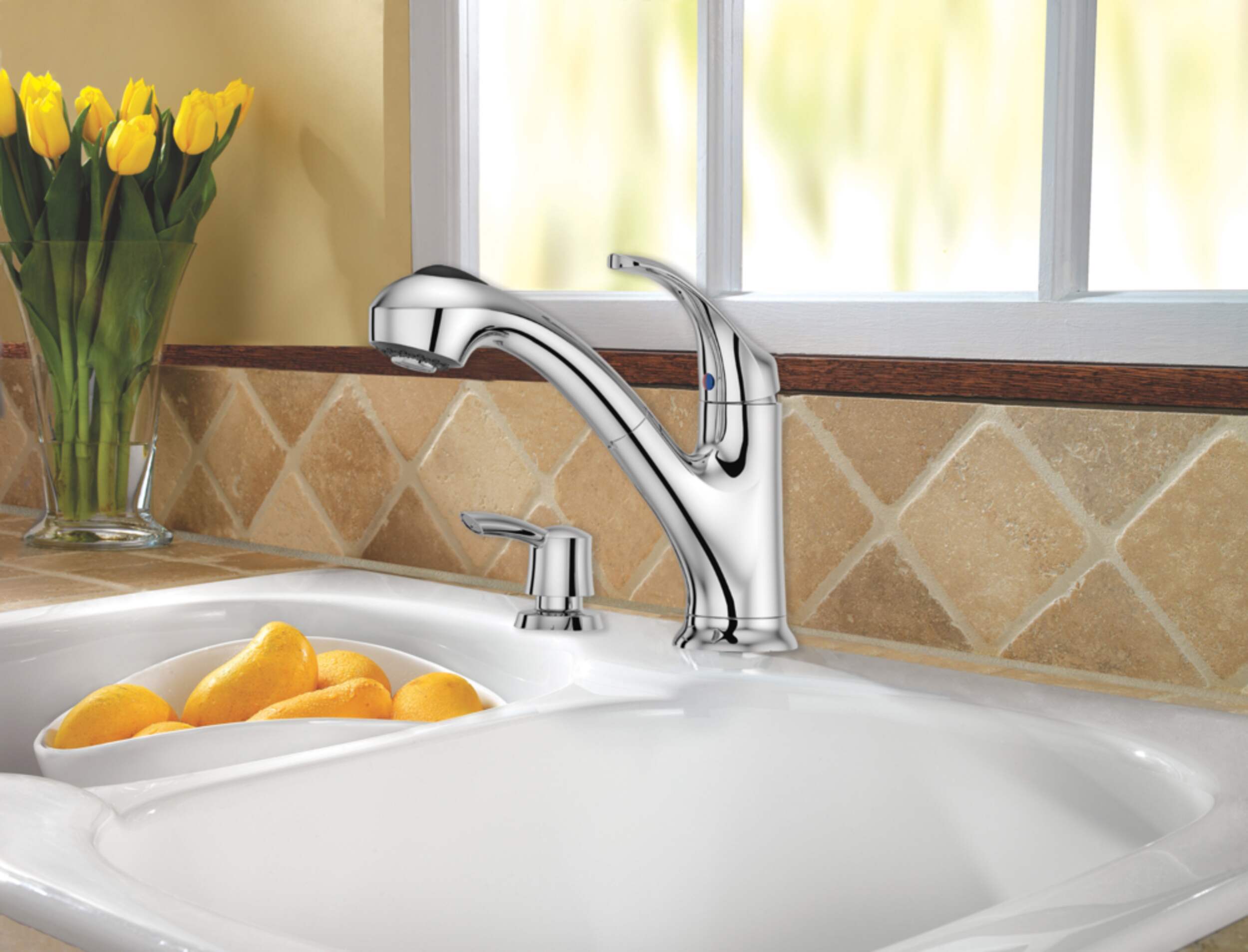 Add functionality to your kitchen with the streamlined look of this Pfister Shelton Single Handle Pull Out Kitchen Faucet. This high-quality single handle faucet brings a fresh, sophisticated style to any kitchen with its bold lines and clean, geometric form. With the extra convenience of a pull-out to make rinsing a breeze, this kitchen faucet is as functional as it is beautiful and installs easily with the included installation hardware and escutcheon plate.