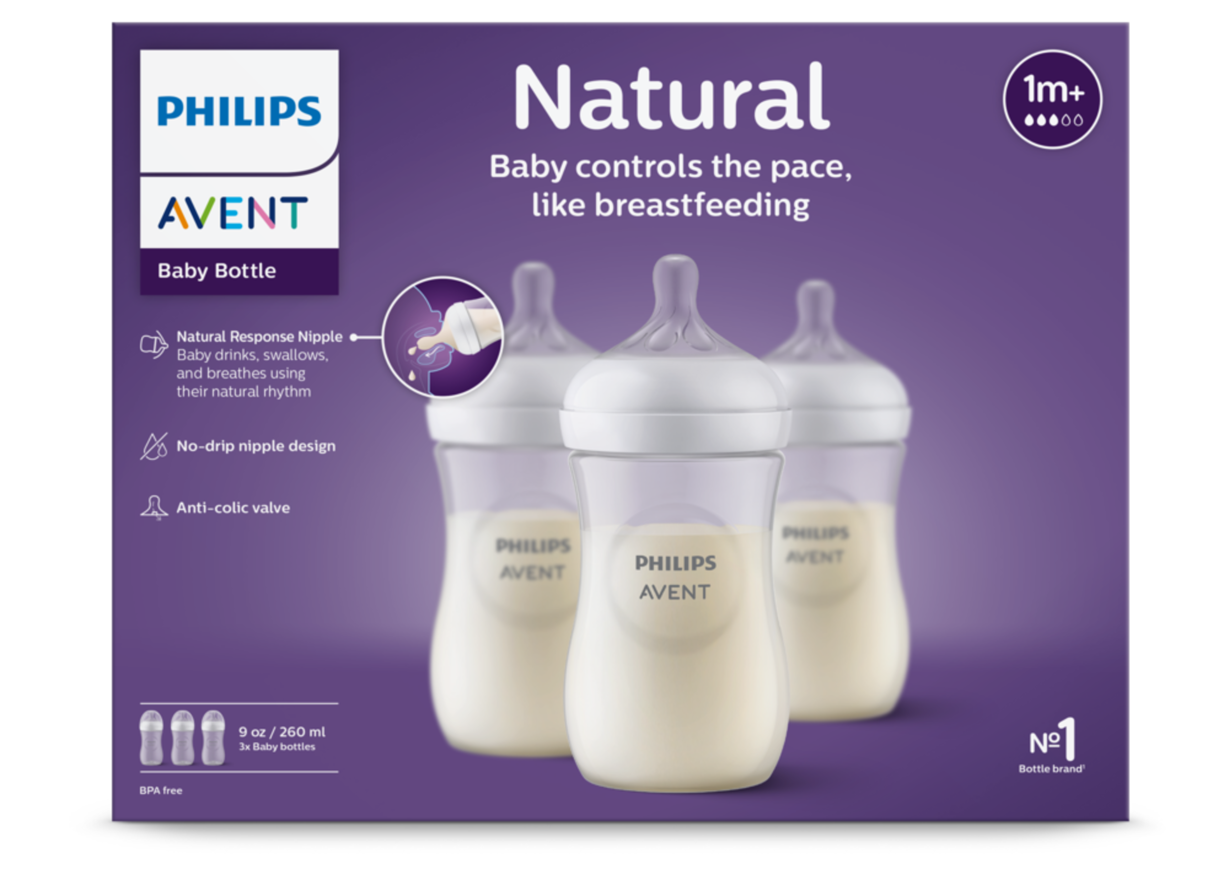 The Philips Avent SCY903/03 Natural Baby Bottle, 9-oz, 3-pk, provides the most natural breastfeeding experience when bottle feeding. The wide, breast-shaped nipple allows the baby to latch easily. With its natural response nipple, the baby controls the flow just like traditional breastfeeding.